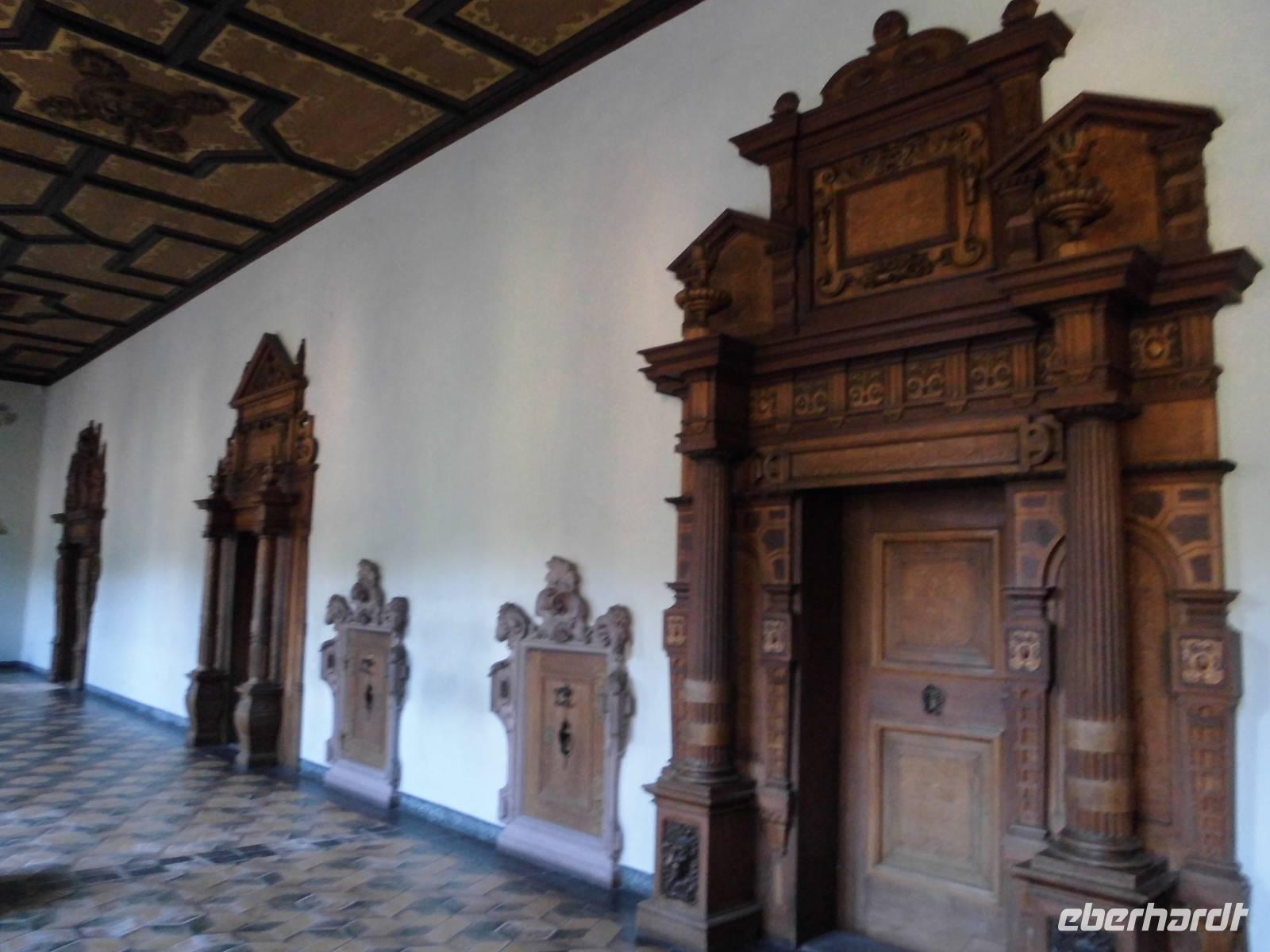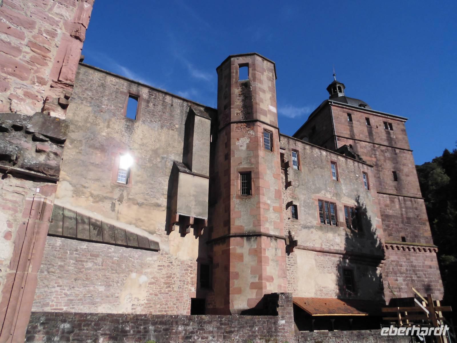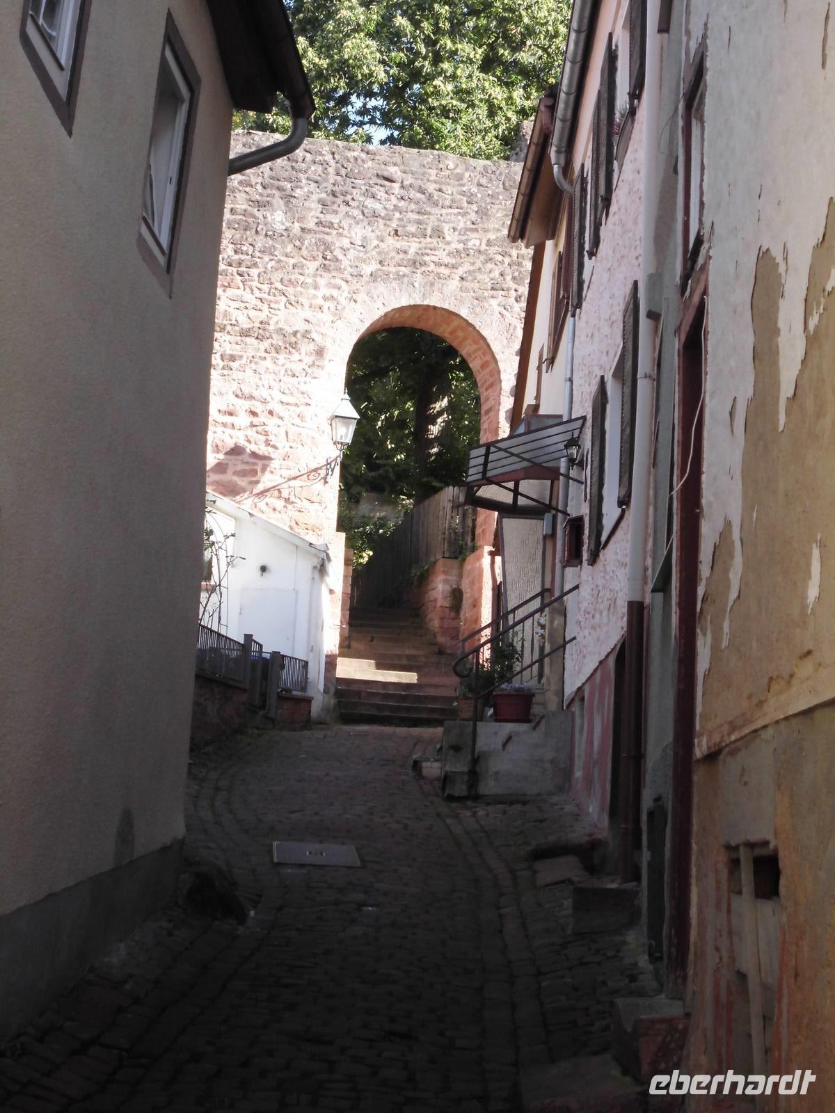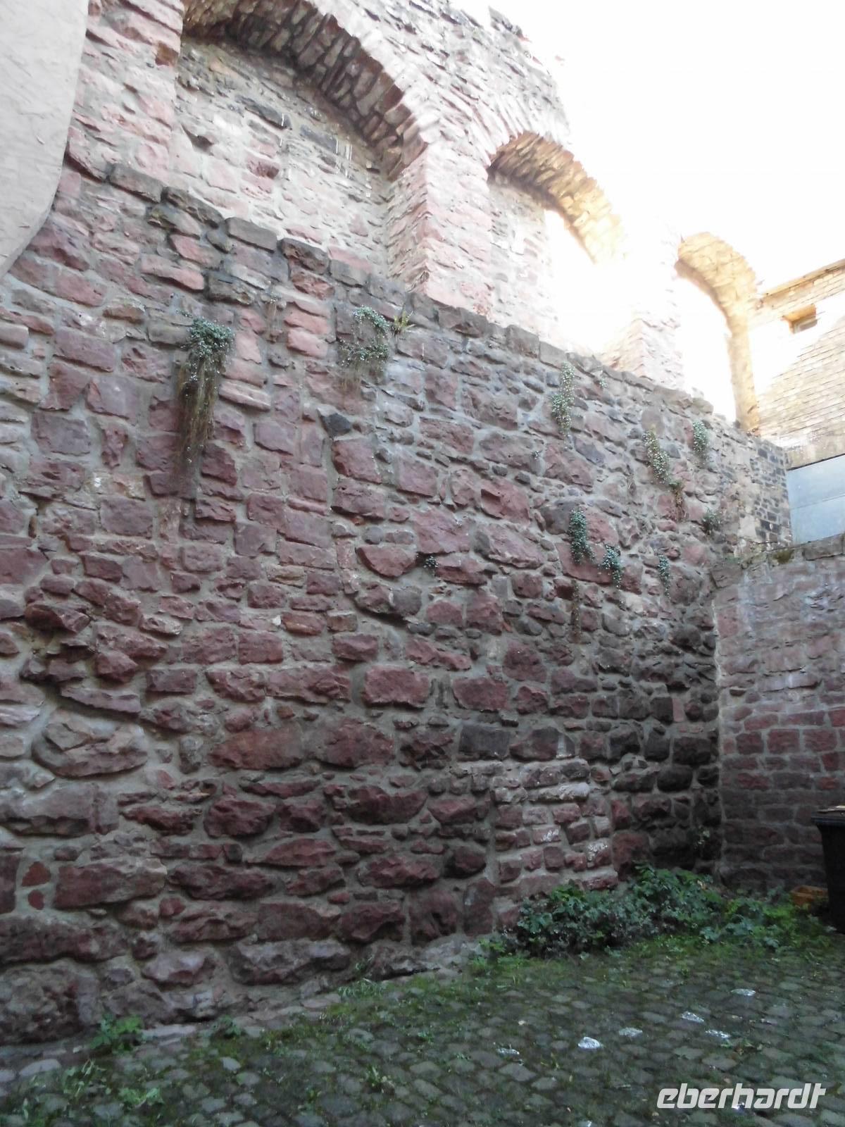 Die Stadtführer holen uns am Anleger ab. Es gibt eine „Sonntagsgruppe" die den leichteren Weg in die Unterstadt gehen und dort in eine der Kirchen gehen. Die evangelische Stiftskirche, die Dominikanerkirche oder in die Ritterstiftskirche die mit dem Kloster Bad Wimpfen geistiges Zentrum der Malteser ist. An Bad Wimpfen führt auch der Jacobsweg vorbei. Unser Stadtführer kommt im historischen Gewand eines Soldaten aus der Zeit des Bauernkrieges an. Mit seiner Hellebarde weißt er den Weg in die Oberstadt. Nun beginnt der Aufstieg! Nach den Treppen geht es über die Bahnschienen und dann nochmals einen steilen Weg, allerdings ohne Stufen hinauf zur größten Kaiserpfalz nördlich der Alpen. Es ist geschafft, wir auch! Erst mal verschnaufen und dann genießen wir die tolle Aussicht auf den Neckar, die Weinberge und die im Tal gelegenen kleinen Ortschaften. Wir lauschen dem Stadtführer der uns mit seinem schwäbischen Dialekt die geschichtsträchtige Vergangenheit von Wimpfen erzählt. Die staufischen Reisekaiser waren mit ihrem Hofstaat immer wieder in der Feste. Kaiser Friedrich der I. Barbarossa ließ sie zur trutzig-wehrhaften Pfalz ausbauen. Die heute noch erhaltenen Arkaden zeugen von der Schönheit der Feste. Hier wurde Recht gesprochen, getagt, regiert und sich nicht selten liebreizender „Minne" hingegeben.
