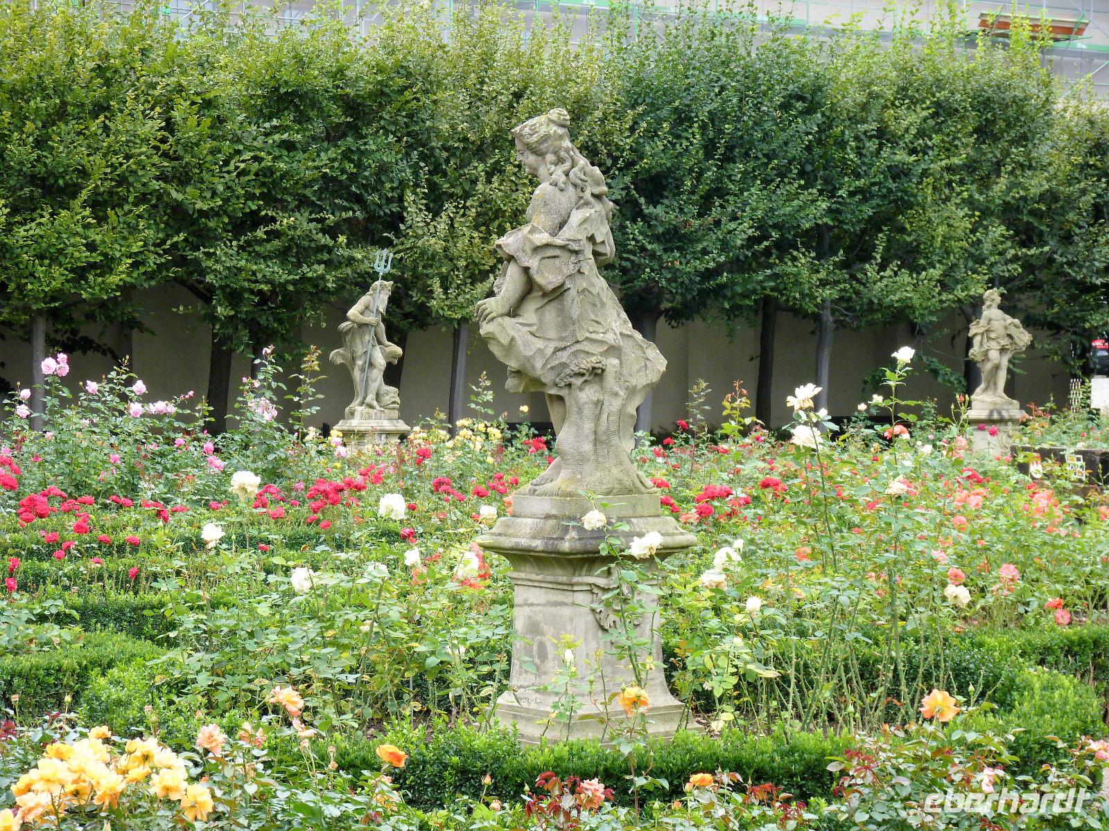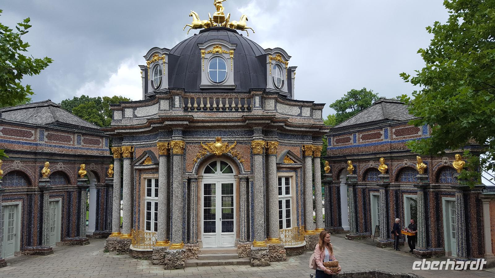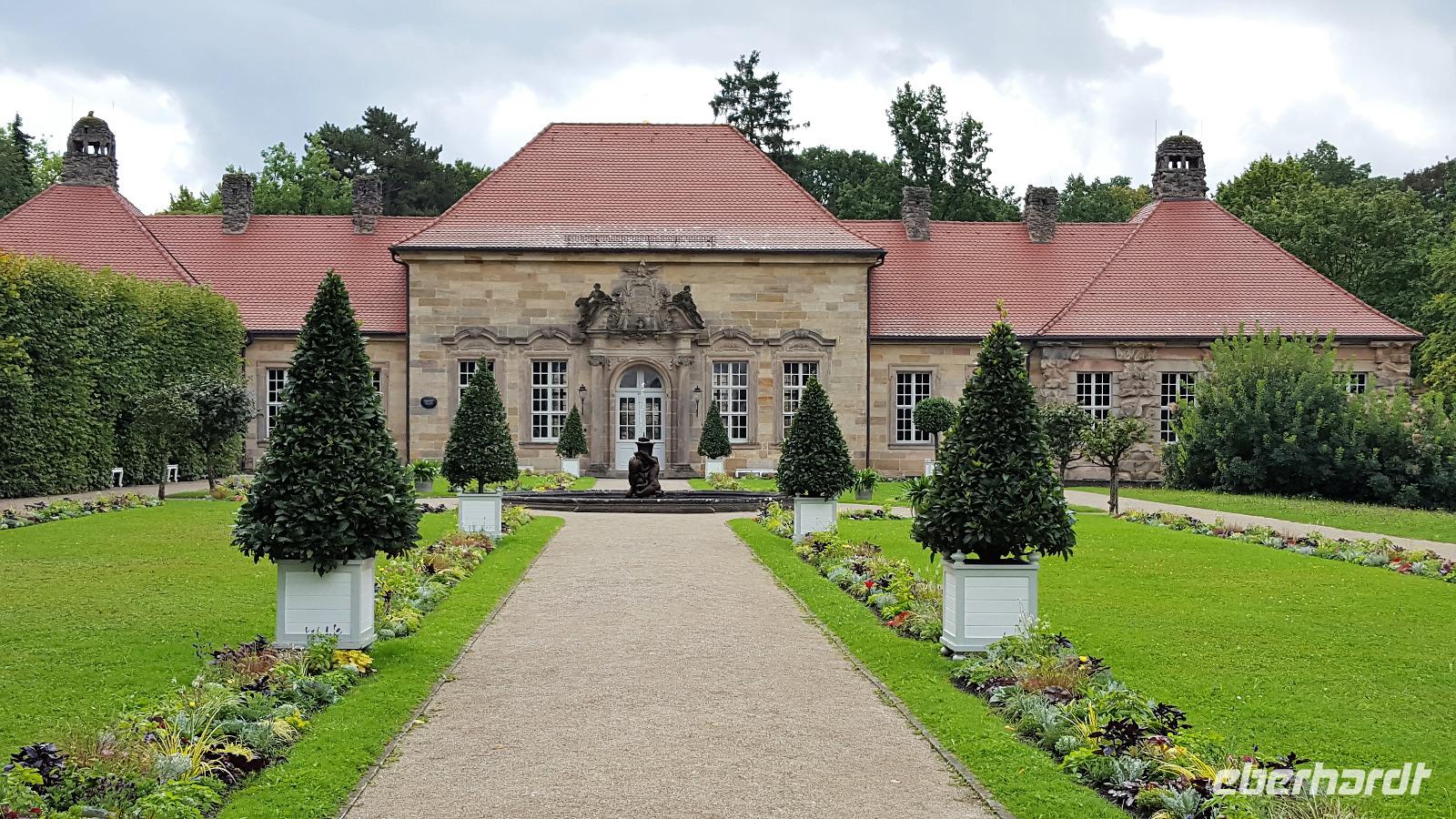 Nach dem Mittagessen trafen wir uns mit unseren zwei Gästeführern Frau Kastner und Frau Langner in Bayreuth an der Parkanlage „Eremitage". Ein Regenschauer unterbrach den Spaziergang kurz durch die Historische Anlage. Markgraf Georg Wilhelm ließ 1715 unweit der Residenzstadt Bayreuth das Alte Schloss Eremitage als Mittelpunkt einer höfischen Einsiedelei errichten. Im Jahr seines Regierungsantritts 1735 machte Markgraf Friedrich das Terrain seiner Gattin Wilhelmine zum Geschenk. Von der Einzigartigkeit der Anlage fasziniert, begann die Markgräfin sofort mit umfangreichen Erweiterungsmaßnahmen.