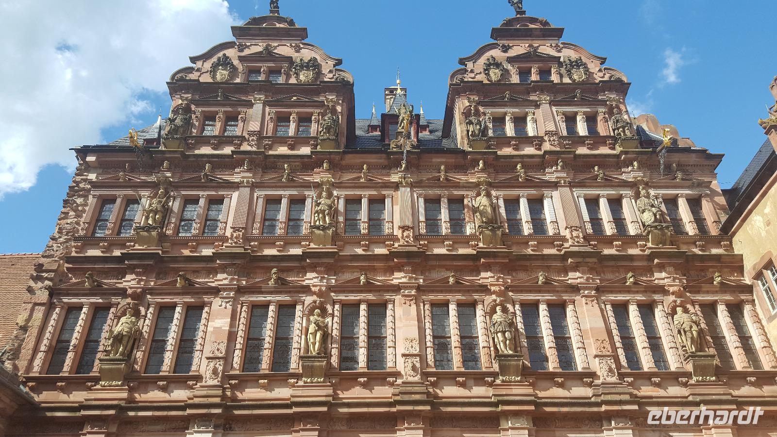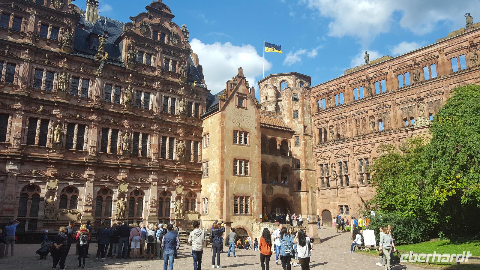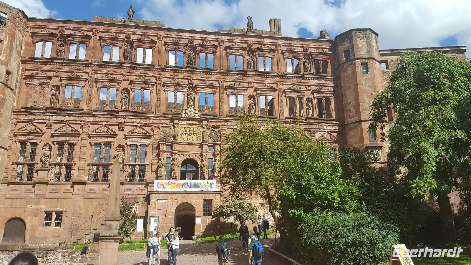 Mit drei Bussen geht auf einer ziemlich engen Straße zum Heidelberger Schloss hinauf. Dort erwarten uns die „Schlossgeister" und führen uns durch die wechselvolle Geschichte des Schlosses. Die im 13.Jhd. begann, mehrfach erweitert und vom 14 Jhd. bis 1720 Residenz der Pfalzgrafen war. 1688-1689 von den Franzosen erobert und zerstört, um dann als Ruine von den Romantikern wieder entdeckt zu werden. Das berühmte Holzfass, in dem nie Wein war, das Apothekenmuseum und die Terrasse mit dem Kavalierssprung sehen wir uns in der Freizeit an.