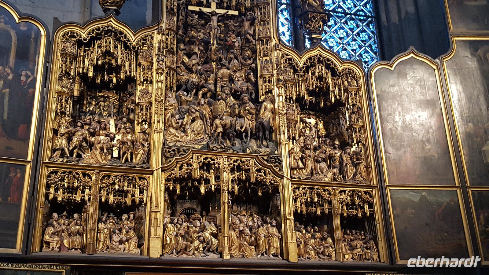 Auf dem Weg hinunter genossen wir den Panoramablick über die Stadt. Unterwegs lernten wir das Dürerhaus + Bronzeplastik „Dürerhase", das Nassauer Haus, St. Sebaldus mit dem Nagelkreuz und dem Schrein, Rathaus Wolff'scher Bau, den Markt (Chriskindlmarkt) mit dem Schönen Brunnen und dem Glücksring, dem Heiligen Geist Haus und dem Henkersteg mit Weinstadel über die Pegnitz. Viel zu knapp ist die Zeit und wir werden sicher noch einmal hierherkommen müssen. Während des Mittagessens legte die MS Verdi ab und nahm Fahrt in Richtung Bamberg auf.