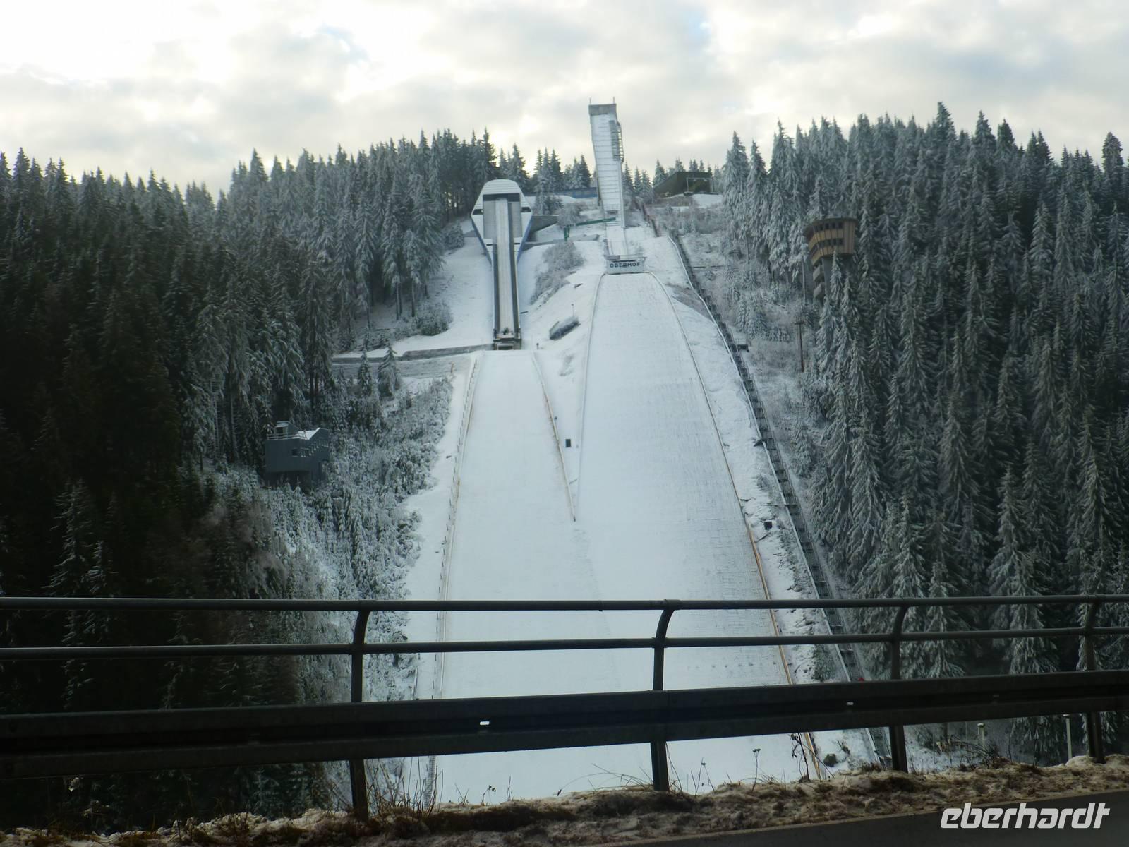 Beim Aufstehen blickt man aus dem Fenster auf die dick reifbedeckten Bäume des am Waldrand liegenden Hauses und ist sofort wieder in bester Winterstimmung. So kann es dann nach dem Frühstück wieder auf Tour gehen. Zunächst sehen wir die zahlreichen Sportanlagen Oberhofs: die Bobbahn, Skihalle, die DKB-Arena (vielen von uns noch als Stadion am Grenzadler bekannt) und natürlich die bekannten Schanzen im Kanzlergrund.