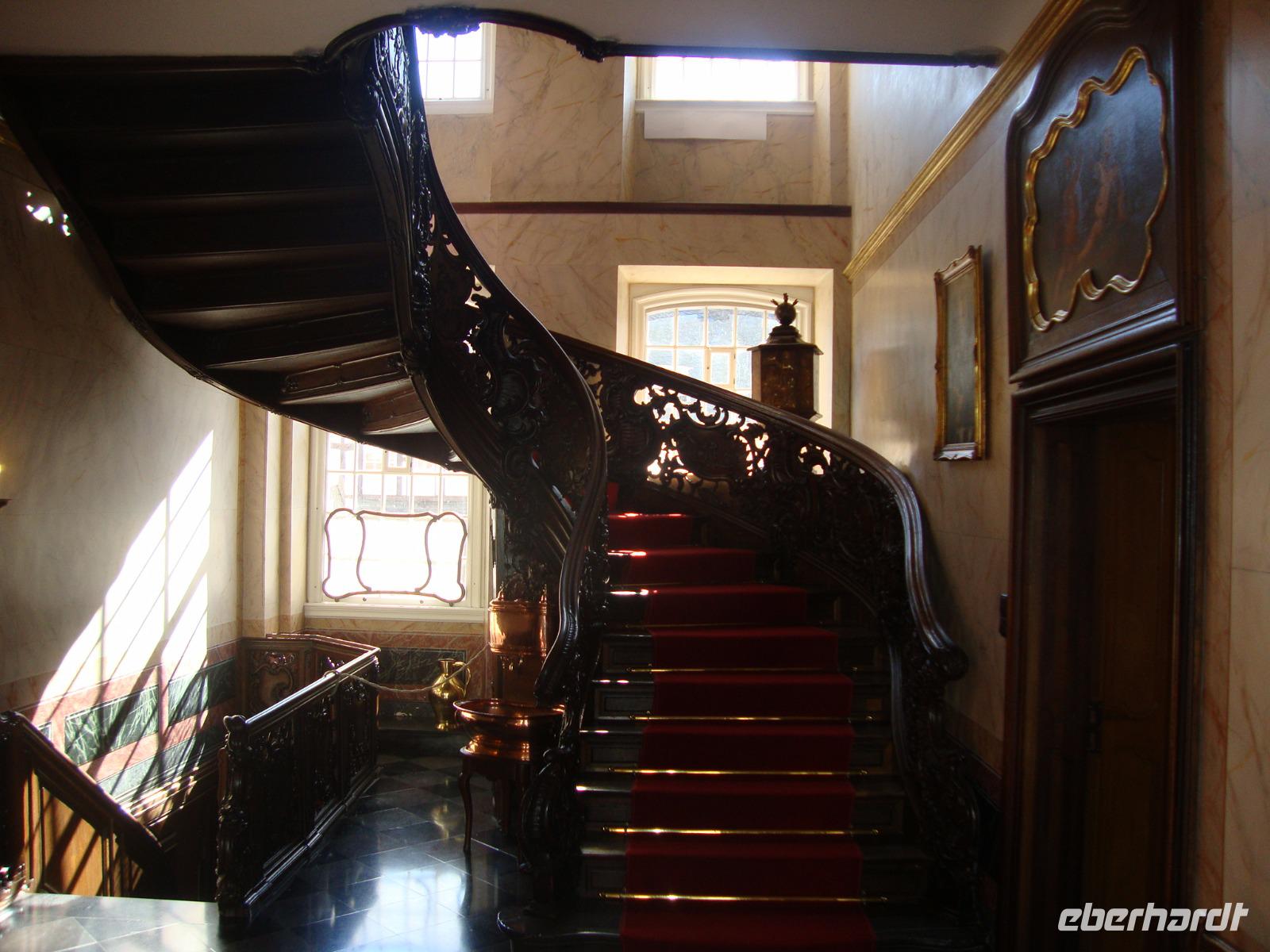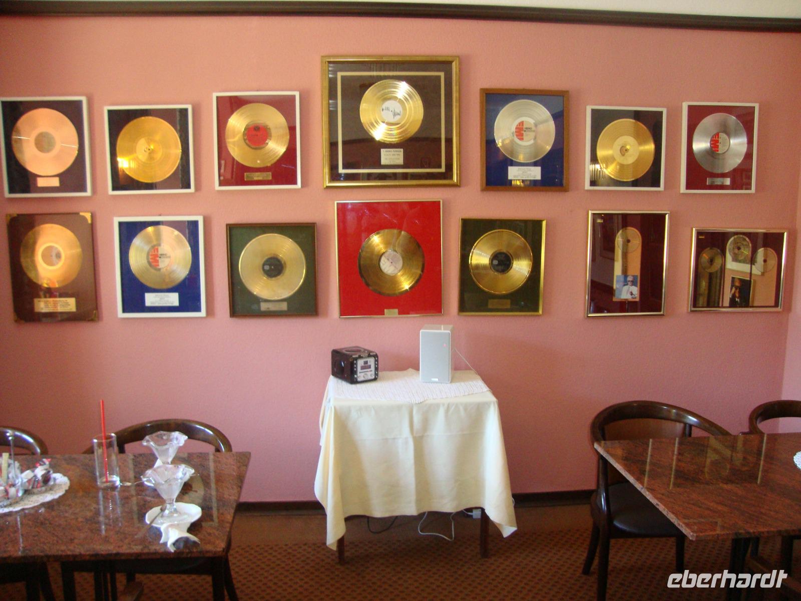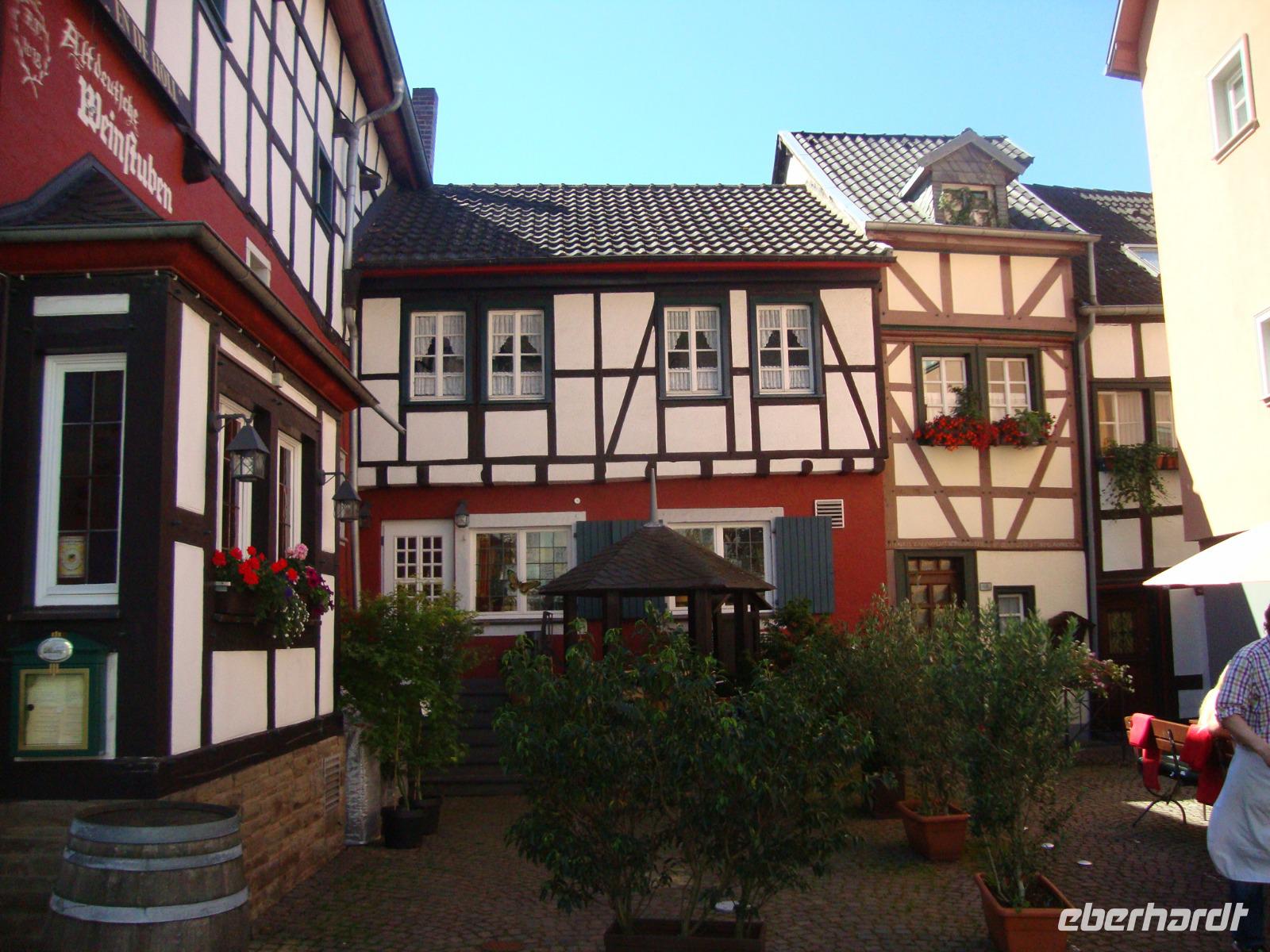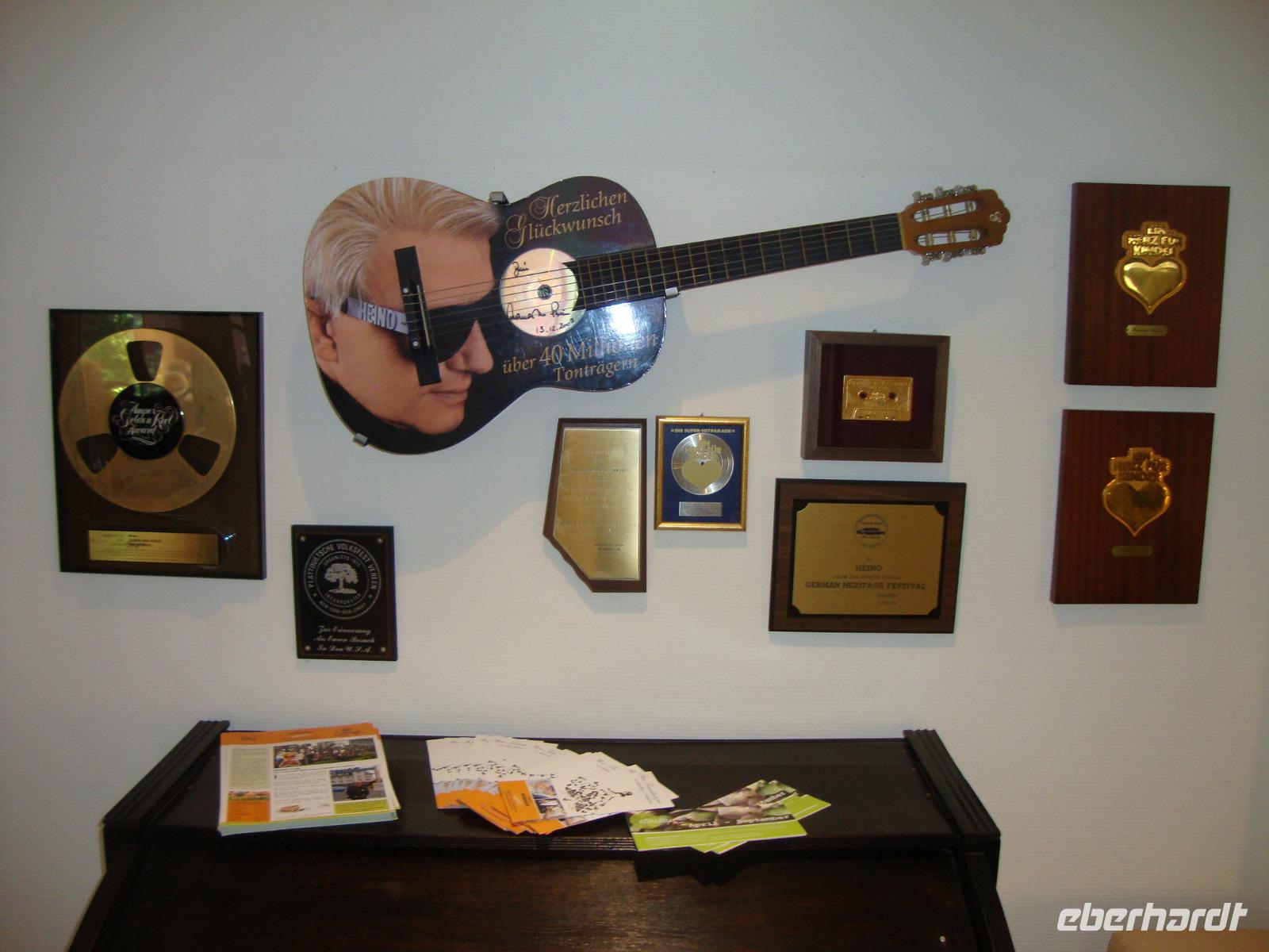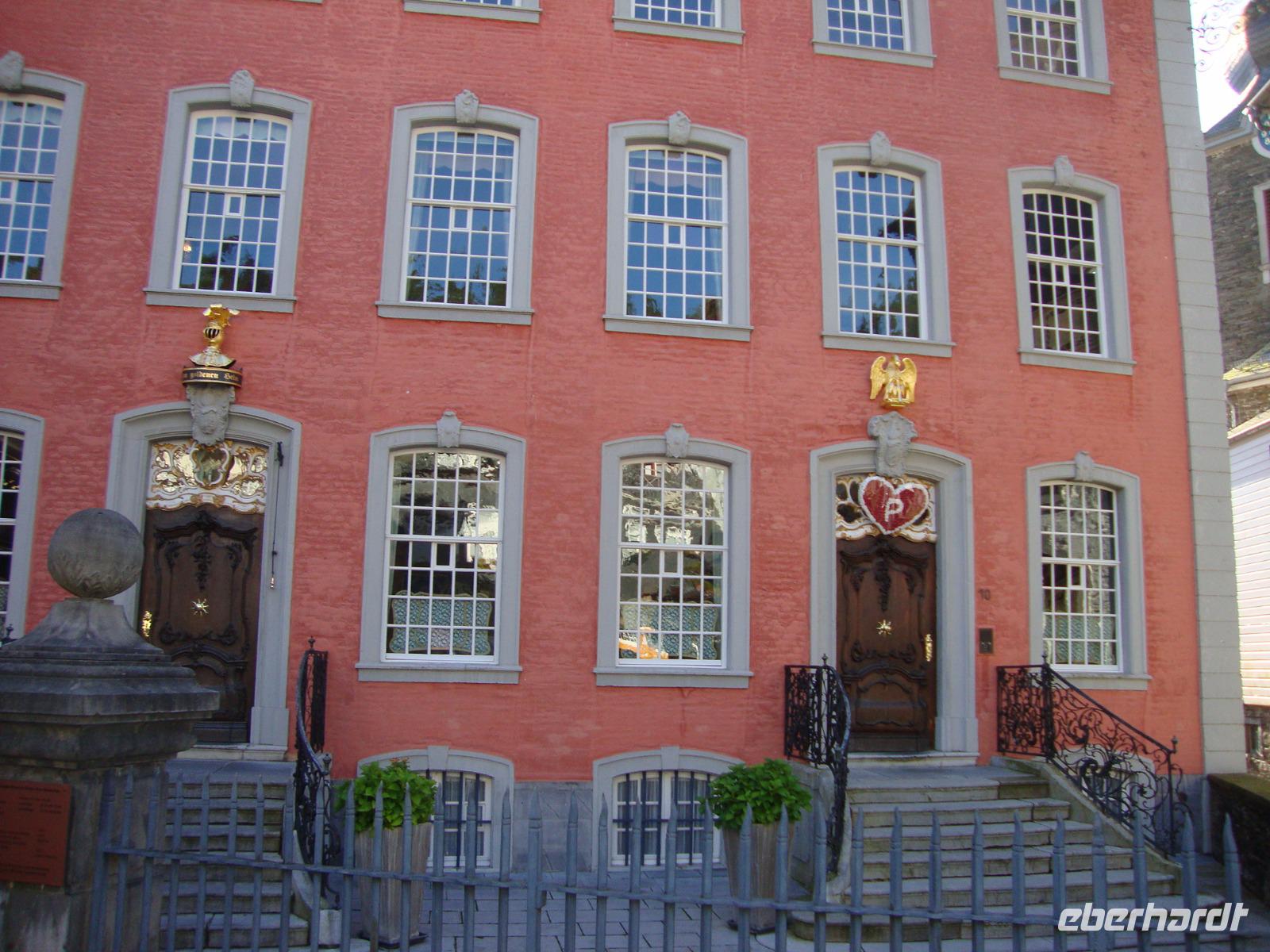Durch Monschau sollte man gemächlich bummeln und die Augen geöffnet halten für überraschende architektonische Details. Denn die Altstadt ist ein harmonisches Ensemble aus stattlichen Fachwerk-und Bürgerhäusern, die sie der Blüte der Textilindustrie (16. bis 18. Jh.) verdanken. das Rote Haus ist ein besonderes Schmuckstück, welches wir bei einer interessanten Führung kennenlernten und dabei nachvollziehen konnten, wie sich das leben in der damaligen Zeit abspielte. Der Tuchmacher Scheibler war sehr vemögend und lies sich das Wohnhaus mit innenliegender, freitragender Wendeltreppe erbauen. Wir konnten auch anschließend das alte Flair der Kleinstadt an der Rur genießen und das schon bei sehr hohen Temperaturen. Am Nachmittag besuchten wir Bad Münstereifel, die Kuranlagen für die Kneipp Kuren liegen oberhalb der Stadt und ganz in der Nähe befindet sich das Kurcafe', mit "Heino's Kaffee". Wir hatten uns zu Kaffee und Kuchen angemeldet, Nusstorte nach Heino's Rezept und konnten anschließend die vielen Auszeichnungen und Ehrungen anschauen. Leider war Heino nicht anwesend, aber eine Autogrammkarte gab es für jeden. der mittelalterliche Stadtkern Bad Münstereifels ist vollständig von einer Mauer mit 18 Wehrtürmen und vier Toren umgeben. Die Erft fließt mitten durch den Ort, der sich um die mächtige Stiftskirche "St.Chrysanthus und Daria" aus dem 11.Jh. herum gruppiert. Sehenswert sind auch das gotische Rathaus mit Spitzbögen (!3.Jh.) sowie das Romanische Haus mit den charakteristischen Fensteröffnungen und Säulen aus dem 12.Jh.; es gilt als ältestes Privathaus des Rheinlands. Bei Temperaturen über 30°C konnten wir aber nur gemächlich unseren Spaziergang mit vielen Schattenplätzen gestalten. Als wir zurück nach Einruhr fuhren hatte unser Chauffeur Ingo die Klimaanlage im Bus auf angenehme 23°C gebracht.