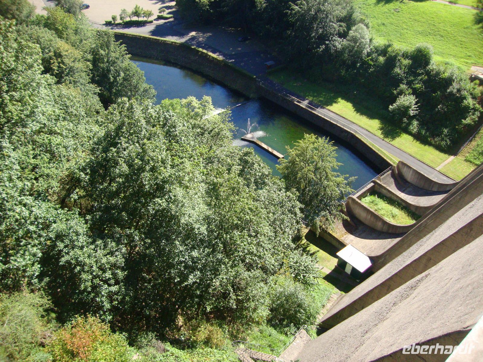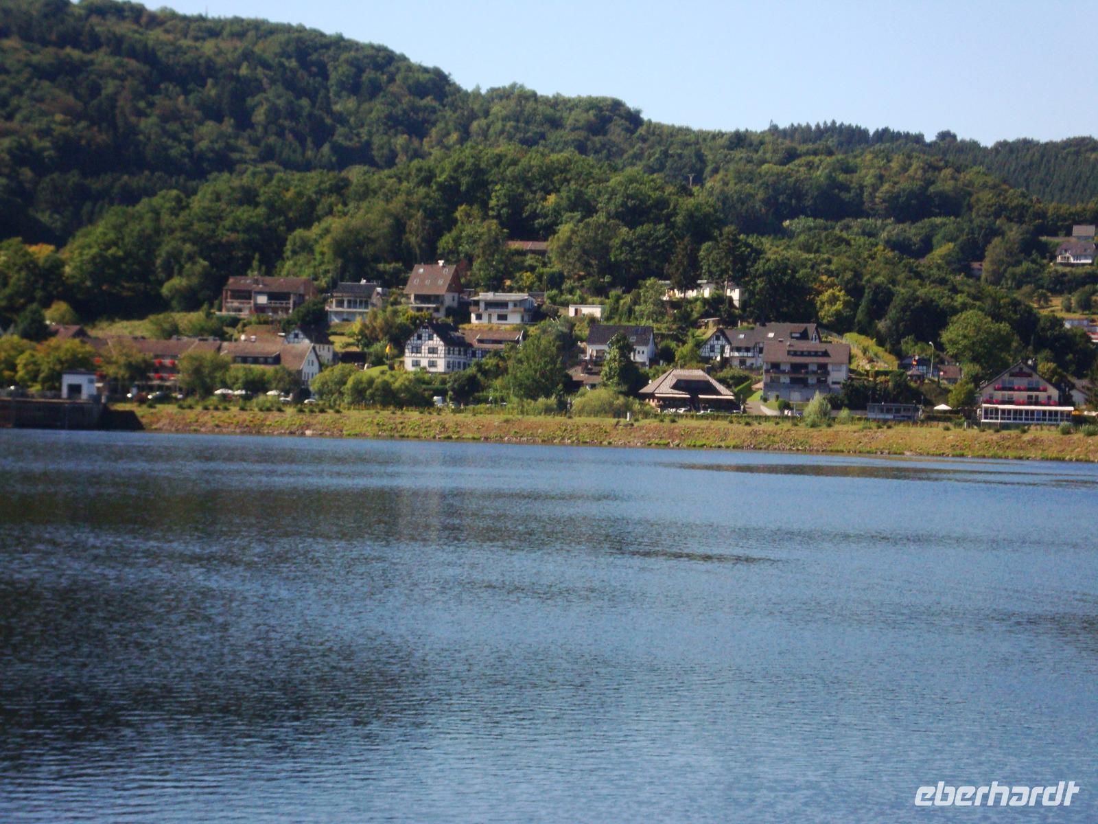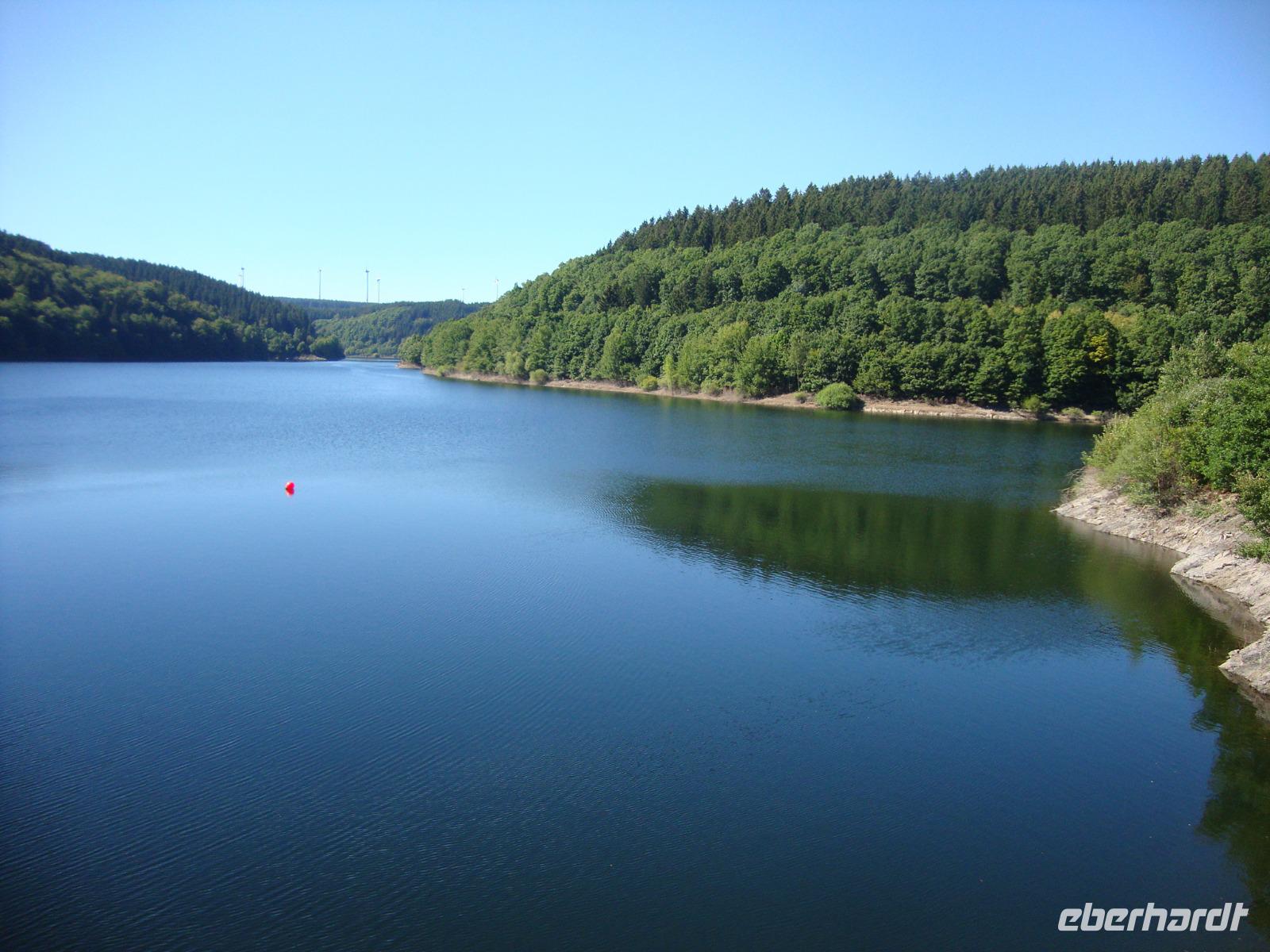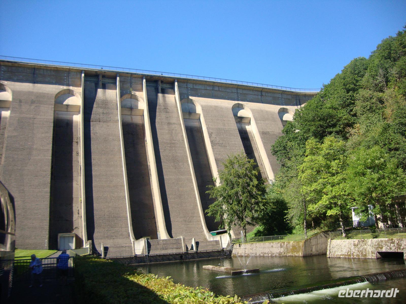 Am Nachmittag waren wir in Gerolstein, in der Mineralwasser - Fabrik. Hier verlassen jeden Tag rund 3,5 Millionen Flaschen das Werk, damit ist dieses der größte Produzent in Deutschland. Bei einer Werksführung sahen wir einen Film und konnten danach die zahlreichen Arten und Sorten der Herstellung verkosten. Anschließend besuchten wir von der Besucher - Galerie aus die Herstellung. Unsere Begleiterin erklärte uns auch den Betriebsablauf und nannte die Zahl der Beschäftigten, es wird im 3 - Schicht - System gearbeitet. Der hiesige Mineralbrunnen ist das namhafteste Beispiel für die zahlreichen Mineralquellen, die in der Eifel aus dem vulkanischen Boden sprudeln. Grundwasser vermischt sich in den Erdspalten mit den verbliebenen Resten von Kohlensäure und löst verschiedene Mineralien aus dem Gestein, bevor es an die Oberfläche dringt. Zum Abschluß unserer Tagestour in die Südeifel, statteten wir der Oleftalsperre in Hellenthal einen Besuch ab. Zuerst bestaunten wir die mächtige Staumauer, um danach auf dieser einen Rundgang zu unternehmen. Hier wird man wirklich auf die Schönheiten der Natur, welche die Eifel zu bieten hat aufmerksam. Die Talsperre versorgt u.a. die Großstadt Aachen mit Trinkwasser, deshalb ist auch eine Nutzung zur Freizeit- gestaltung nicht erlaubt. So rundeten wir unsere Reise in das "Grüne Herz" Europas ab.