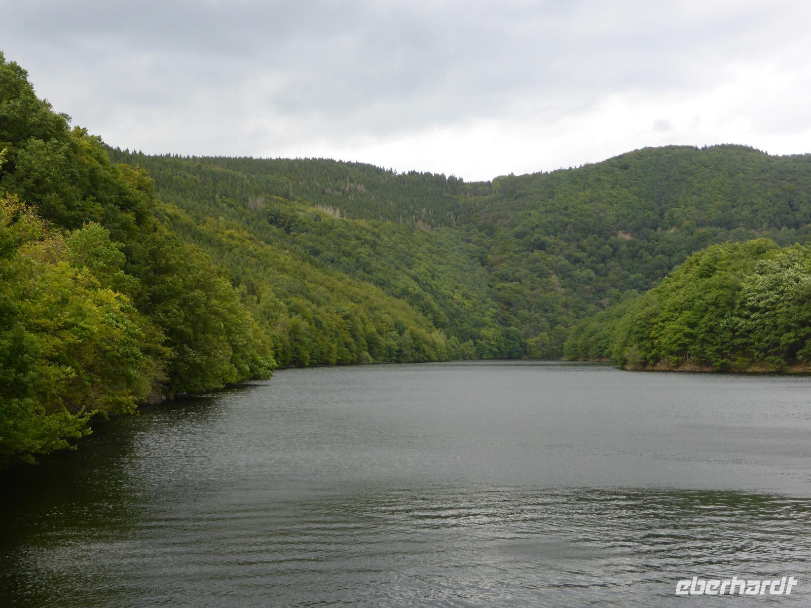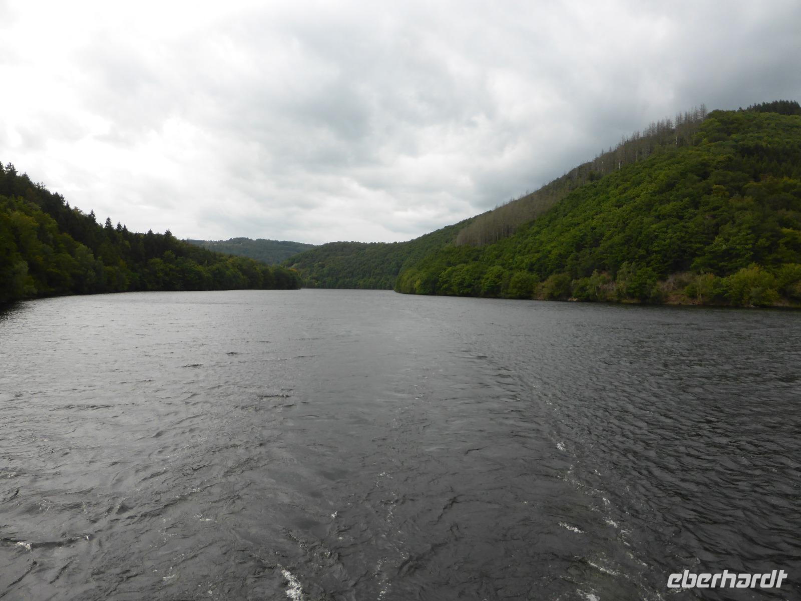 Der erste Halt auf der heutigen Tour gilt der gewaltigen, in Deutschland auf Grund ihrer Pfeilerzellenbauweise einmaligen Staumauer der Oleftalsperre. Staunend stehen wir davor ...