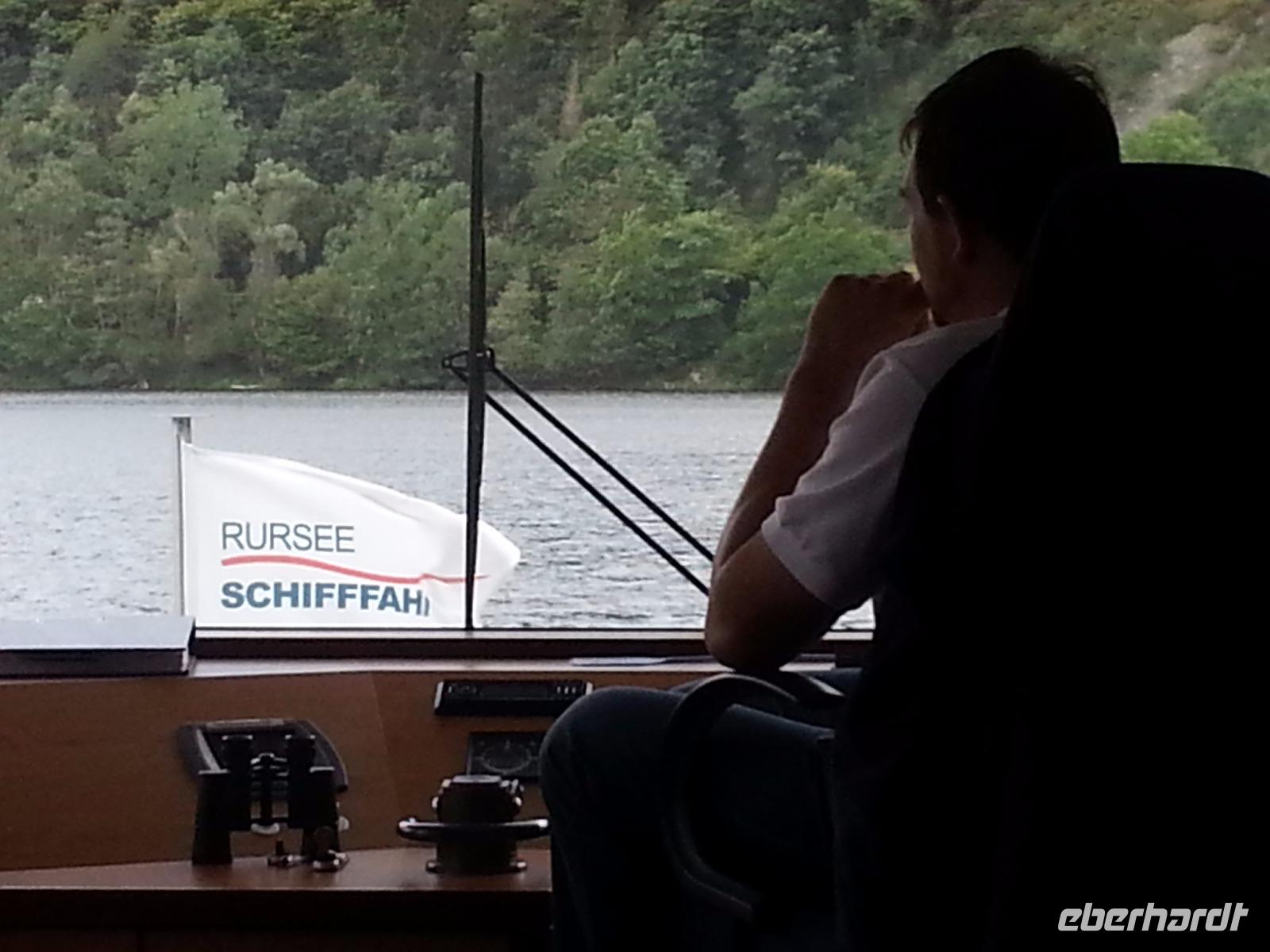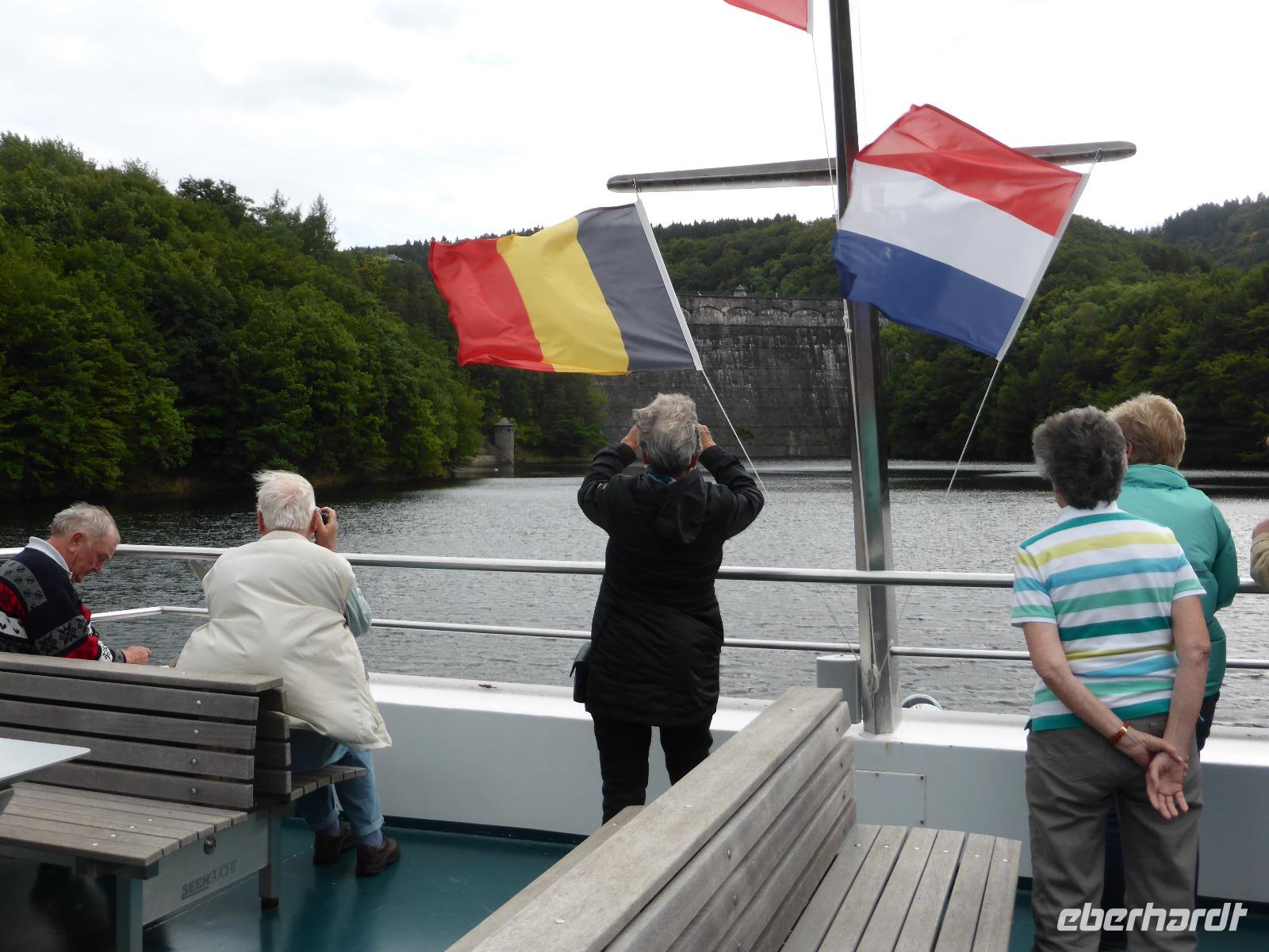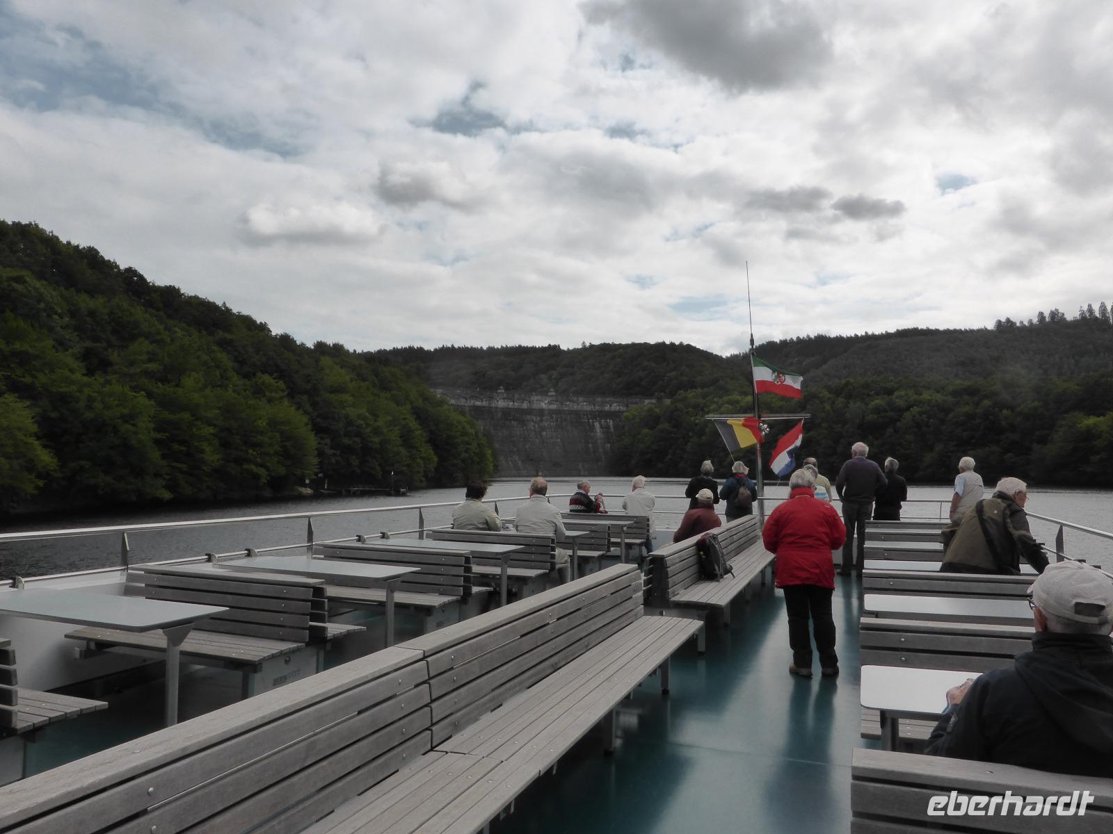 Am frühen Nachmittag fahren wir zurück nach Einruhr und gewissermaßen direkt auf unser Schiff, welches nahe beim Hotel vor Anker liegt. Wir erleben eine Schifffahrt der besonderen, der idyllischen Art auf dem Obersee, welcher zur Schwammenaueltalsperre gehört. An der Urftseestaumauer, der einzigen runden Staumauer Deutschlands kehrt das Schiff um. Es geht zurück zum Ausgangspunkt, die Gäste genießen bei Kaffee oder Wein die Ausblicke auf die bewaldeten Hänge, weidende Kühe , herbstliche Wiesen... Diese Stunden auf dem Wasser wirken sehr beruhigend und tun gut. In dieser Stimmung treffen wir uns am Abend im Hotel zum Abendessen wieder.