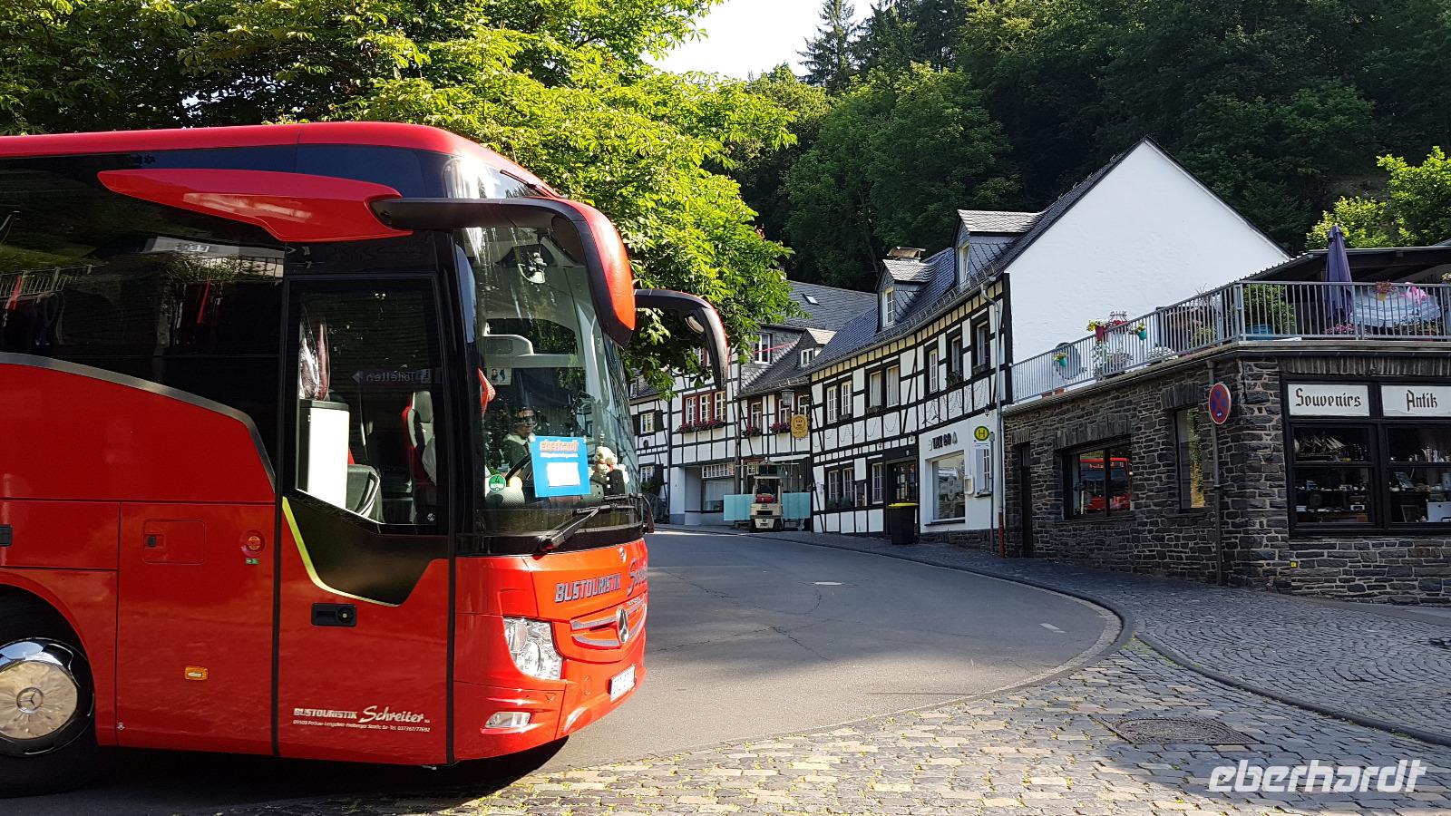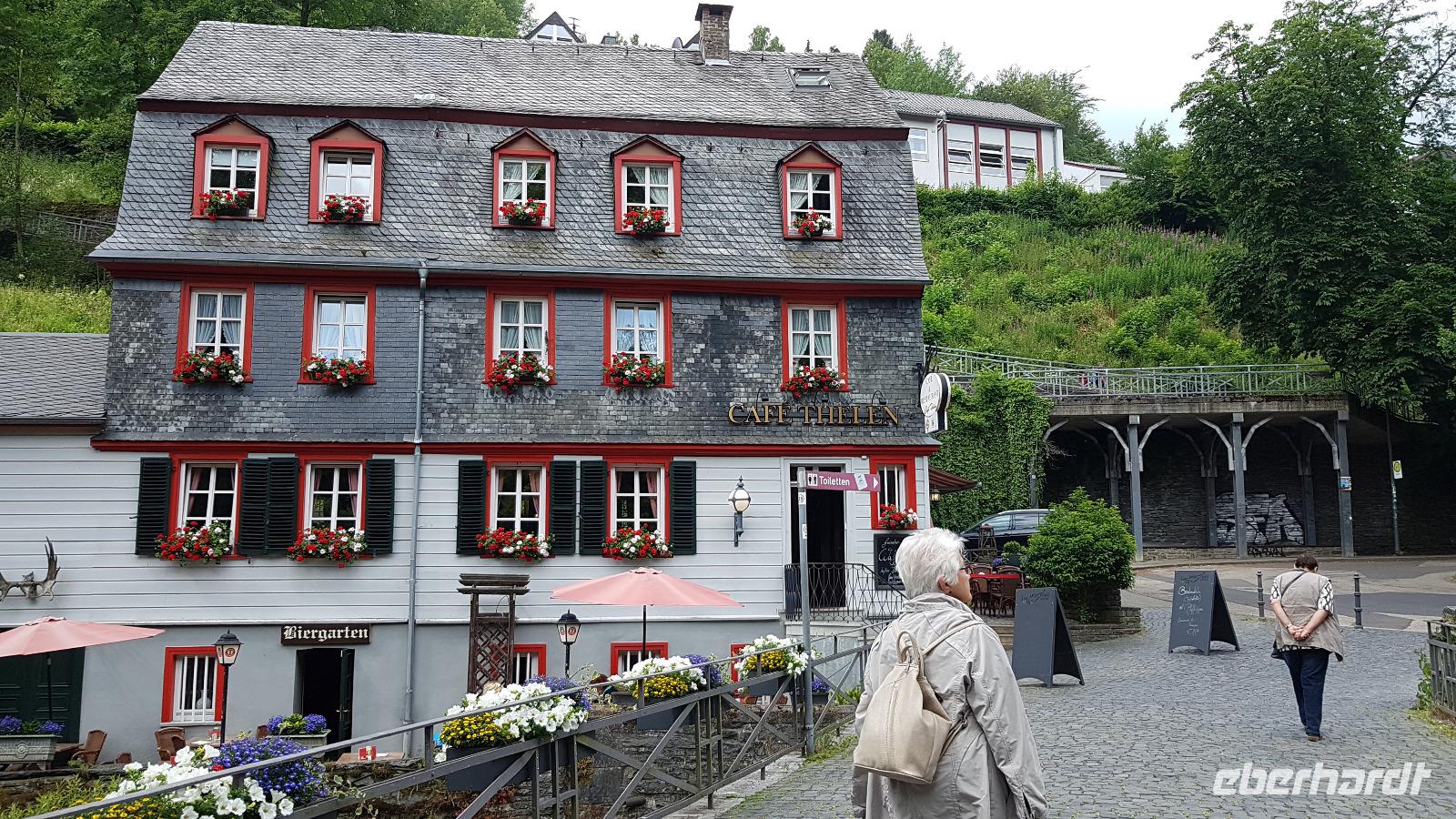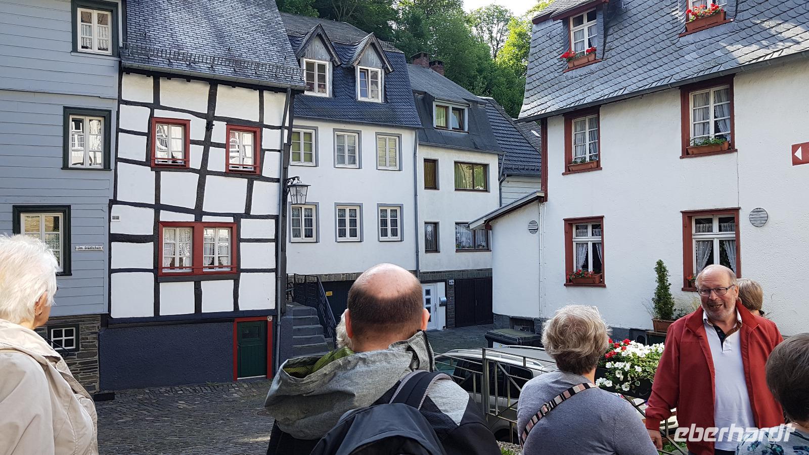 Heute treffen wir uns nach dem Frühstück mit Bodo- unserem örtlichen Reiseleiter. Mit ihm werden wir eine Rundfahrt durch die nördliche Eifel unternehmen. Den Beginn macht Monschau. Hier könnn wir das berühmte "Rote Haus" besuchen. Eine kleine Einführung und dann kann sich jeder individuell umsehen. Ein wunderschöner Spaziergang durch die Altstadt schloss sich an und dann fuhr uns Marcel nach Höfen zum Nationalparktor. Im Besucherzentrum konnten wir einen Film zum Nationalpark sehen und weiter ging unsere Fahrt an den Höfener Hecken vorbei. Eindrucksvoll diese Hecken- sie dienen vor allem dem Schutz vor Wind und Wetter. An der Burg Vogelsang steigen wir aus uns spazieren gemeinsam zum Aussichtspunkt. Was für ein schöner Blick von hier oben. Auch zur Geschichte der Burg erfuhren wir einiges, Kaderschmiede war sie unter den Nazis gewesen, hier hatten sie ihre Ideologie einer überlegenen Rasse in die jungen Köpfe eingetrichtert. Es läßt einen heute noch schaudern, welche Greuel damit möglich wurden. Nach einer kleinen Mittagspause fuhren wir weiter, noch einmal zum Rur-Stausee über die Staumauer und dann nach Bad Münstereifel. Und hier war man nicht, wenn man nicht bei Heino vorbeigeschaut hat. Also lassen wir uns im Heino-Cafe Kaffee und Kuchen schmecken und spazieren dann hinunter in die Altstadt. Hier können sich alle individuell umschauen und am Karls-Brunnen treffen wir uns wieder um gemeinsam zum Bus zu gehen. Marcel bringt uns sicher wieder zurück ins Hotel. Hier wartet zum Abendessen eine Überraschung auf uns: es wird gegrillt und das ist ausgesprochen lecker.