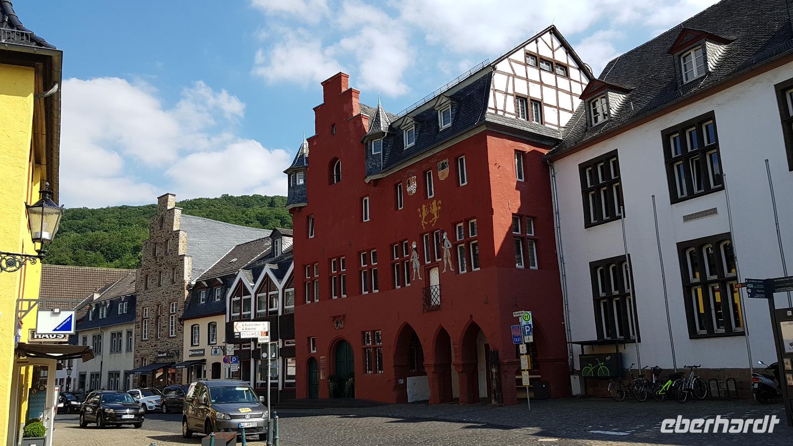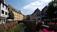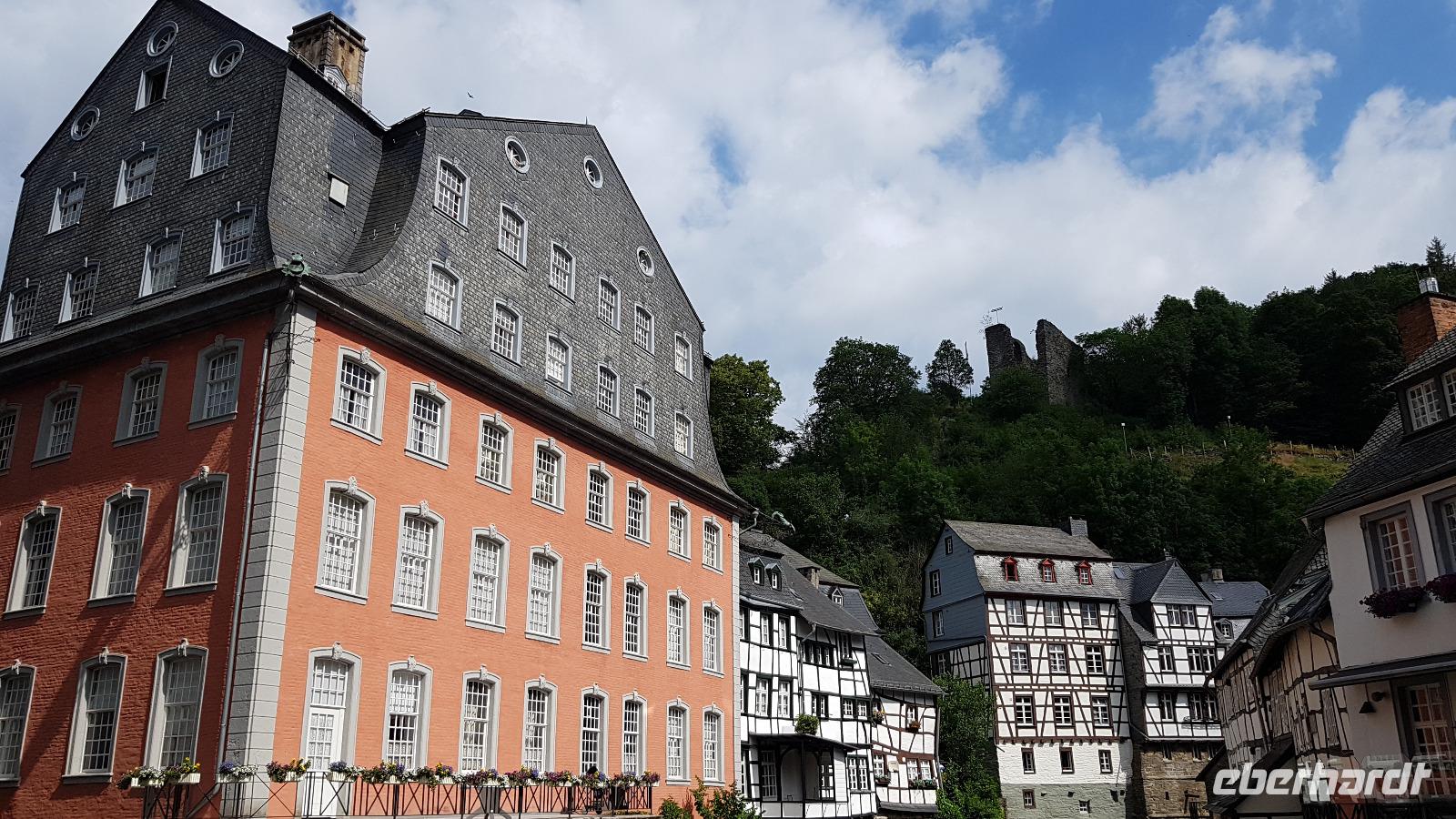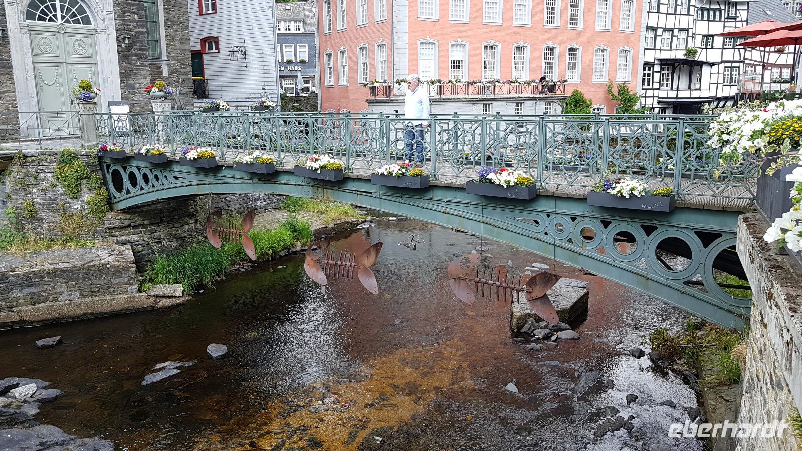 Heute treffen wir uns nach dem Frühstück mit Bodo- unserem örtlichen Reiseleiter. Mit ihm werden wir eine Rundfahrt durch die nördliche Eifel unternehmen. Den Beginn macht Monschau. Hier könnn wir das berühmte "Rote Haus" besuchen. Eine kleine Einführung und dann kann sich jeder individuell umsehen. Ein wunderschöner Spaziergang durch die Altstadt schloss sich an und dann fuhr uns Marcel nach Höfen zum Nationalparktor. Im Besucherzentrum konnten wir einen Film zum Nationalpark sehen und weiter ging unsere Fahrt an den Höfener Hecken vorbei. Eindrucksvoll diese Hecken- sie dienen vor allem dem Schutz vor Wind und Wetter. An der Burg Vogelsang steigen wir aus uns spazieren gemeinsam zum Aussichtspunkt. Was für ein schöner Blick von hier oben. Auch zur Geschichte der Burg erfuhren wir einiges, Kaderschmiede war sie unter den Nazis gewesen, hier hatten sie ihre Ideologie einer überlegenen Rasse in die jungen Köpfe eingetrichtert. Es läßt einen heute noch schaudern, welche Greuel damit möglich wurden. Nach einer kleinen Mittagspause fuhren wir weiter, noch einmal zum Rur-Stausee über die Staumauer und dann nach Bad Münstereifel. Und hier war man nicht, wenn man nicht bei Heino vorbeigeschaut hat. Also lassen wir uns im Heino-Cafe Kaffee und Kuchen schmecken und spazieren dann hinunter in die Altstadt. Hier können sich alle individuell umschauen und am Karls-Brunnen treffen wir uns wieder um gemeinsam zum Bus zu gehen. Marcel bringt uns sicher wieder zurück ins Hotel. Hier wartet zum Abendessen eine Überraschung auf uns: es wird gegrillt und das ist ausgesprochen lecker.