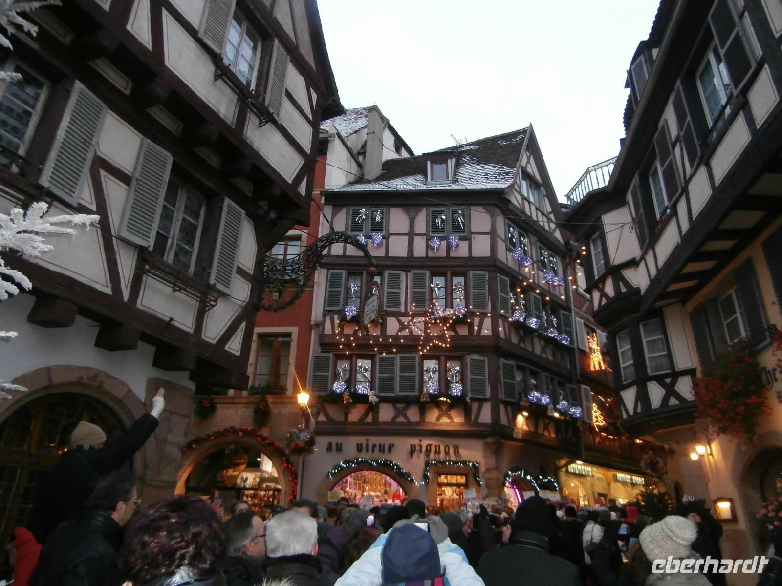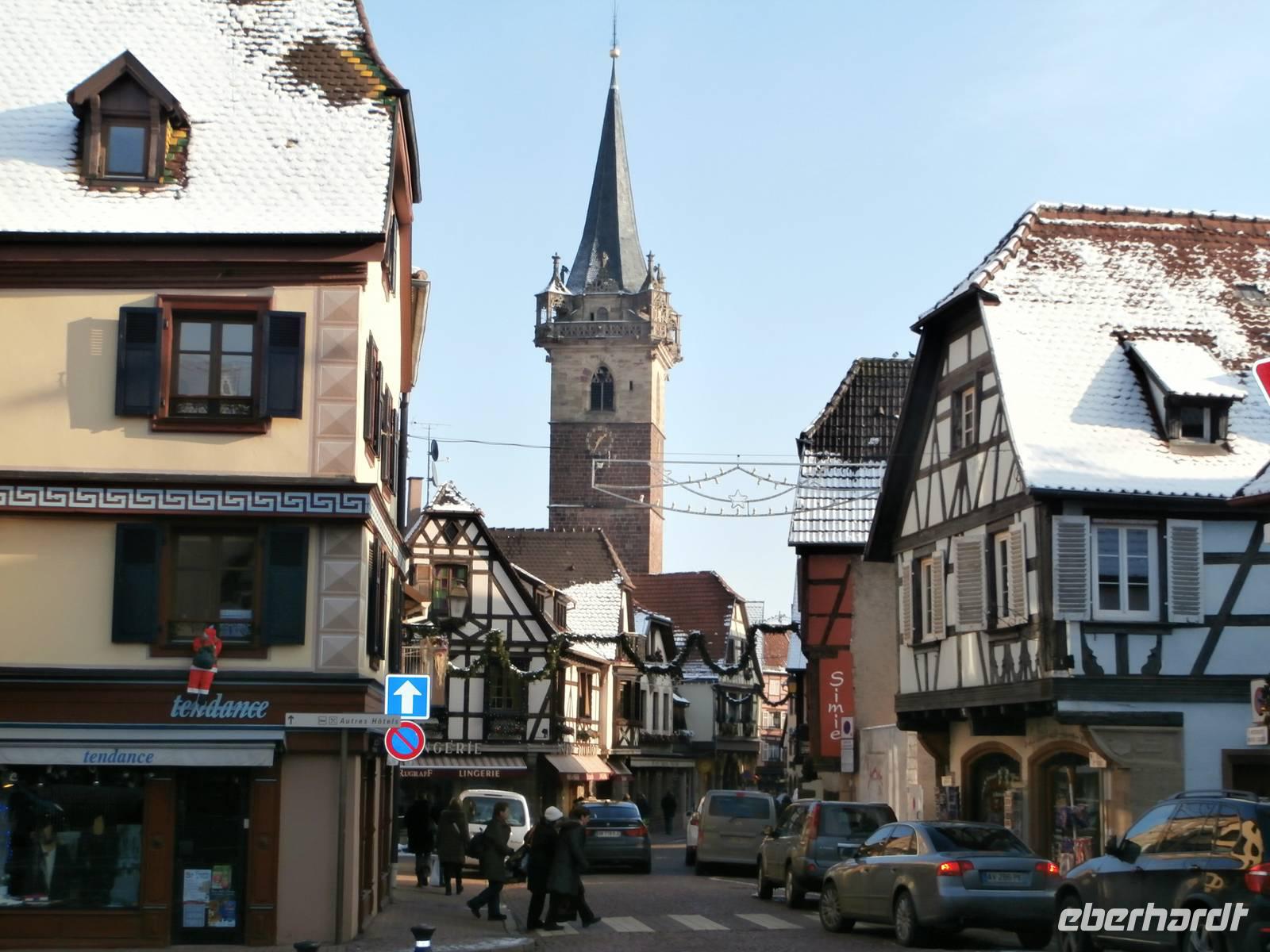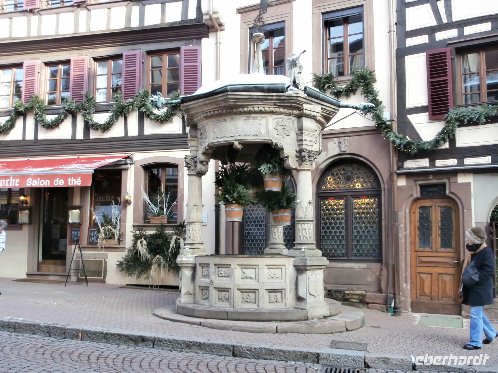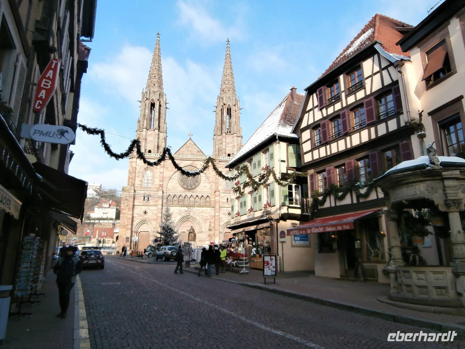 Obernai, an der Elsässischen Weinstraße gelegen, besuchen wir am zeitigen Nachmittag. Durch ein kleines Stadttor gelangen wir hinein in die Stadt vorbei an der alten Synagoge, auch hier wieder weihnachtliche Atmosphäre, in den Gassen hübsch geschmückte Fassaden. Weißer Glühwein von den örtlichen Winzern ausgeschenkt, schmeckt und wärmt durch. Am Marktplatz sehen wir den Odilienbrunnen, die Heilige Odilie ist die Schutzpatronin des Elsaß und sie wurde in Obernai geboren. Vorbei am Sechs-Eimer-Brunnen, der im Renaissancestil errichtet wurde, gelangen wir zur Pfarrkirche St. Peter und Paul, sie ist nach dem Münster in Straßburg, die größte Kirche im Elsass, gebaut in neugotischen Stil. Langsam einsetzende Dunkelheit macht uns gespannt auf den Besuch in Colmar.
