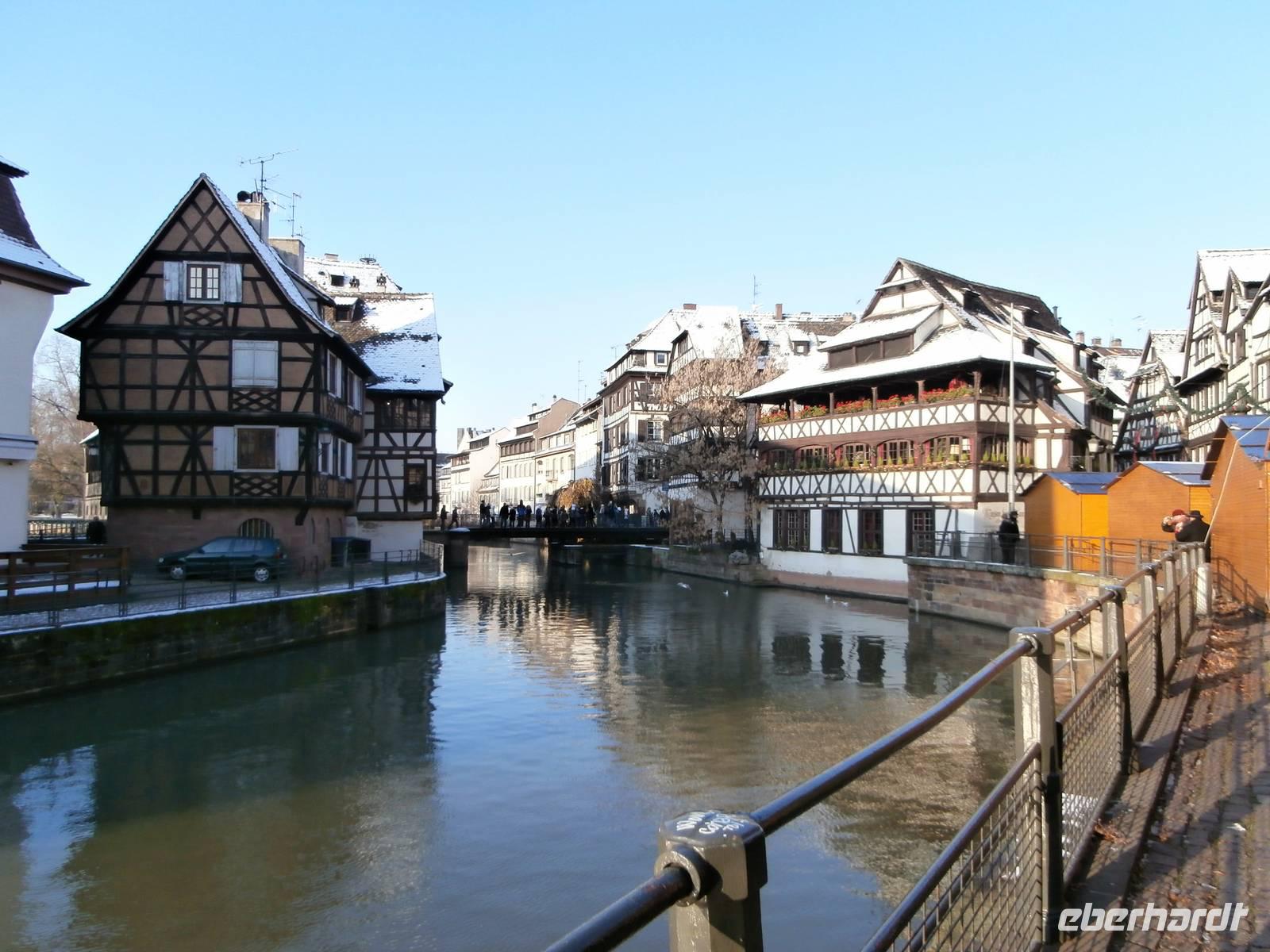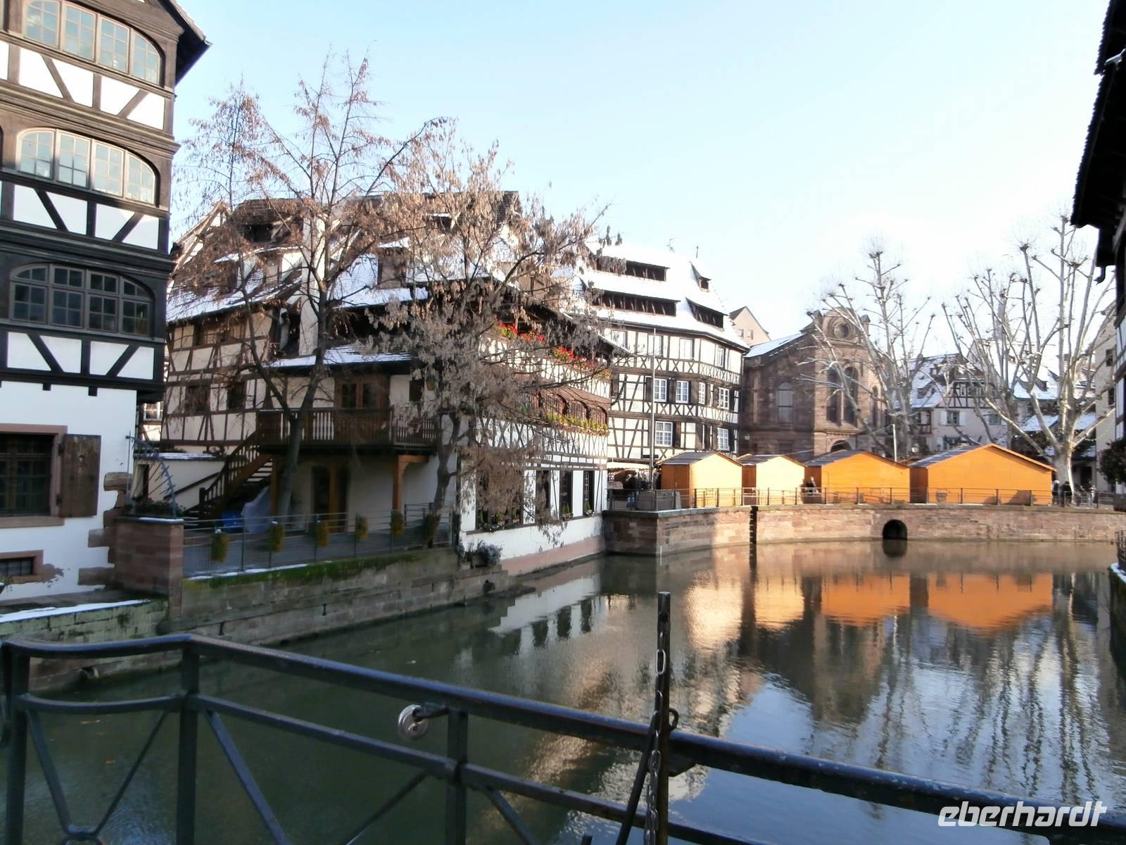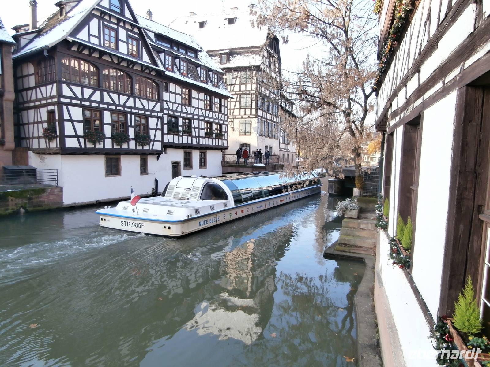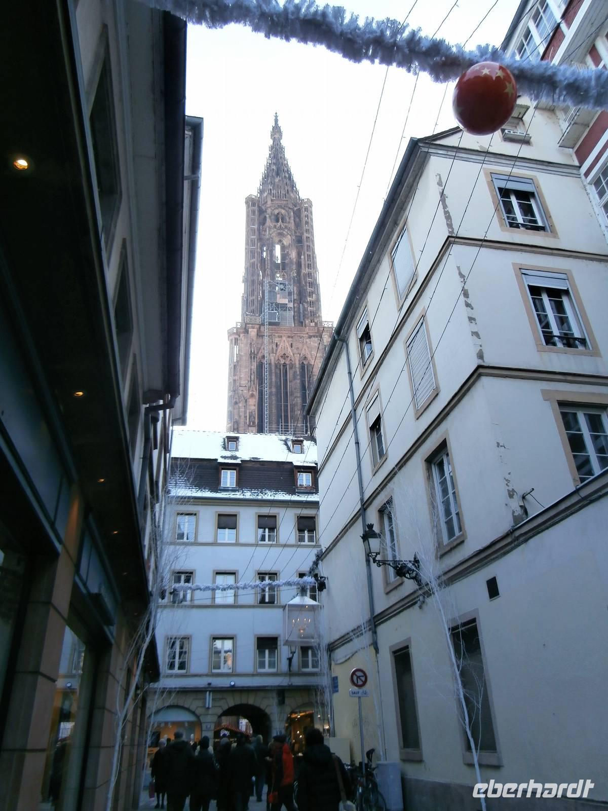 Der Blick aus dem Fenster heute Morgen lässt uns erwartungsvoll in den Tag starten. Sonne, etwas Schnee von der Nacht und blauer Himmel sind unsere Begleiter. Die Fahrt geht vorüber an hübschen Schwarzwalddörfern, die sehr schön weihnachtlich geschmückt sind, auch über den Rhein fahren wir heute Morgen. Er bildet ja bei Kehl den Grenzverlauf zu Frankreich und weiter geht's hinein nach Straßburg, unser erstes Besichtigungsziel auf der Tour der Elsässer Weihnachtsmärkte. Wir nehmen am vereinbarten Treffpunkt unseren örtlichen Reiseleiter, Herrn Lionel Heiwy, auf und starten zur einstündigen Stadtrundfahrt u. a. mit dem Europaviertel. Durch seine Arbeit als Architekt hat unser Reiseleiter einen besonderen Blick auf die alten und neueren Gebäude und Brücken von Straßburg. Bei Sonnenschein und blauen Himmel sind wir im Anschluss zu Fuß unterwegs, laufen über die gedeckten Brücken, durch das Gerberviertel „Petit France" bis hin zum Stadtzentrum mit dem Wahrzeichen Straßburgs, dem Münster. Überall in den Gassen und an den Fachwerkhäusern ist eine herrliche Weihnachtsdekoration zu sehen, ganz anders wird im Elsass geschmückt, fast jede Fassade trägt einen anderen Festschmuck und im Lichterglanz erstrahlen die Häuser und vermitteln ein besonderes Flair. Rings um das Münster findet der Weihnachtsmarkt statt, über ihn sind wir noch gebummelt. Da wir noch zwei andere Weihnachtsmärkte im Elsaß auf dem Programm haben, spazieren wir gemeinsam zurück zum Bus, hier erwartet uns Roy mit Kaffee und Glühwein zum Aufwärmen.