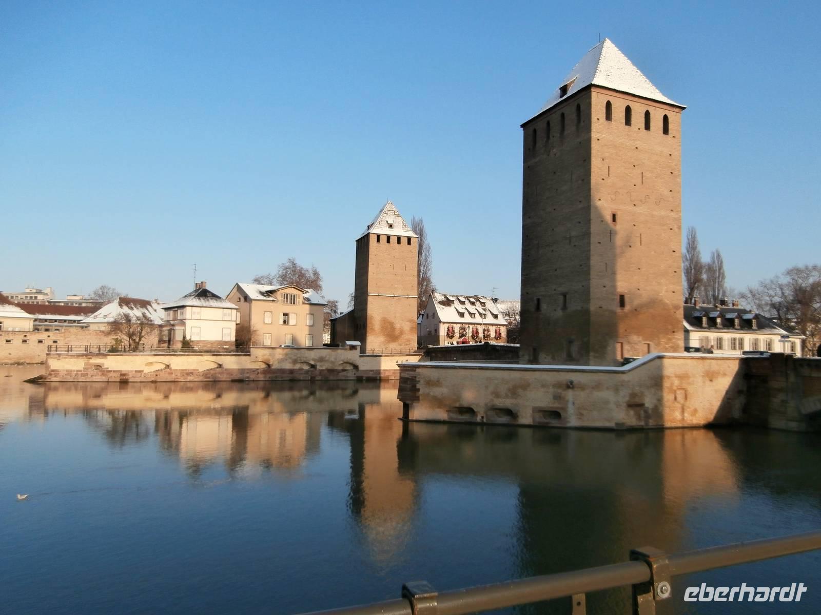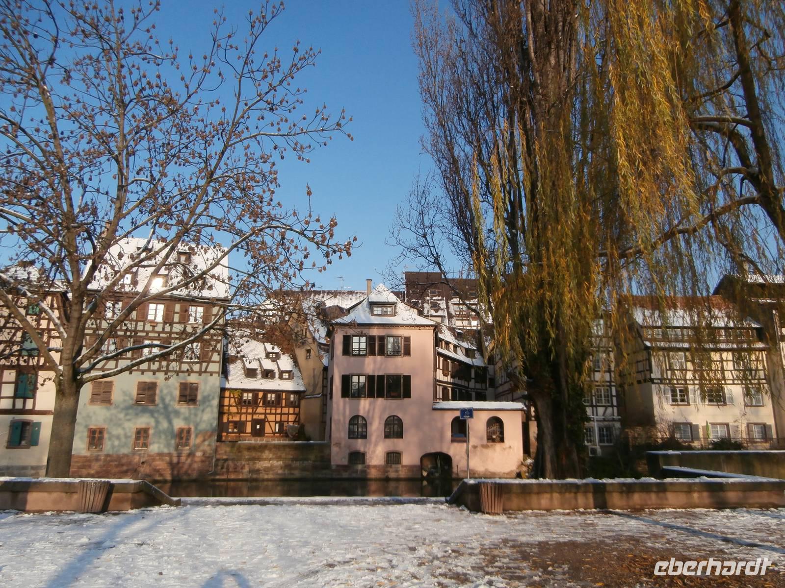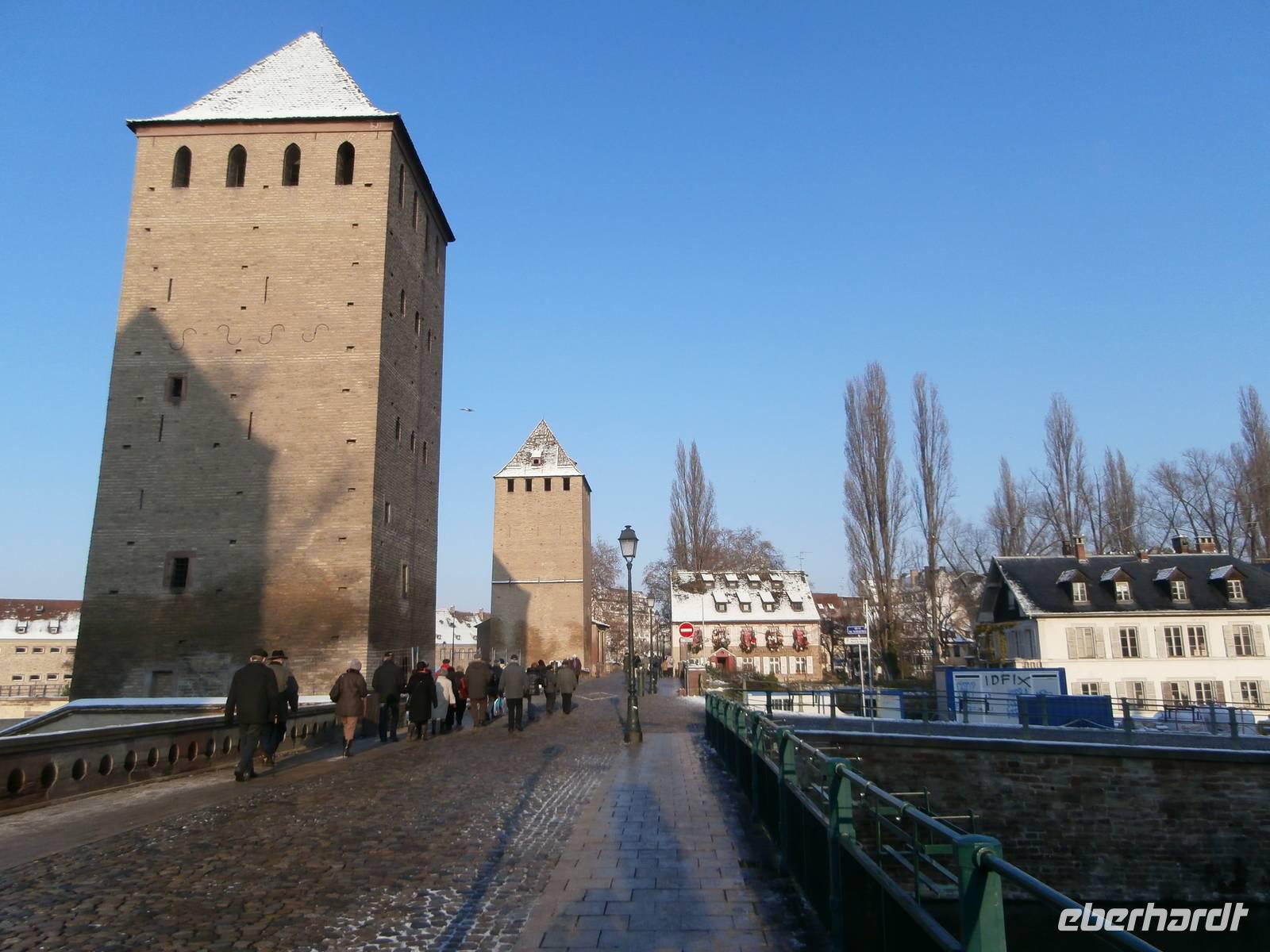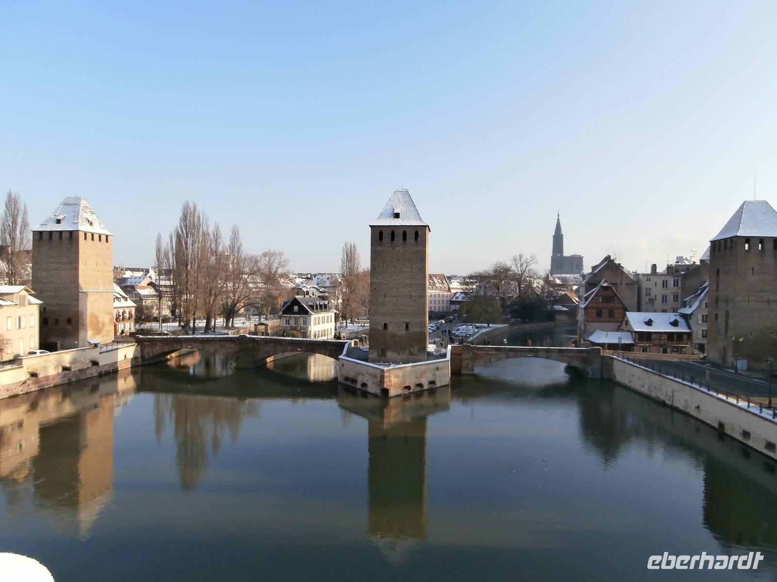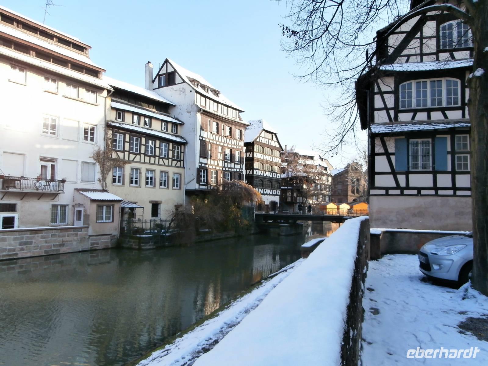 Der Blick aus dem Fenster heute Morgen lässt uns erwartungsvoll in den Tag starten. Sonne, etwas Schnee von der Nacht und blauer Himmel sind unsere Begleiter. Die Fahrt geht vorüber an hübschen Schwarzwalddörfern, die sehr schön weihnachtlich geschmückt sind, auch über den Rhein fahren wir heute Morgen. Er bildet ja bei Kehl den Grenzverlauf zu Frankreich und weiter geht's hinein nach Straßburg, unser erstes Besichtigungsziel auf der Tour der Elsässer Weihnachtsmärkte. Wir nehmen am vereinbarten Treffpunkt unseren örtlichen Reiseleiter, Herrn Lionel Heiwy, auf und starten zur einstündigen Stadtrundfahrt u. a. mit dem Europaviertel. Durch seine Arbeit als Architekt hat unser Reiseleiter einen besonderen Blick auf die alten und neueren Gebäude und Brücken von Straßburg. Bei Sonnenschein und blauen Himmel sind wir im Anschluss zu Fuß unterwegs, laufen über die gedeckten Brücken, durch das Gerberviertel „Petit France" bis hin zum Stadtzentrum mit dem Wahrzeichen Straßburgs, dem Münster. Überall in den Gassen und an den Fachwerkhäusern ist eine herrliche Weihnachtsdekoration zu sehen, ganz anders wird im Elsass geschmückt, fast jede Fassade trägt einen anderen Festschmuck und im Lichterglanz erstrahlen die Häuser und vermitteln ein besonderes Flair. Rings um das Münster findet der Weihnachtsmarkt statt, über ihn sind wir noch gebummelt. Da wir noch zwei andere Weihnachtsmärkte im Elsaß auf dem Programm haben, spazieren wir gemeinsam zurück zum Bus, hier erwartet uns Roy mit Kaffee und Glühwein zum Aufwärmen.