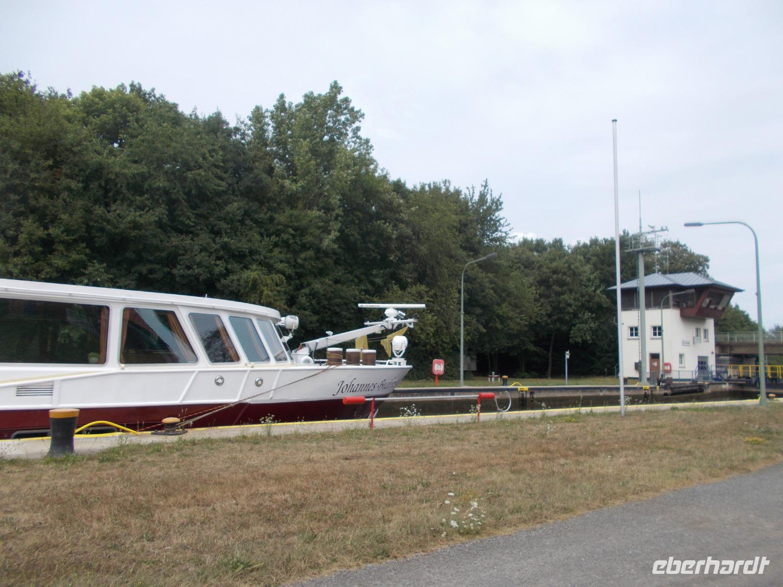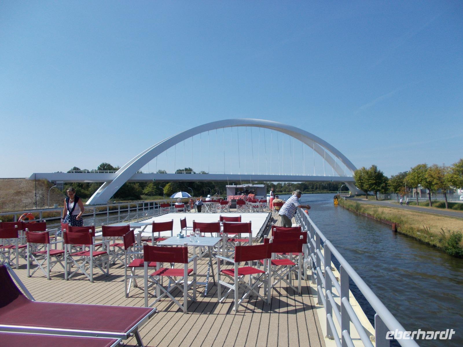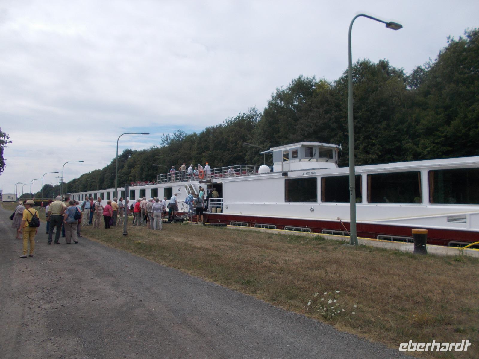 Gefrühstückt haben wir noch in Brandenburg an der Havel.Danach fuhren wir nach Potsdam um auf den Spuren Friedrich des Großen zu wandeln.Wir besuchten sein,für sich geschaffenes, Sans Souci.Dort wollte er „ohne Sorgen" leben und bestattet sein.Die Ideen dazu brachte er selbst ein und der Baumeister von Knobelsdorff verwirklichte sie.Ein wunderschön gestalteter Park und zahlreiche andere Schlösser runden diese grandiose Anlage ab.In Gentin gingen wir wieder an Bord.Der Kapitän wartete schon auf uns und die Mannschaft präsentierte uns ein gelungenes Mittagsbüffet.Auf dem Sonnendeck ließ sich die Mittagspause gut verbringen .Die beruhigende Landschaft, des Mittellandkanals ,zog an uns vorüber .In Hohenwarte Nord wurden wir von unten nach oben geschleust.Die bemerkenswerte Schleuse ,von 18 m ,war ein begehrtes Fotomotiv. Am späten Abend legten wir in Calvörde an.Es war wieder ein schöner ,lauer Abend und so war das Oberdeck voll besetzt. Wir wollten das Spektakel der Mondfinsternis beobachten und harten aus, um den Aufgang des Blutmondes zu verfolgen.Leider hing der Himmel voller Wolken.