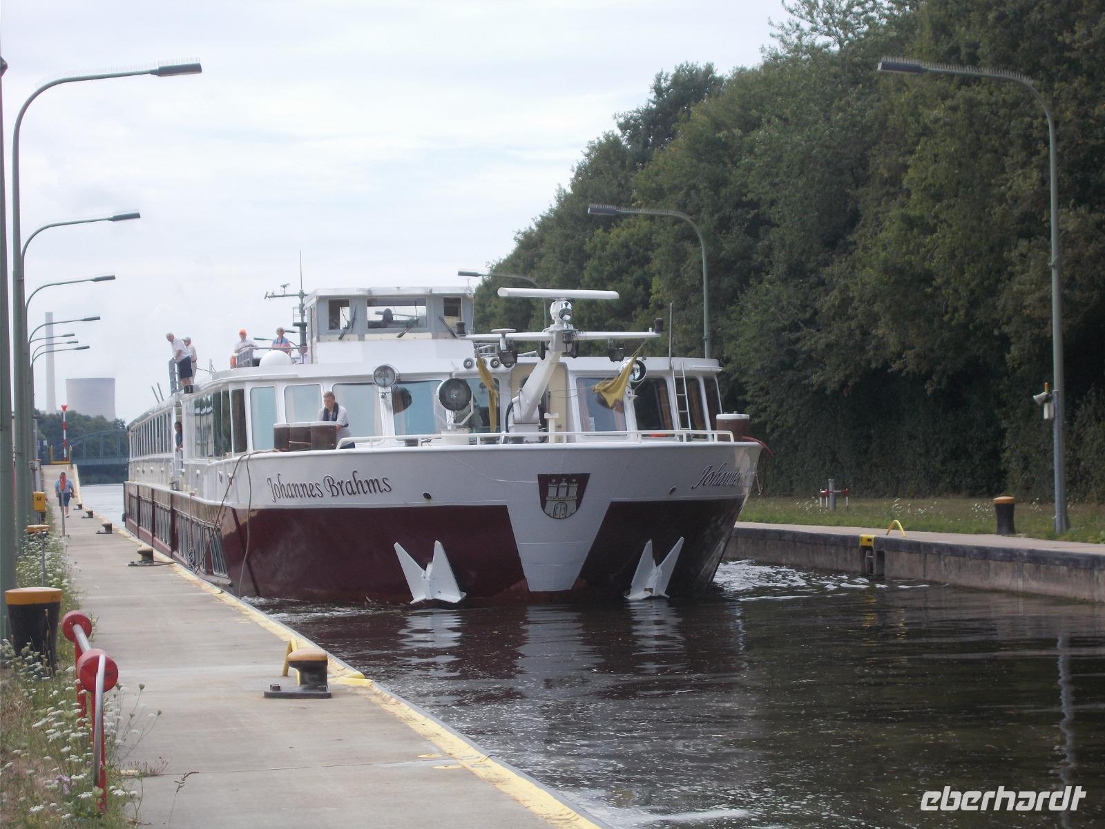 Bei tropischen Temperaturen strarteten wir unsere Reise.In Berlin wurden wir schon zur Stadtrundfahrt erwartet.Petra,eine „Ureinwohnerin"zeigte uns so viel von ihrer Stadt ,wie wir in zwei Stunden nur sehen konnten.Zwar wirklich viel,aber auch viel zu wenig.Ja, Berlin ist nun mal immer eine Reise wert,vorallem sollte man sich Zeit dafür nehmen.Wir fingen gleich damit an und erkundeten in unserer Freizeit den Potsdamer Platz.Vom Panorama Punkt hat man auch eine tolle Sicht über die Dächer der Hauptstadt.Im Hafen Spandau lag die„Johannes Brahms"und wir tauschten den Bus gegen das Schiff ein,welches unser schwimmendes Hotel für die nächsten Tage werden sollte.Nach der Begrüßung bezogen wir die Kabinen und fanden uns am Abend zu einem ersten ,gemeinsamen Essen ein.Es war ein so schöner milder Abend,man mußte einfach auf dem Oberdeck sitzen und den Mond aufgehen sehen.