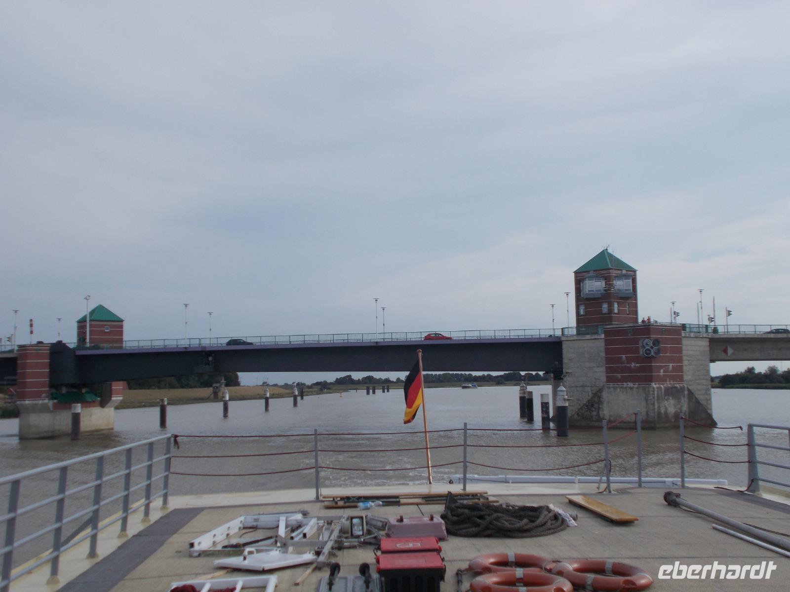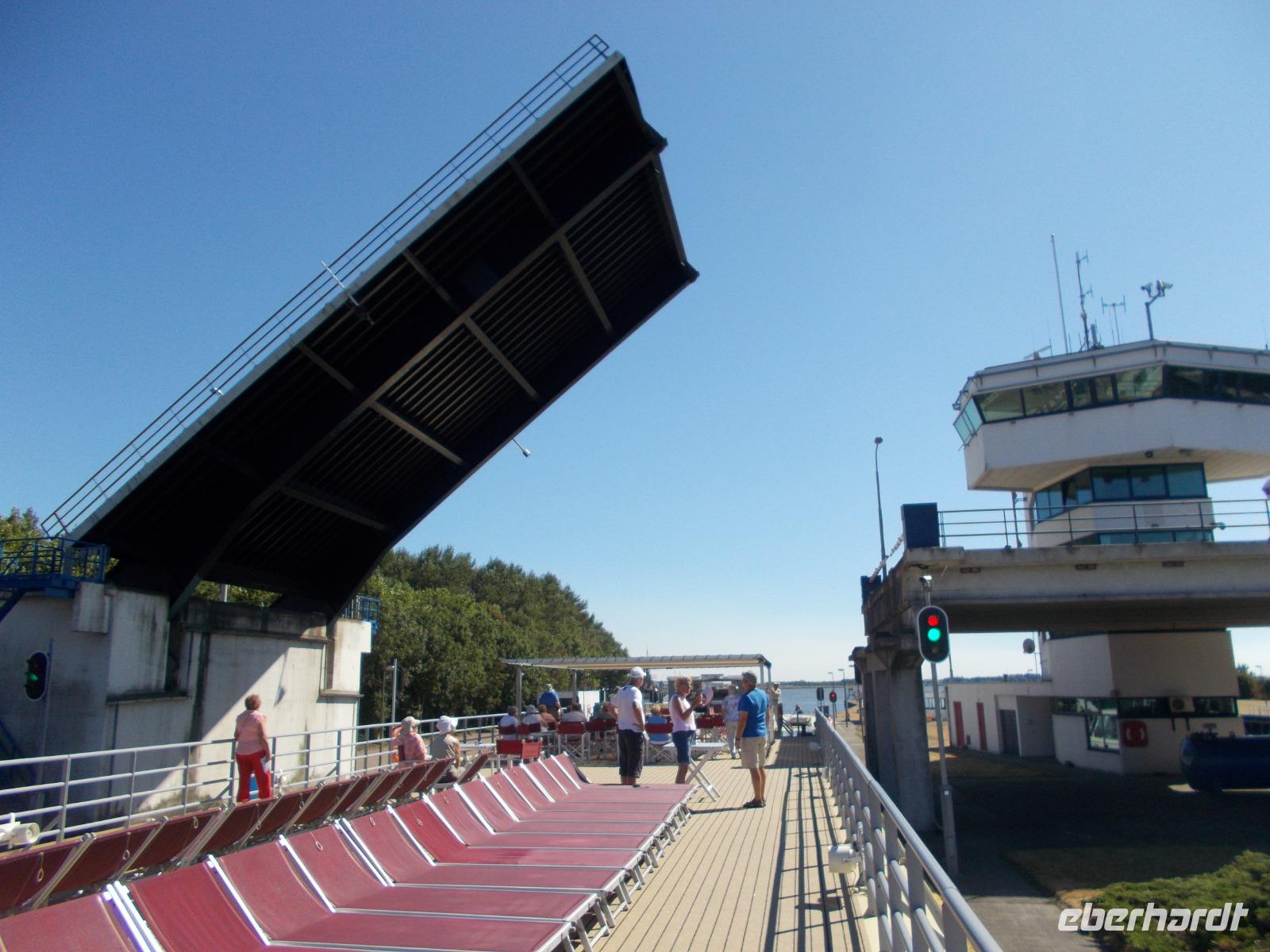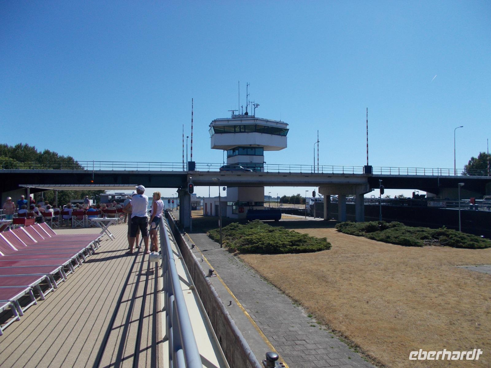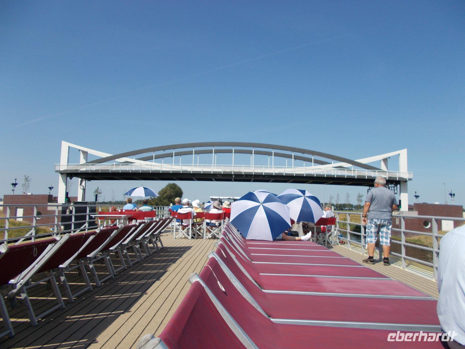 Unter diesen langanhaltenden ,tropischen Temperaturen haben nicht nur wir Menschen zu leiden.Nein,auch Brücken fangen an zu lahmen.Die Zugbrücke zum Oldenburger Hafen ließ sich nicht mehr regulär öffnen.Die DB hatte einfach Vorfahrt und der Schiffsverkehr mußte ausharren,bis es möglich war" die Brücke zu teilen".Wir hatten richtig Glück,pünktlich wie im Plan vorgesehen,starteten wir zu unserem Rundgang durch die kleine,feine Residenzstadt Oldenburg.Die Stadtführer holten uns direkt vom Anleger ab und schon waren wir im Zentrum.Wir schlenderten den Stau entlang zur imposanten Post ,weiter durch ein Gewirr von kleinen Gassen und erreichten die St.Lamberti Kirche.Dort trafen wir die Sonntagsgruppe und stimmten gemeinsam ein Lied an.Der gemischte Chor konnte sich hören lassen.Wir flanierten noch bis zum Schloss ,welches leider einen „blauen Umhang „trug (sprich renoviert wurde).Hier endete dann auch unser offizieller Rundgang.Zur Verabschiebung bekamen wir von der Stadtführerin einen Oldenburger- Kartengruß geschenkt.Auf dem Rückweg zum Hafen wehte wenigstens etwas erfrischende Luft vom Wasser.Die Küche hatte wieder gezaubert und so gab es ein einladendes Abendbüffet.Am späteren Abend überraschte uns die Crew mit einer wirklich gelungenen Show.Beim Abschiedslied blieb kaum einer auf seinem Stuhl sitzen und ein „Zug fröhlicher Leute" zog durch den Salon.Umrahmt wurde das Programm von Bordmusiker Kristof.Vom Stadthafen ging unsere Reise nun den Küstenkanal entlang.7.Tag,