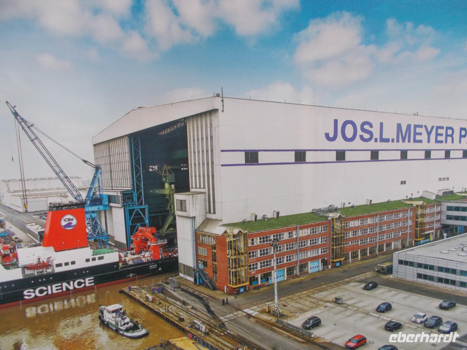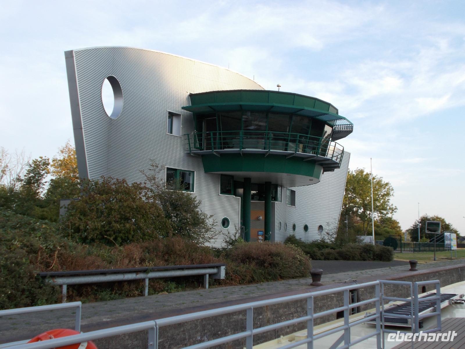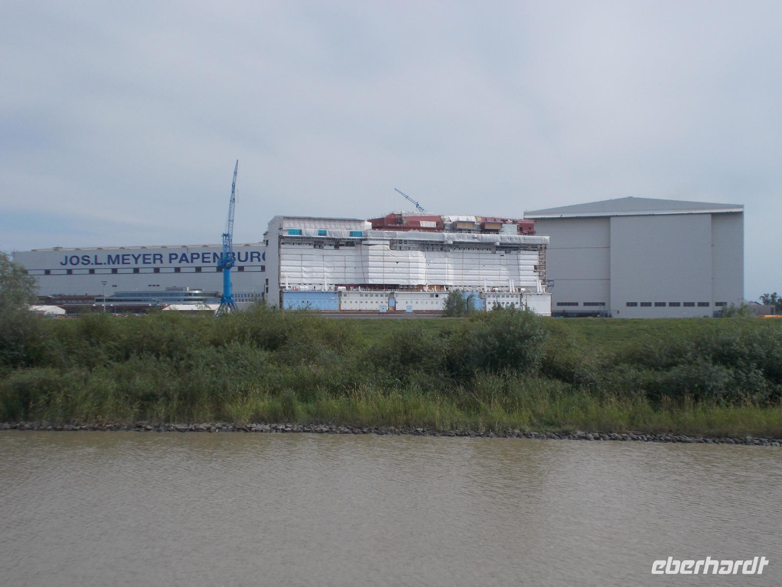 Nach dem Frühstück wechselten wir in Kampe zum Bus ,um nach Papenburg zu gelangen.Der Besuch der Meyer Werft stand an.Sie ist seit Generationen in privater Hand und hat sogar in Finland eine Außenstelle.Uns wurde, von der Idee zum Entwurf bis zur Fertigstellung,alles gut und verständlich erklärt.Es gehört eine ausgeklügelte Logistig dazu, um die Auslieferung termingerecht zu halten.Im Bau sahen wir die Aida Nova.Im August soll sie in Papenburg getauft werden.Es ist die erste Taufe eines Schiffes auf der Werft und soll mit einem großen Open Air Konzert begangen werden. September 2018 soll sie die Hallen verlassen und wie wir, im Anschluß ein Stück,eine Reise über den Emskanal antreten.Doch zuerst mußten wir zurück zu unserem schwimmenden Hotel.Vor der Schleuse Böllingerfähr gingen wir steuerbord Seitig an Bord.Wir fuhren durch die ,zum Teil aus Ziegelbau bestehenden,Jann Berghof Brücke durch,die Ems entlang.Das gigantische Emssperrwerk,welches nun folgte,dient zur Regulierung des Flusses bei Überführungen von Schiffen zur Nordsee und hält Sturmfluten ab.Von fern sahen wir die vielen Windräder ,am Rand des Dollard gebaut.In Delfzijl drehten wir, ab um nach Groningen zu gelangen und über Nacht im Stadthafen zu liegen.