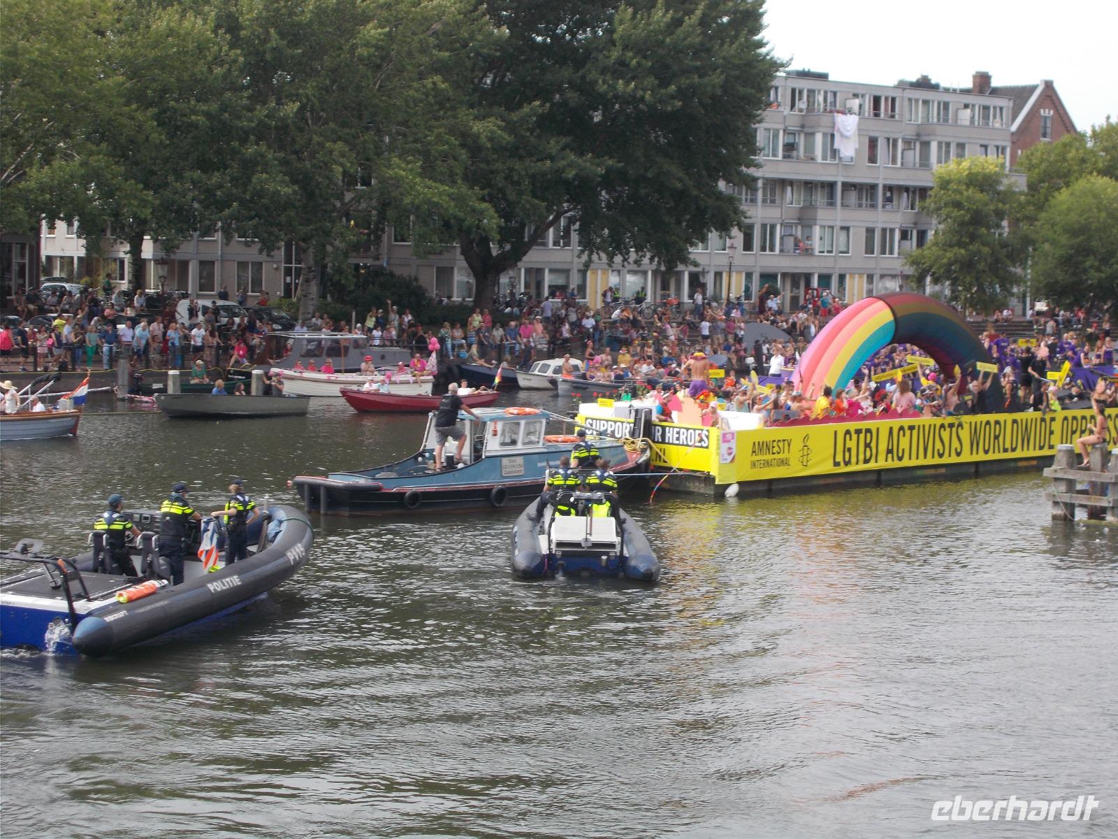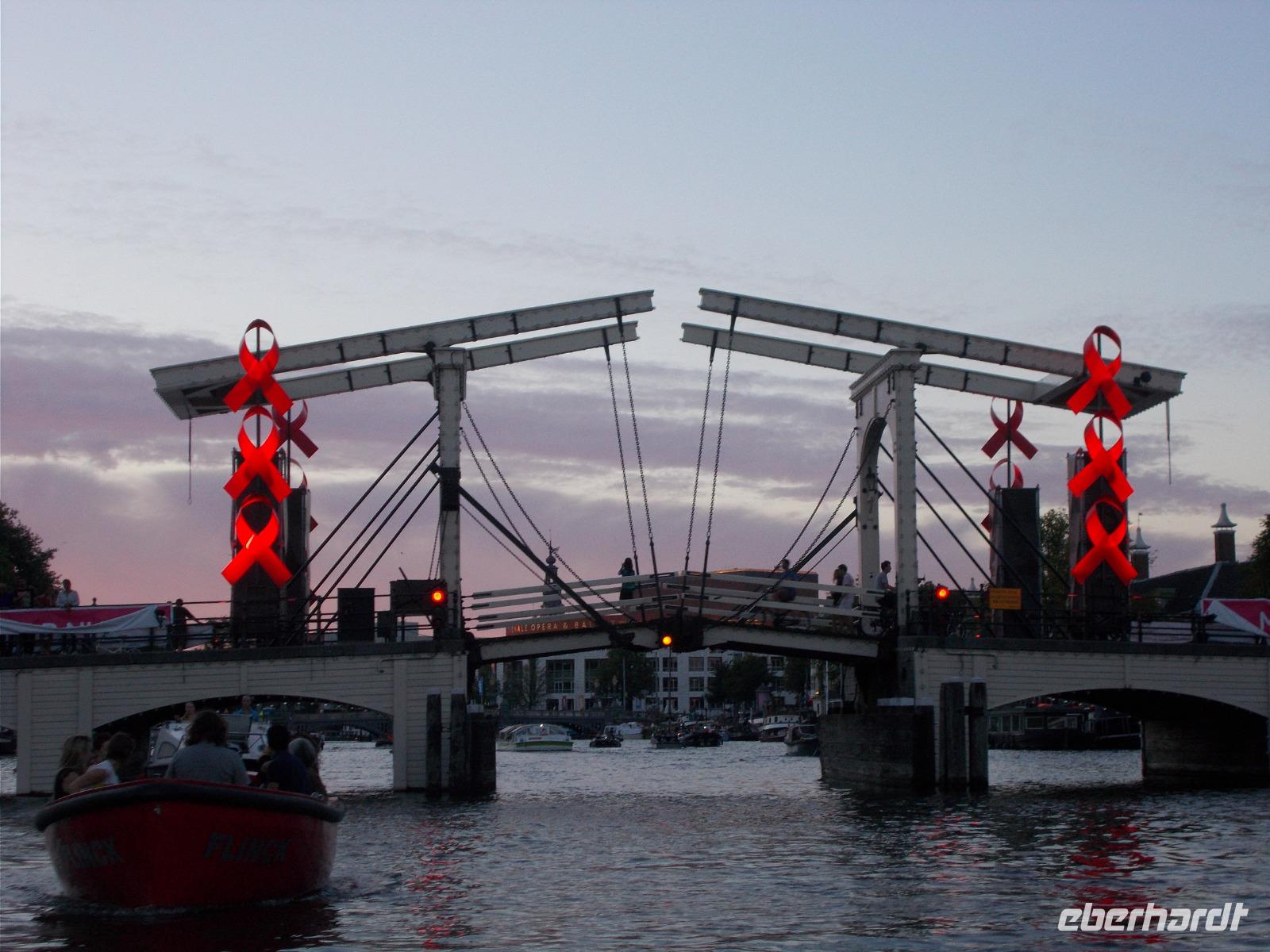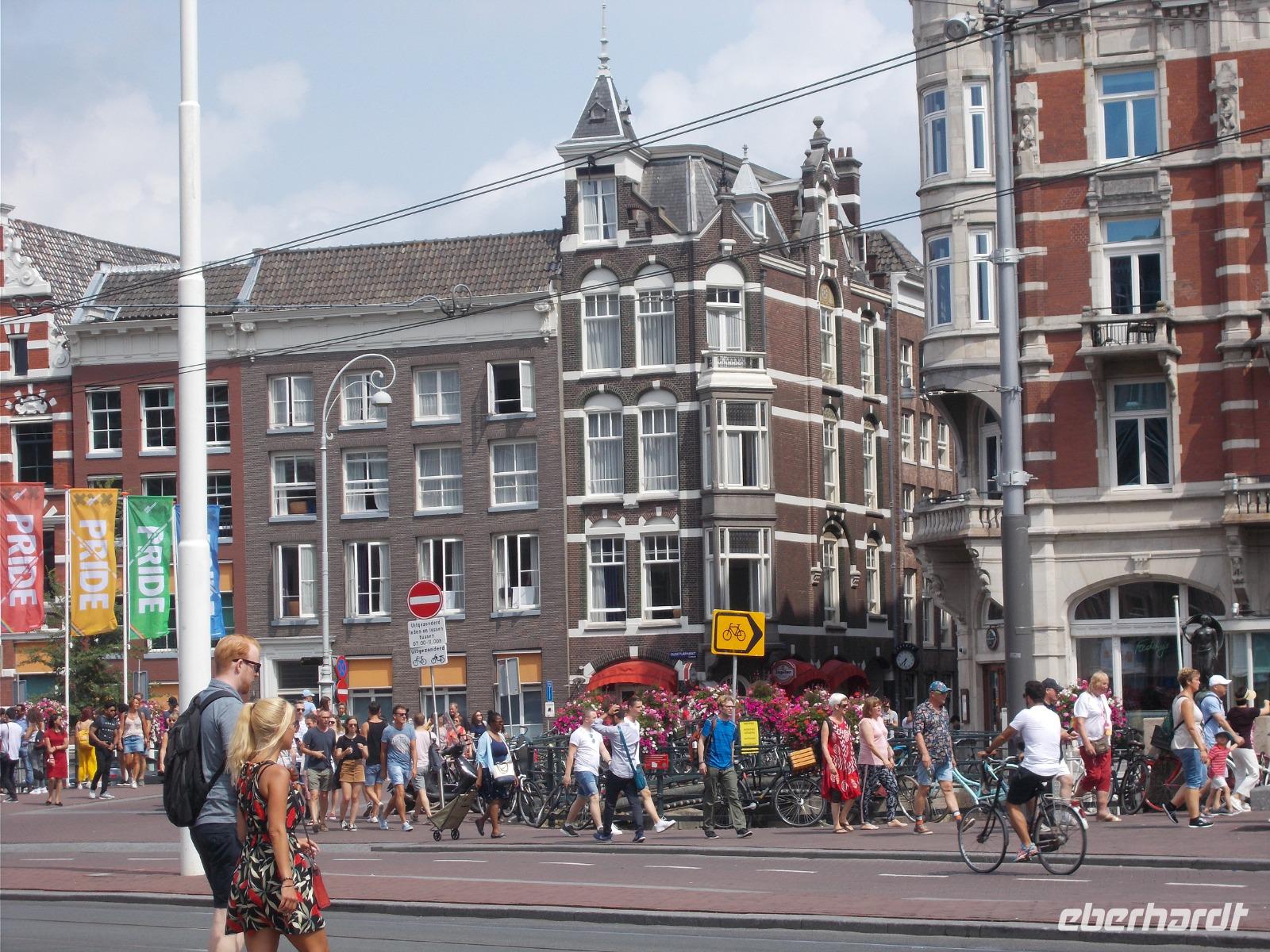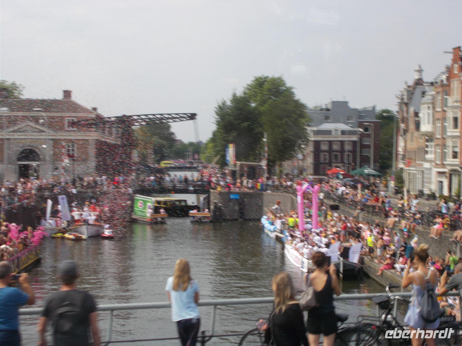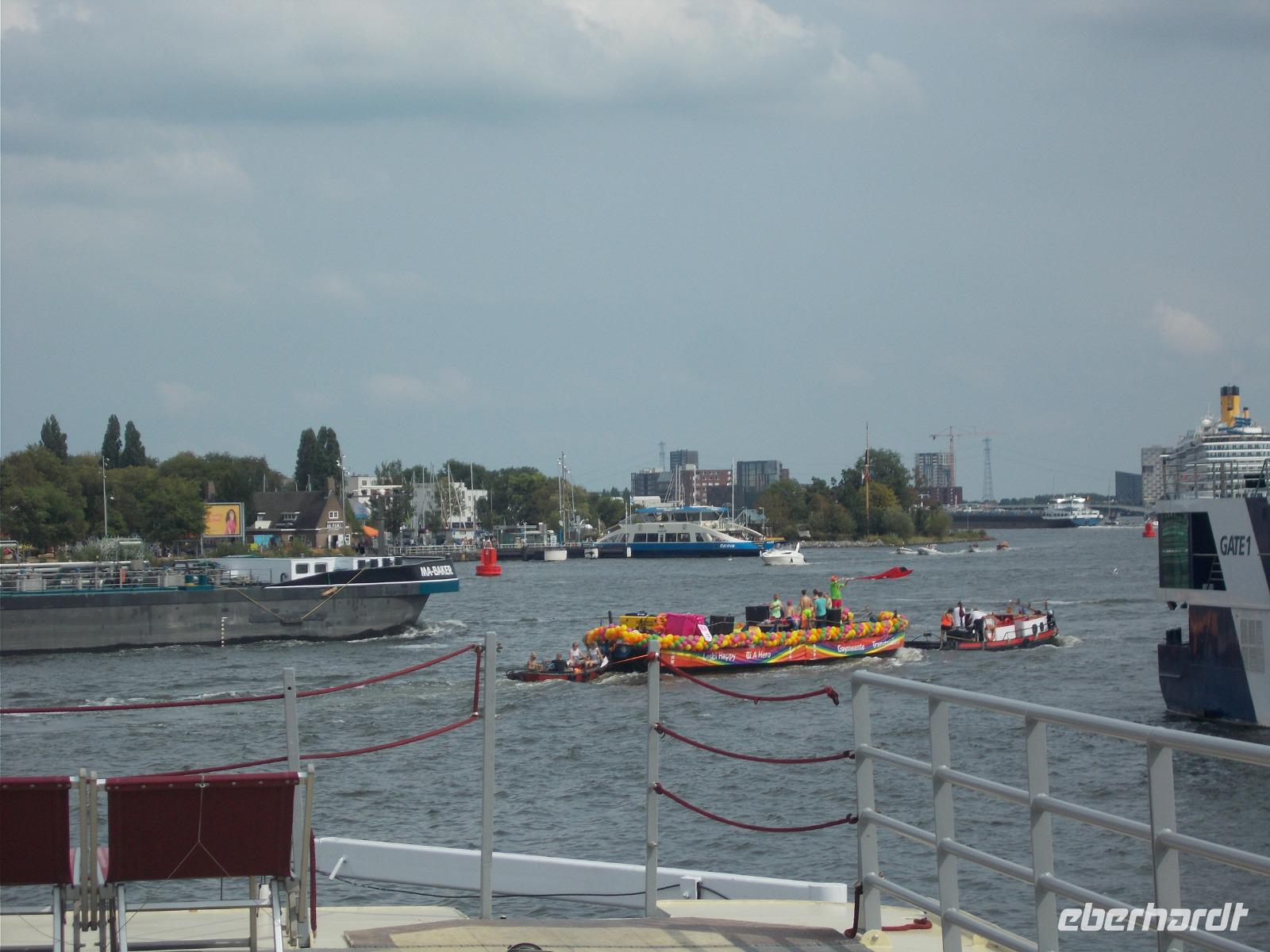 Sahen wir Amsterdam gestern Abend von der Wasserperspektive aus,so rollten wir heute mit unserem Bus durch die Straßen.Wir sahen die einzigartige Architektur und wurden auf die zahlreichen Museem aufmerksam gemacht.Einen Zwischenstop legten wir an der Amsel und am Windmühlenmotiv Remrands ein.Zurück in der Stadt wurde der Verkehr immer dichter.Es rüstete sich alles für die Love Parade,die hier zu Lande allerdings auf den Grachten stattfindet.Überall ,nicht nur auf dem Blumenmarkt, war es schrill und bunt.Auf den Brücken und Ufern drängten sich die Zuschauer um diesen Spektakel zu zusehen.Und wir mittendrin !Unser Abend wurde mit dem Kapitänsdinner gekrönt,wobei die Küchencrew wieder gezaubert hatte.Ein letzter Abend an Bord, nahm einen schönen Ausklang ,bei beschwingten Melodien ,in der Bar.