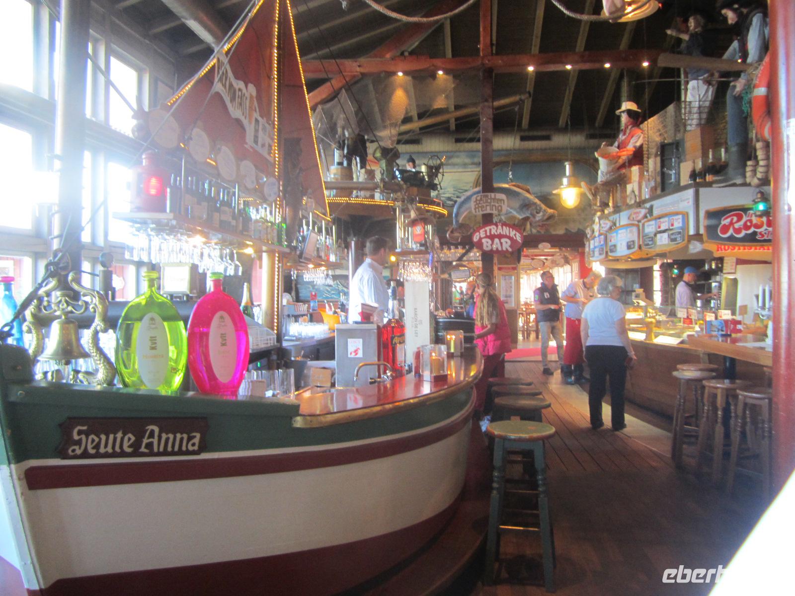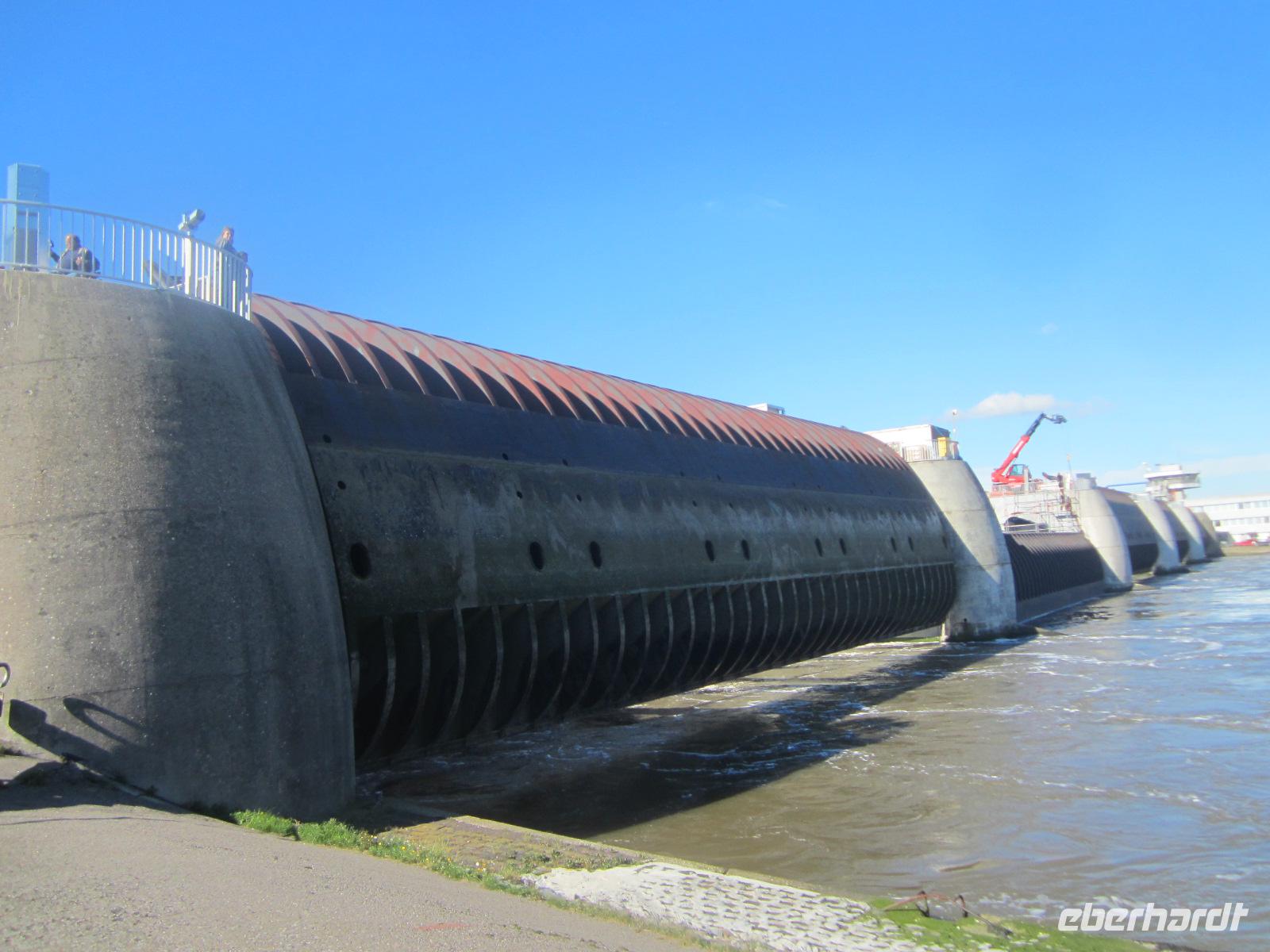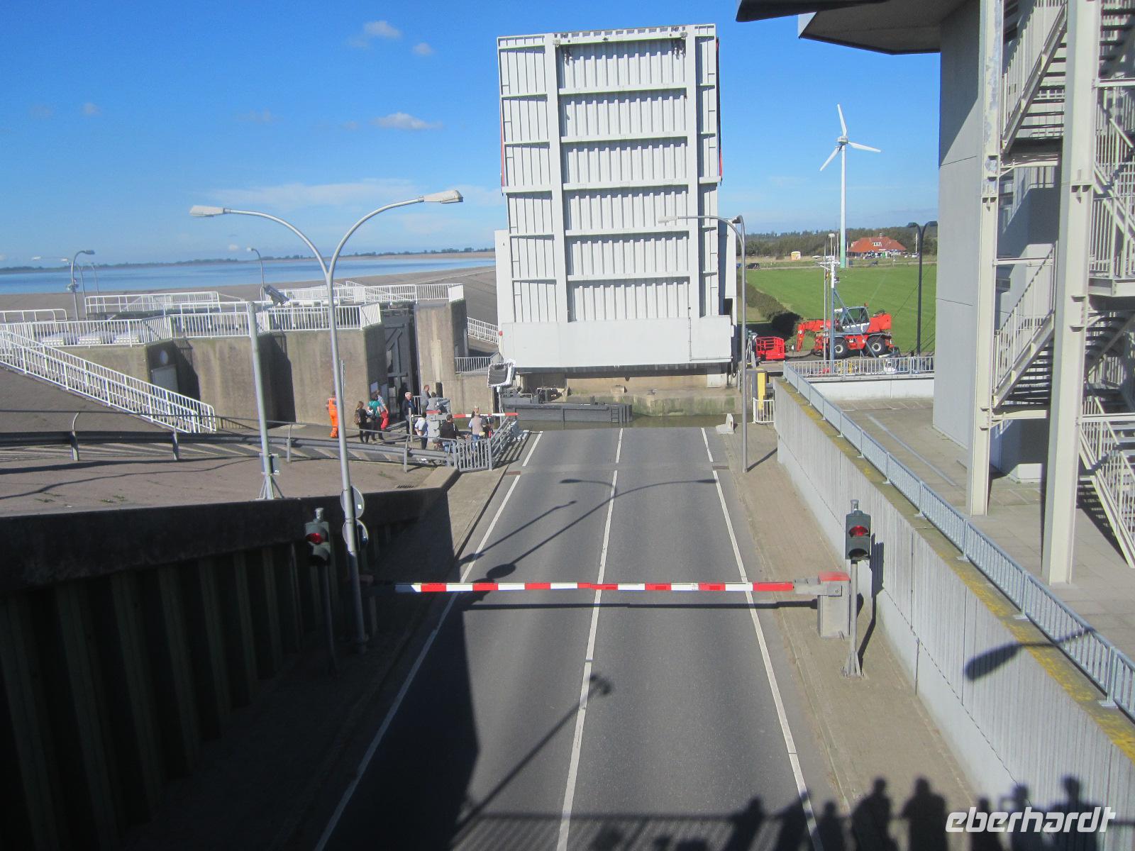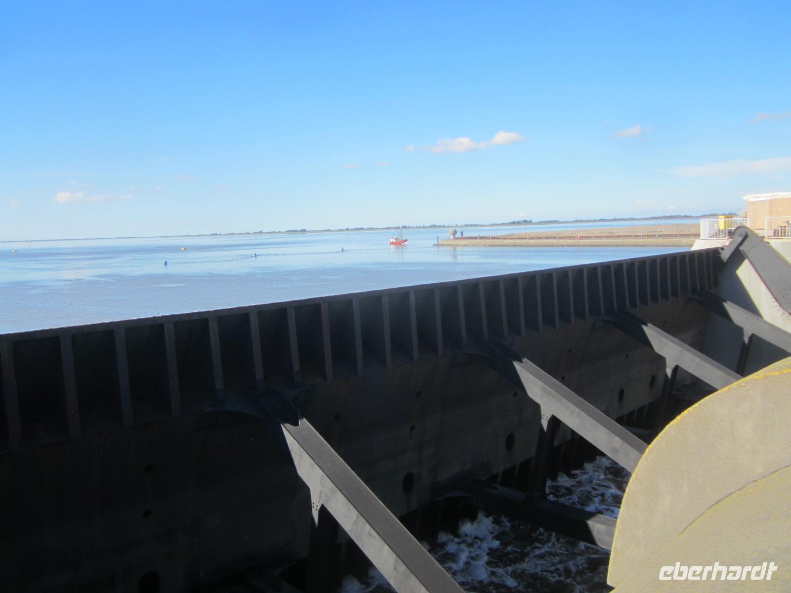 zu sehen. Auf dem Weg dahin sehen wir uns den historischen Hafen von Tönning an. Gegen 14.00 Uhr erreichen wir dann das Eidersperrwerk. Dieses trennt seit 1973 die Eidermündung von der offenen Nordsee. Wir sehen die fünf 40 Meter breiten Stömungstore, die bei günstigen Wetter offen sind und bei Sturmflut geschlossen werden. Beeindruckt von dem größten deutschen Küstenschutzbauwerk setzten wir unsere Fahrt fort und besuchen eines der beliebtesten Touristenzentren von Eiderstedt, St.Peter-Ording. Der Ort ist bekannt für seine Strandsegler, den Schwefelquellen und den Restaurants auf Pfählen. Für uns ist dieser Ort Anlass, heute noch einmal zu Gosch zu gehen und diesmal Austern zu schlürfen. Für einige von uns das erste Mal. Probiert haben es aber (fast) alle von uns. Auf unserer Fahrt zum Hotel verabschiedend wir uns von Herrn Erichsen und sind sehr zufrieden mit dem heutigen Tag, dem Programm und der Sonne, die wir auch heute erleben konnten.