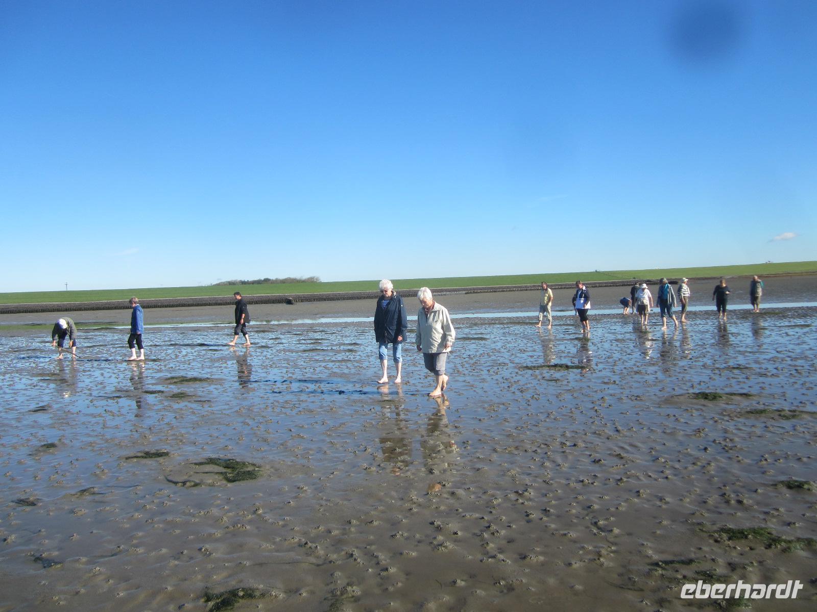Heute können wir ausschlafen. 09.00 Uhr starten wir mit unserem Ausflug. Als Erstes steht die Wattwanderung auf dem Programm. Werden wir barfuß im Watt wandern können. Wir lassen uns noch etwas Zeit und erfahren noch einiges über Husum. Dann fahren wir aber auf die Insel Nordstrand. Auch hier fahren wir über einen 4 km langen Damm, der die Insel und das Festland verbindet. Eine Stunde wandern wir im Watt und erfahren von Herrn Erichsen viel über das eigentümliche Naturschutzgebiet, über die Gezeiten und dem sechsstündigen Rhythmus von Ebbe und Flut. Eines der Besonderheiten unserer Wanderung ist das Aufsuchen des Wattwurmes und wir finden ihn. Nach dem die Füße gewaschen genießen wir noch die Sonne bei einem Fischbrötchen.