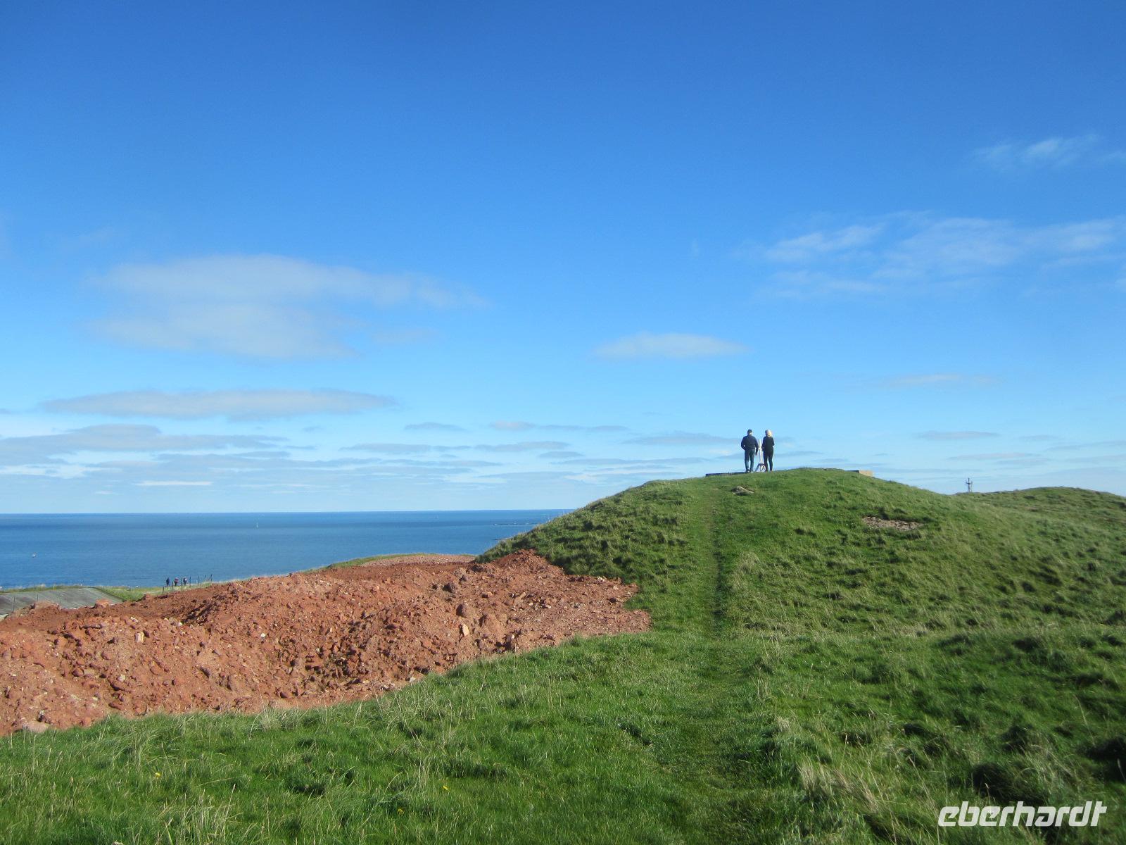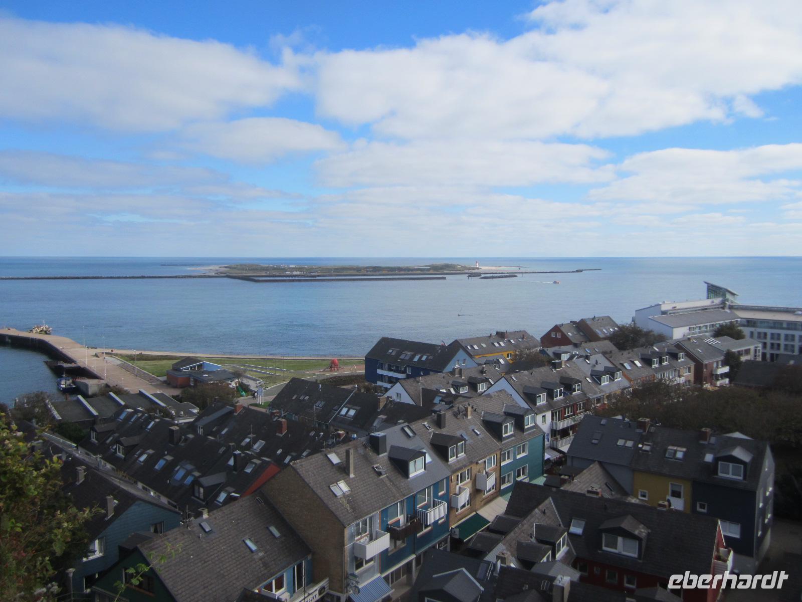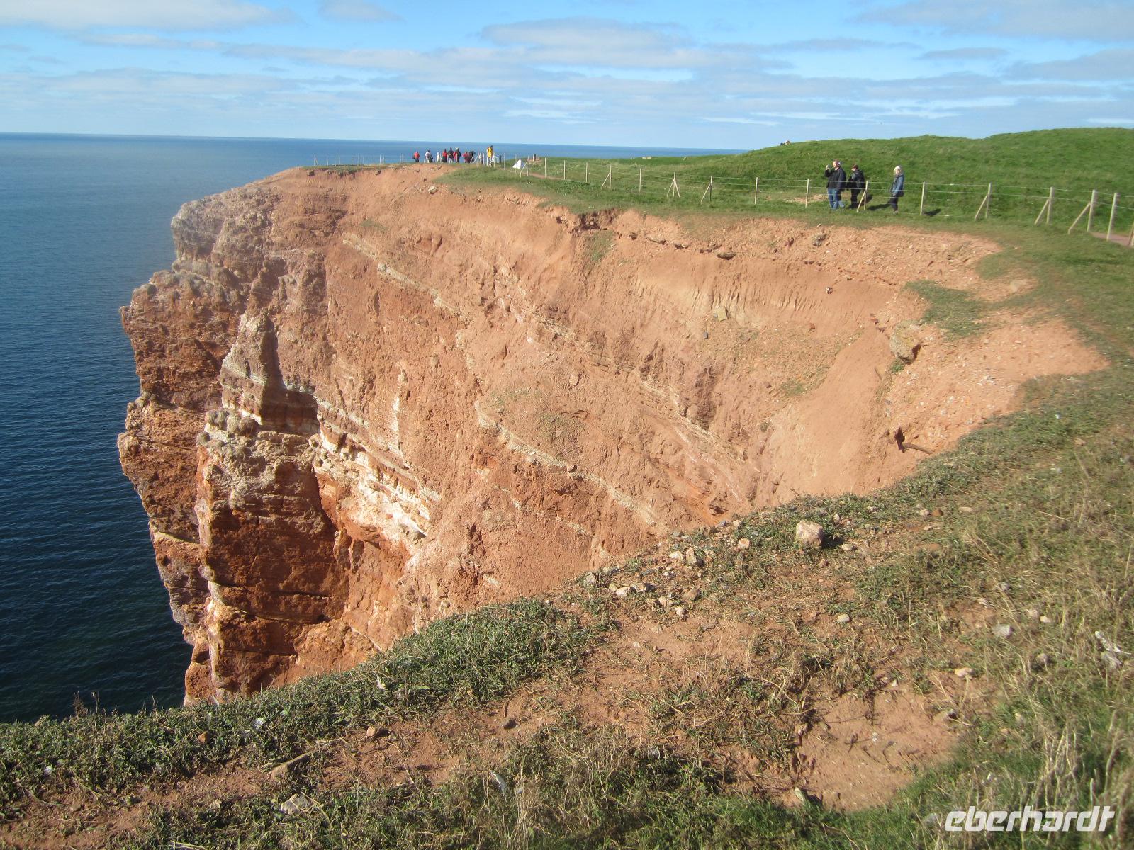 Nun sind es nur einige Meter, um zur Insel zu kommen. Von der Unterstadt kommen wir mit einem Fahrstuhl oder auch entlang der Treppen zum Oberland. Eines der interessanten Wege ist der Klippen-Randweg. Auf dem gelangen wir zu dem bekannten Lummenfelsen, in dem die selten gewordenen pinguinähnlichen Seevögel nisten. Im Juni kann man den Lummensprung in den Abendstunden beobachten, wenn sich die Jungen von den Klippen in die Tiefe stürzen. Einige Meter weiter kommen wir zur "Langen Anna", eine mächtige von der naturgeschaffenen Steinsäule und eines der Wahrzeichen von Helgoland ist.