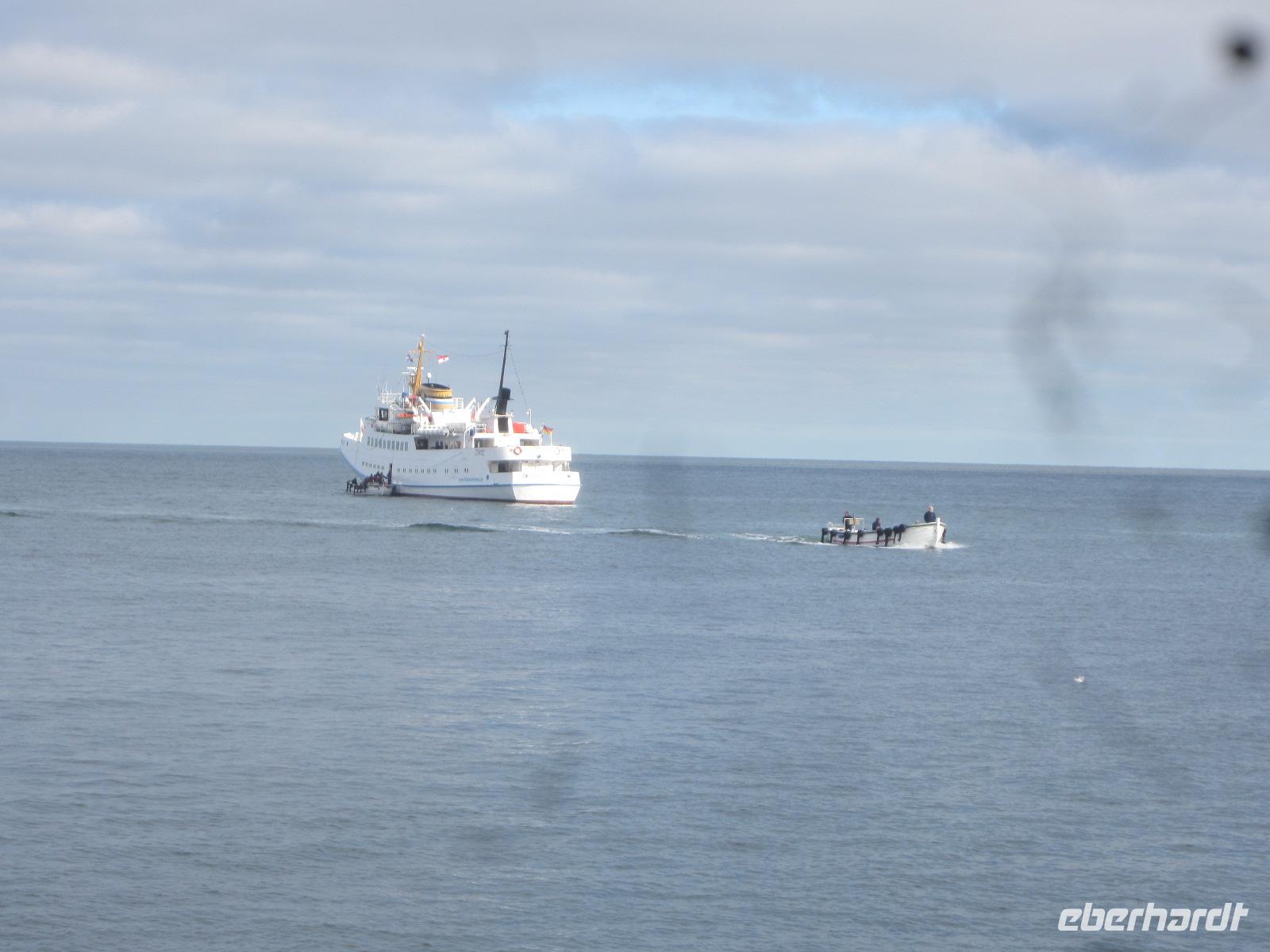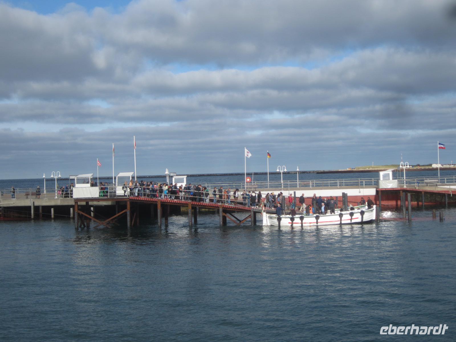 09.15 Uhr geht es mit der „Lady von Büsum" nach Helgoland. Im Oberdeck sind für uns Plätze reserviert und mit "Erberhardt-Travel" gekennzeichnet. Rund drei Stunden fahren wir die rund 50 km bis zum Roten Fels in der Brandung - Deutschlands einziger Hochseeinsel. Einigen Gästen ist es ein wenig "mulmig" zumute. Vor der Insel werden wir ausbooten, (eine Touristenattraktion). Dabei wissen wir doch, dass wir uns nur in die Arme der starken Matrosen fallen lassen müssen. Also, es kann kein Problem sein. So kommt es auch. Von Weitem haben wir schon einen Blick auf die Insel und die Düne, als die Börteboote auf unsere "Lady" zu kommen. Schnell und unkompliziert geht das Ausbooten vonstatten.