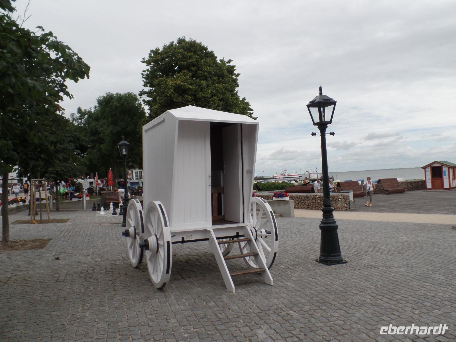 Dort steht schon die bestellte Kutsche bereit, sie wird uns über die Hallig bringen.