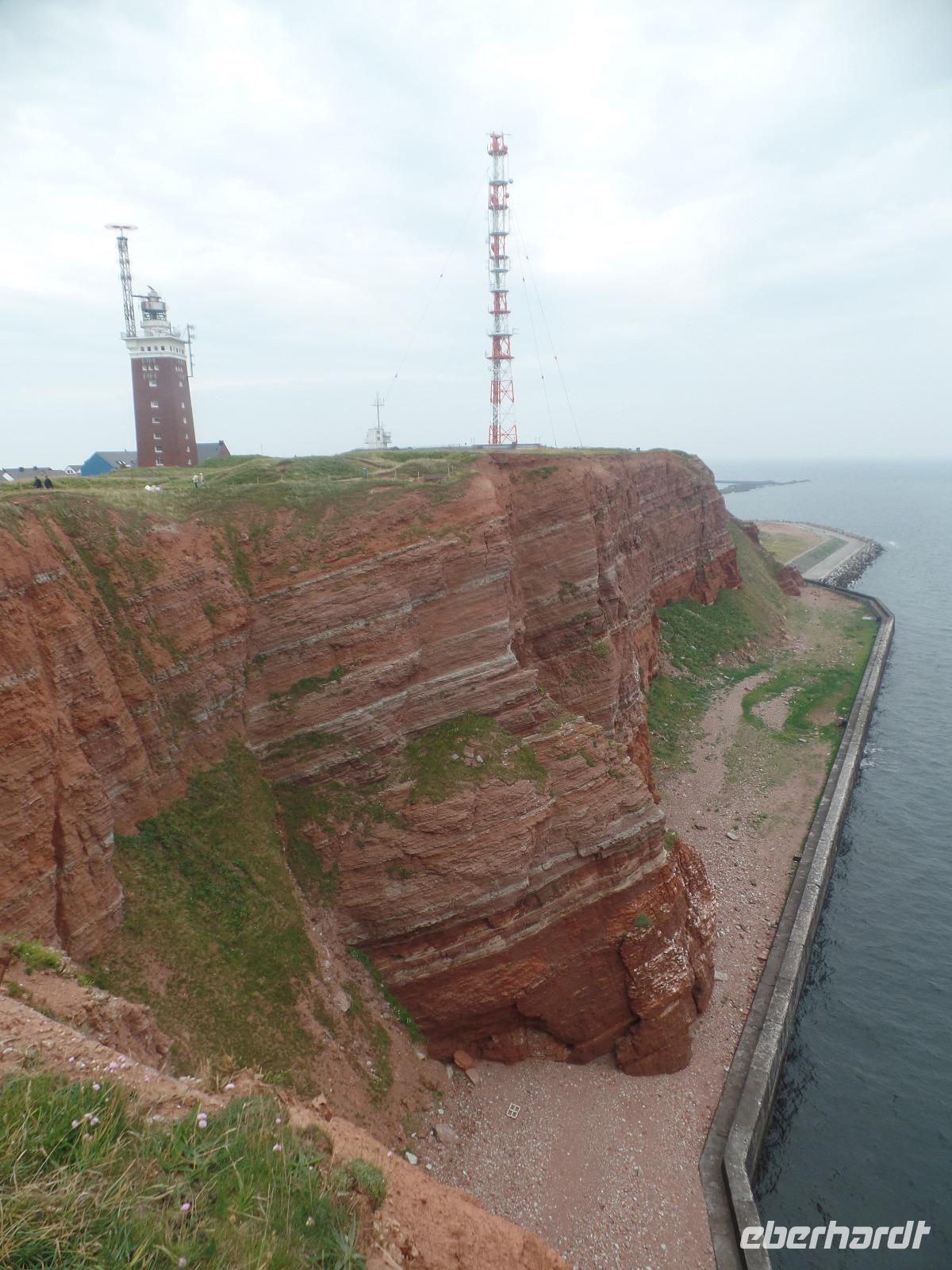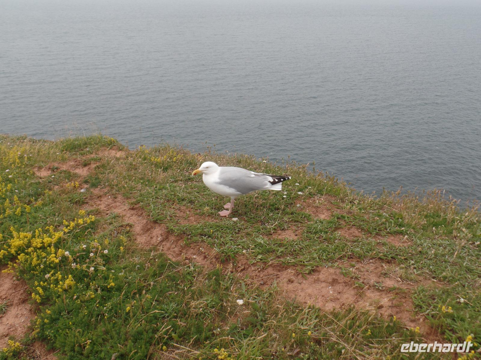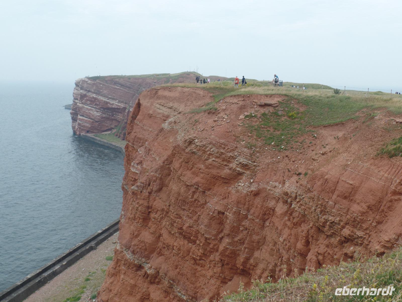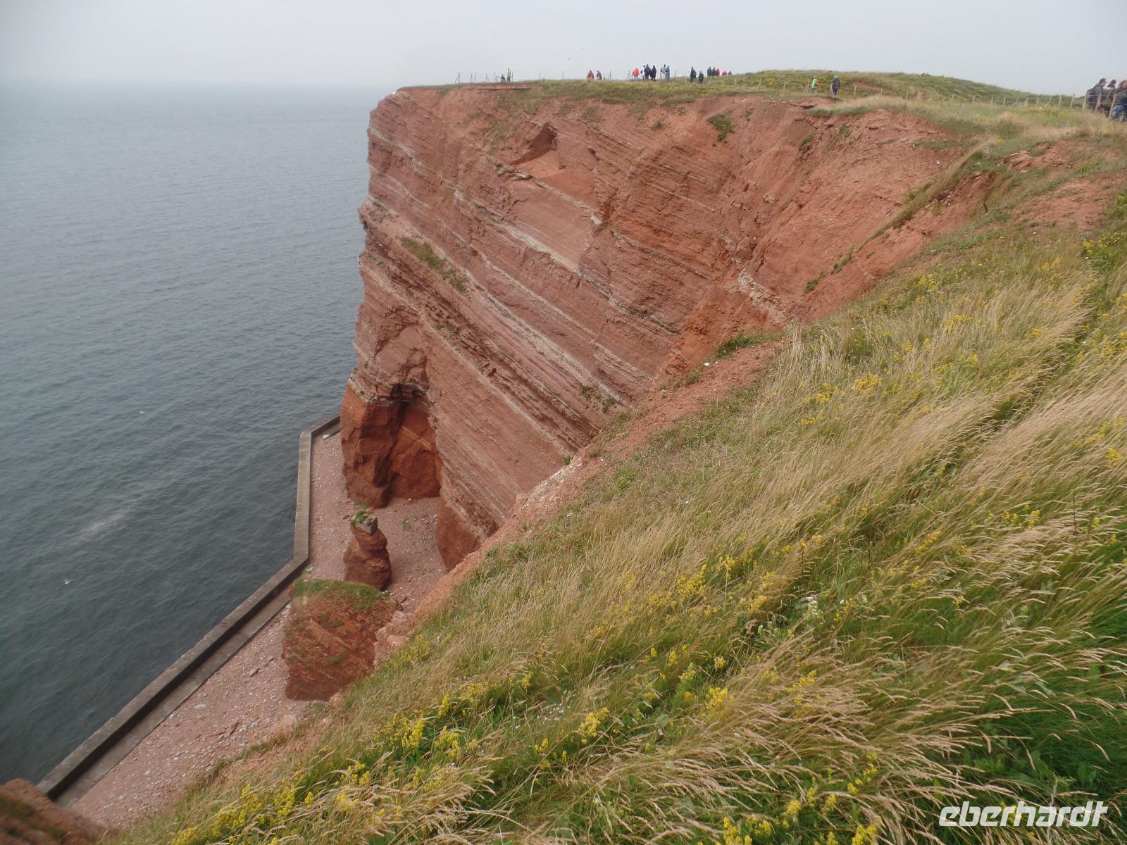 Vom Unterland erreichten wir mit dem Fahrstuhl das Oberland. Von hier gelangt man über den Klippen-Randweg zu den bekannten Lummenfelsen. Es ist das kleinste Natur- und Vogelschutzgebiet Deutschlands, in dem selten gewordene Seevögel nisten. Im Juni kann man beobachten, wie sich die noch flugunfähigen Lummenküken aus dem Brutfelsen in das Meer stürzen.
