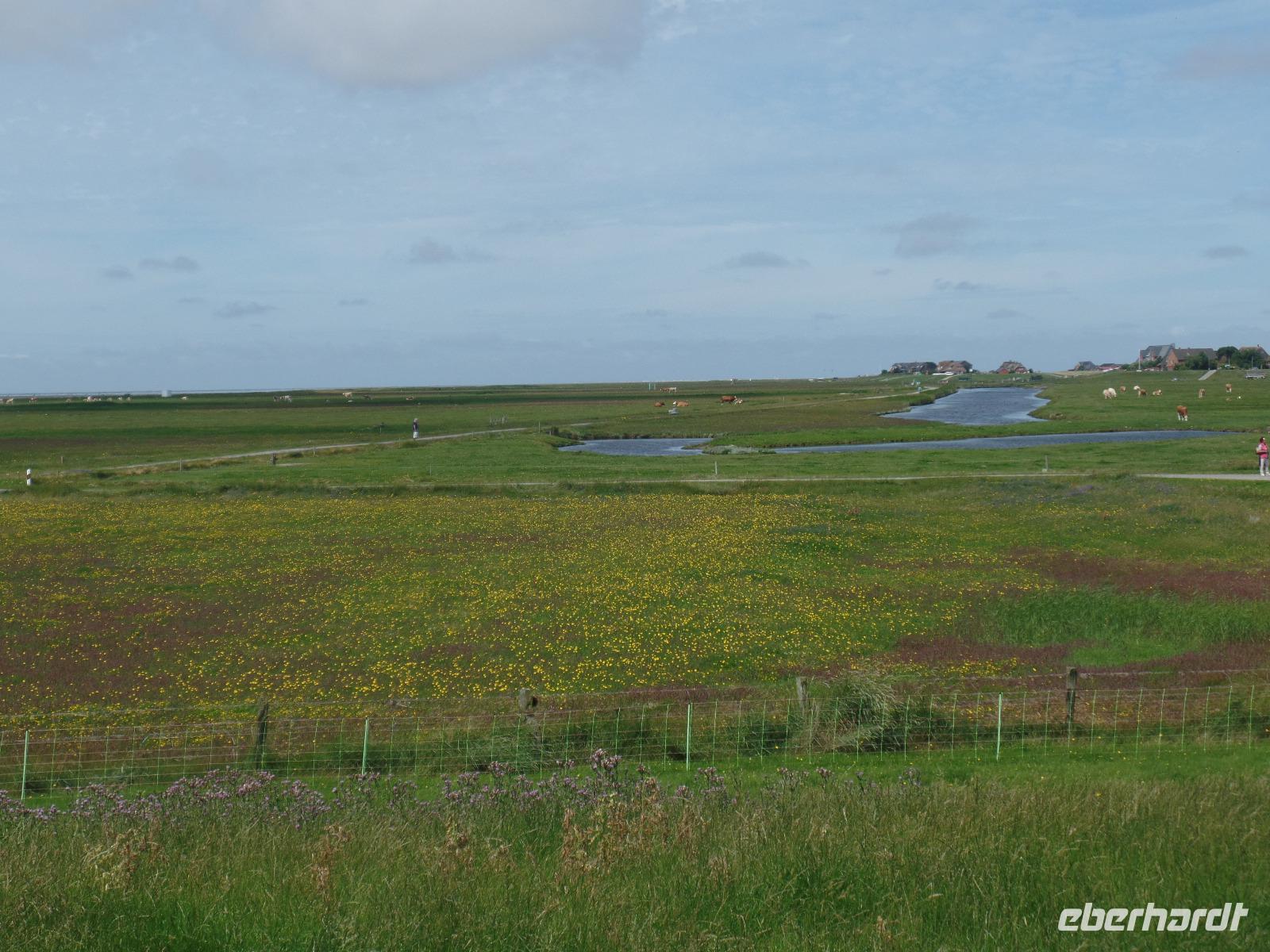 Oben am Deich sieht man die Warften der Halligen, die wie Burgen aus dem Meer ragen.