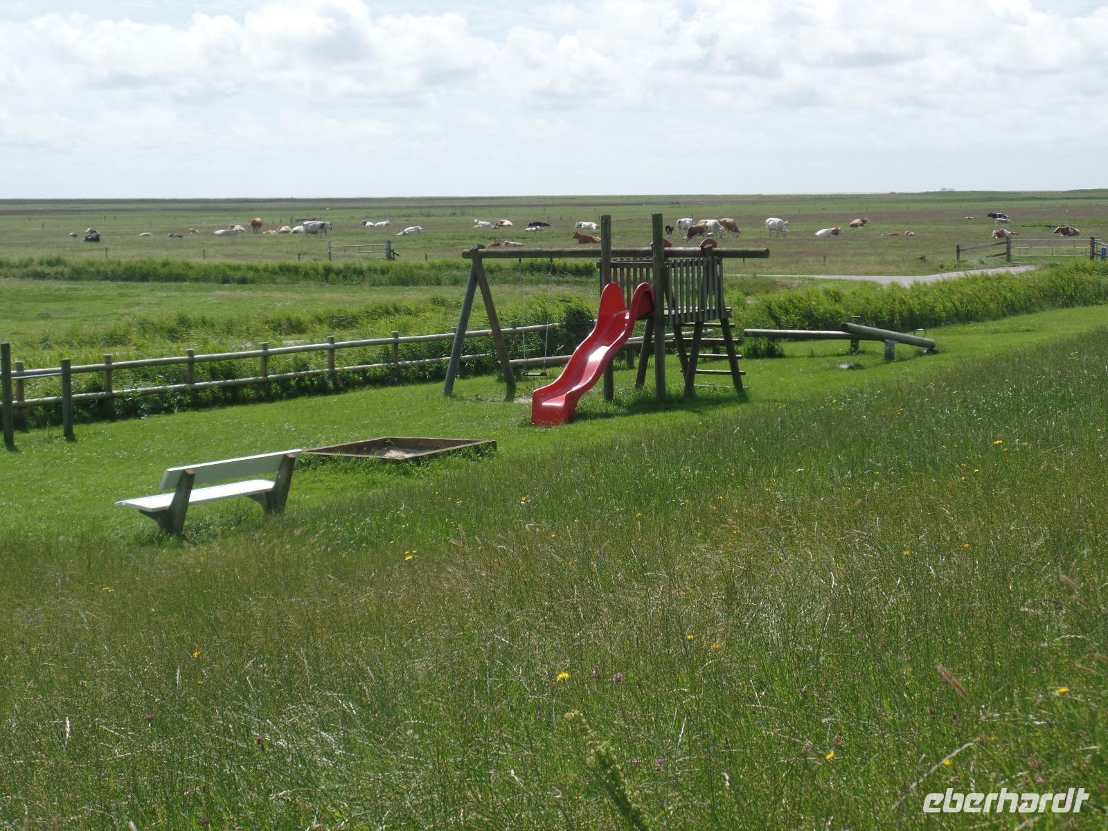 Wir machten noch einen kurzen Halt, um auf dem Deich zu gehen. Bei wunderschönem Wetter hatten wir Glück, die beiden Inseln Sylt und Amrum zu sehen.