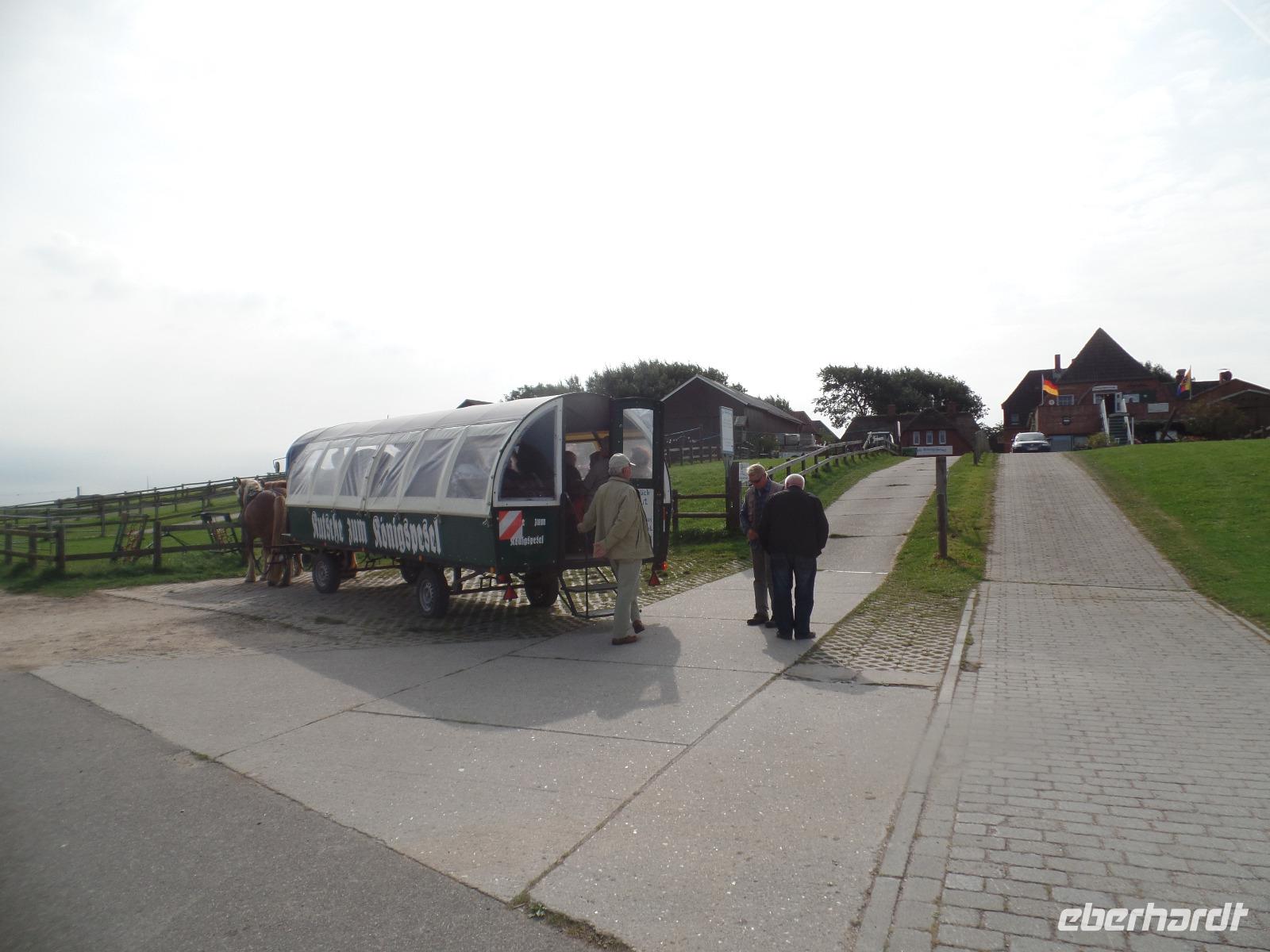 Am Anleger steht schon die bestellte Kutsche bereit, sie wird uns über die Hallig bringen.