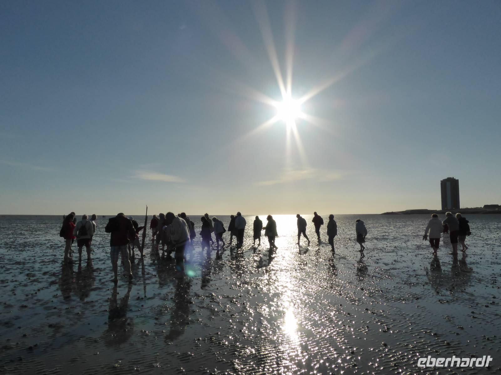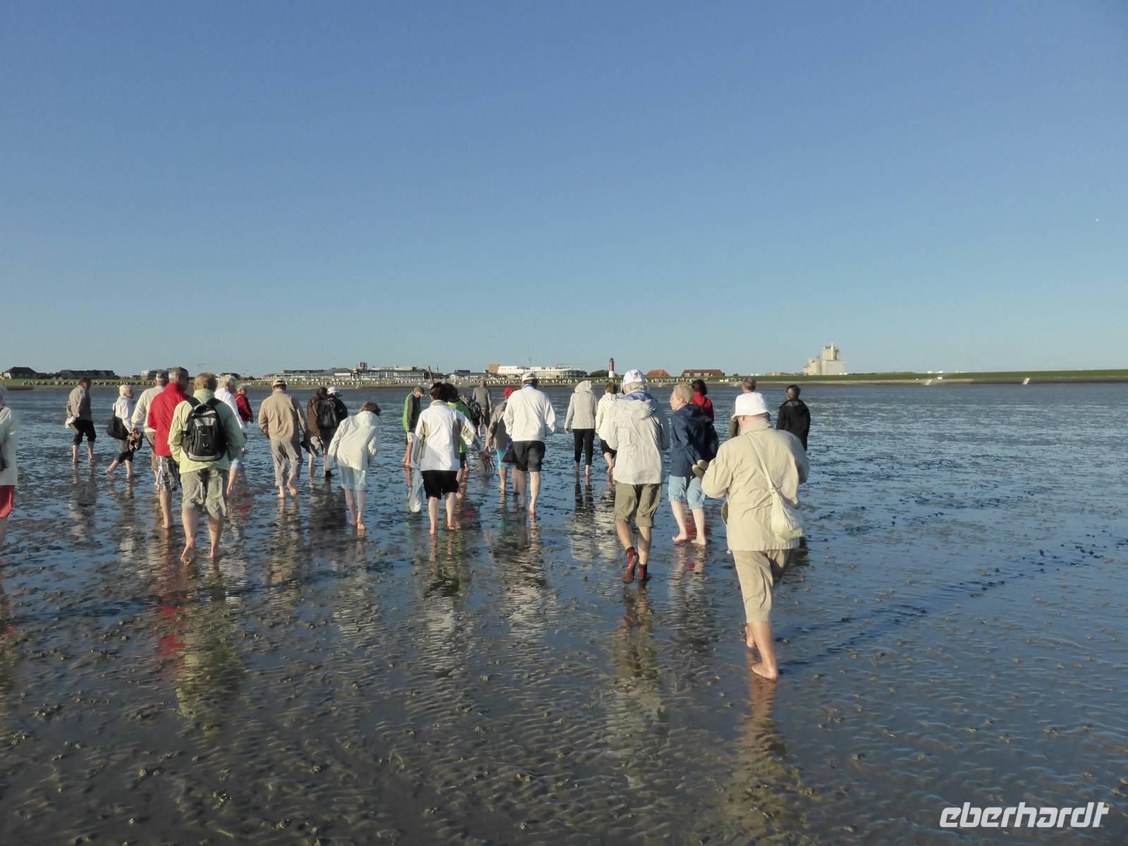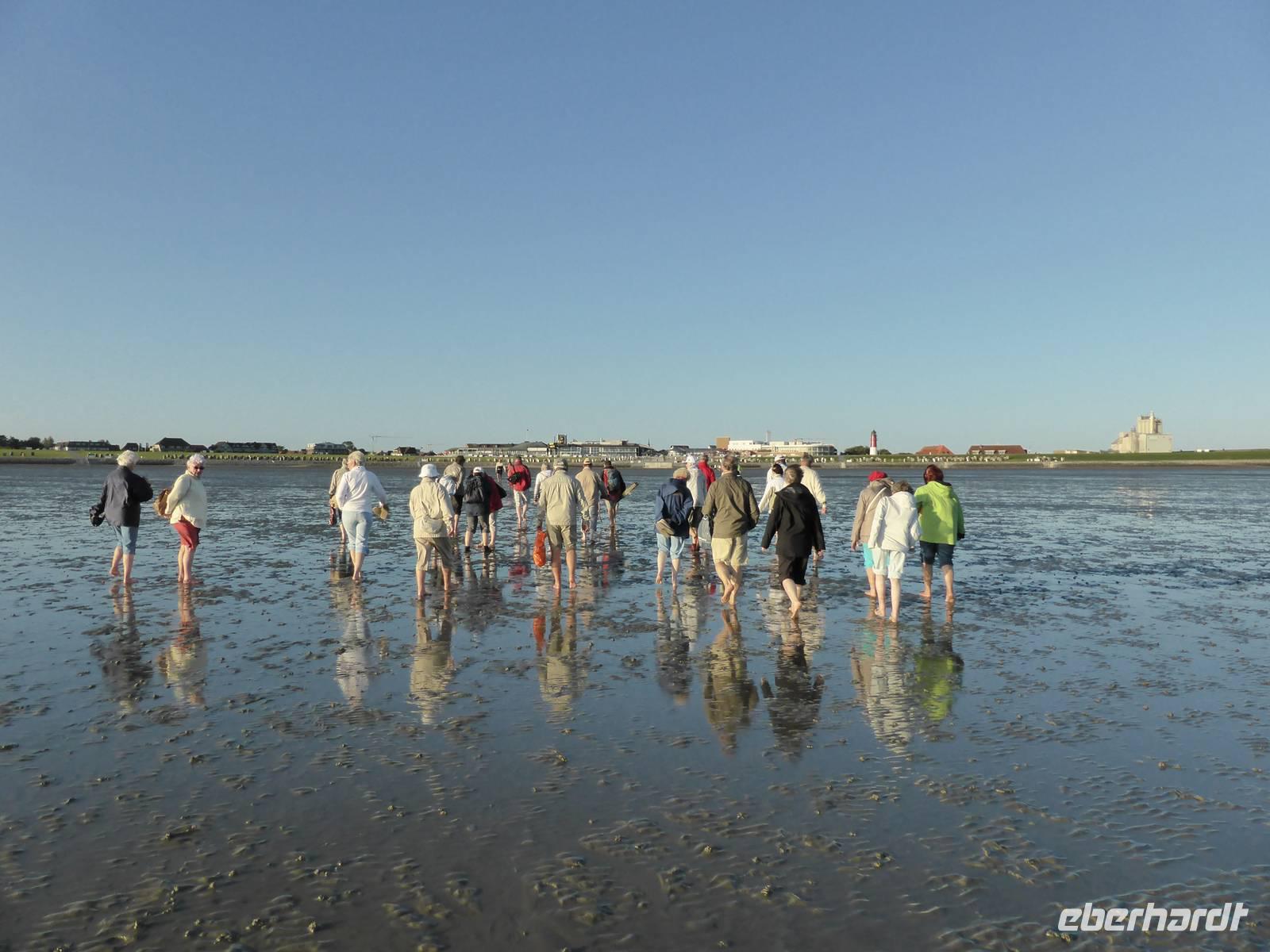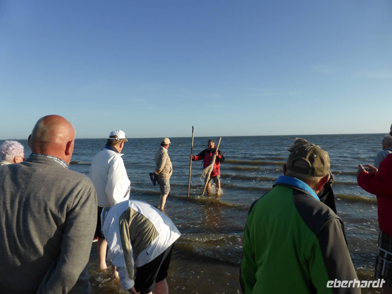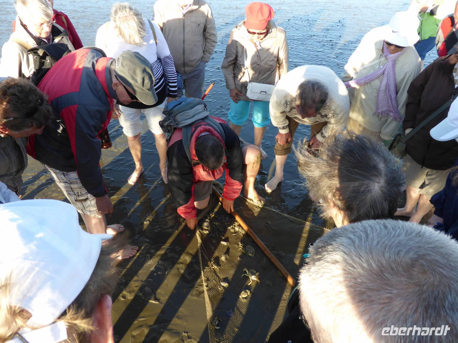 Zurück im Hotel stärkten wir uns beim Essen, um anschließend das Watt zu erleben. Wir wanderten durch das größte zusammenhängende Wattgebiet der Welt Das Watt lebt von den Gezeiten und ist ein einzigartiger Lebensraum zahlreicher Tiere. Bodo erklärte uns sehr anschaulich einzelne Lebewesen - wie den Wattwurm und das Leben der Herzmuscheln - die Entstehung von Ebbe und Flut und versuchte mit uns Krabben zu fischen. Die Wattwanderung war für alle ein Erlebnis.