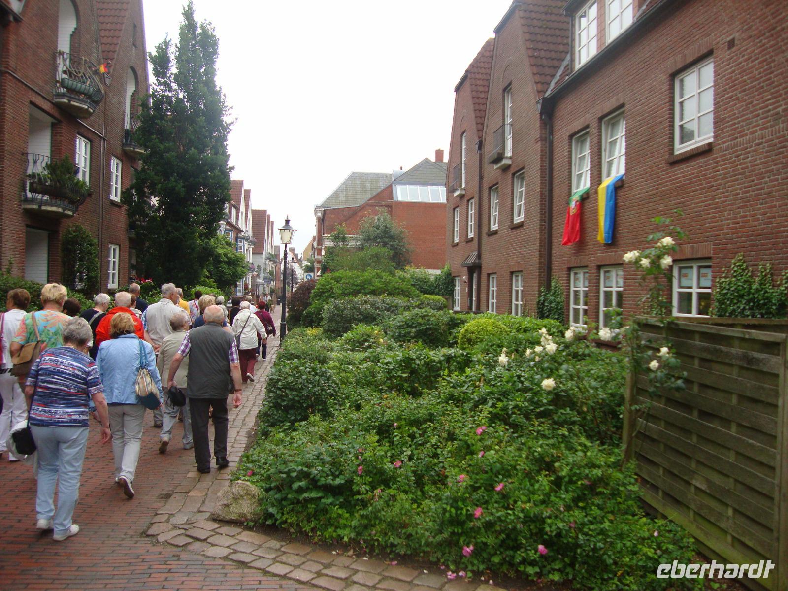 Nach dem vorzüglichen Frühstück begrüßten wir unsere Gästeführerin,Frau Schacht, welche uns ihre Heimatstadt und die bekanntesten Sehenswürdigkeiten zeigte und erklärte. Husum hat zwei Häfen, neben dem Außenhafen, den fotogenen Innenhafen, Kutter und Kaufmannshäuser bestimmen hier das Bild, es gibt eine alte Werft und eine Slipanlage. Auf dem Sockel des Marktbrunnens thront Tine, das heimliche Wahrzeichen der Stadt und im Haus nr.9 wurde Theodor Storm geboren. Weiter ging unser Spaziergang durch die Wasserreihe. Im Haus Nr.31 lebte der berühmte Sohn der Stadt von 1866-80 mit seiner Familie. Heute sind drei Räume als Museum eingerichtet, mit Möbeln und Bildern aus seinem Nachlass. Im Garten erstrahlen Blumen in vielfältiger Pracht. Der Besuch in der Marienkirche am Markt, mit dem 31 m hohen Turm, bildete den Abschluß unseres Rundganges durch die "Graue Stadt am Meer", wie sie von Theodor Storm genannt wurde. Anschließend verabschiedeten wir uns von der Gästeführerin, Frau Schacht, ganz herzlich und jeder konnte die Freizeit nach seinen Wünschen gestalten.