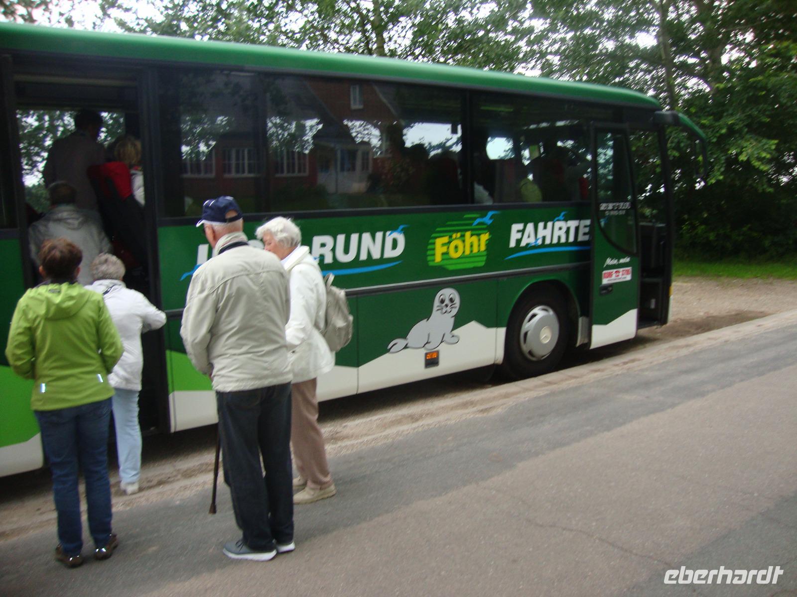 Nach dem gehaltvollen Frühstück fuhren wir heute mit unserem Bus bis nach Dagebüll. Lange hatte Dagebüll den Ruf, ein "Parkplatz mit Fähranschluss" zu sein. Doch das "Tor zu Inseln und Halligen" hat dazugelernt. Der neue Großparkplatz für Autos hält das Dorf frei von Blechlawinen, dem geruhsamen Ort mit einem Deich, Reetdachkaten und dem Marschland. Wer mit der Fähre ankommt, so wie wir, landet in Wyk, einem der ältesten Seebäder. Von da aus starteten wir zu einer rund zweistündigen Inselrundfahrt, bei der man die Insel kennenlernt. In Süderende besuchten wir die alte Kirche mit dem Friedhof und den gewaltigen Grabsteinen, wo die Lebensgeschichte der Verstorbenen in Stein gemeiselt ist. Anschließend fuhren wir bis zum Deich, wo viele Wattwanderer unterwegs nach Amrum waren. Leider fing es an zu regnen, was sich den ganzen Nachmittag fortsetzte, so das ein Bummel in Wyk nicht viel Freude bereitete. Alle waren froh als wir mit der Fähre wieder zurück nach Dagebüll fuhren, wo unser Chauffeur Holger bereits mit dem Bus auf uns wartete. Leider trübte das schlechte Wetter unseren ansonsten sehr schönen Tagesausflug.