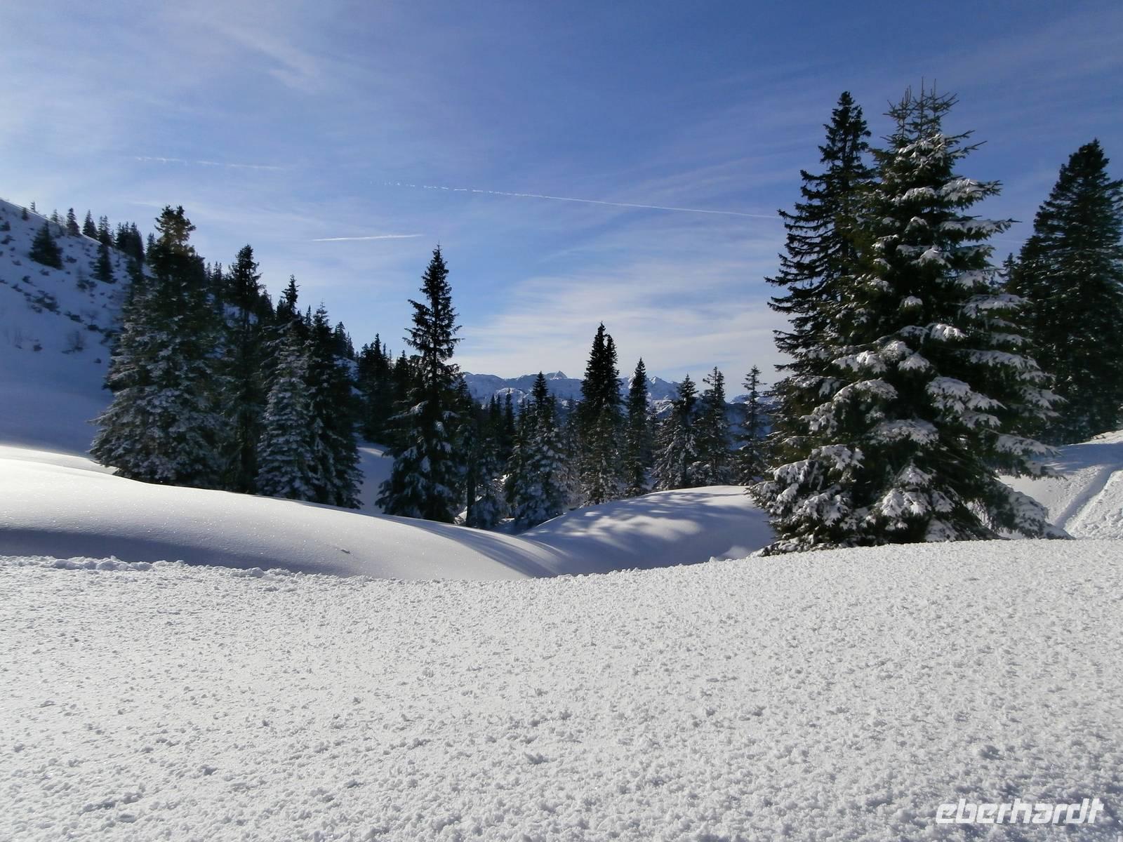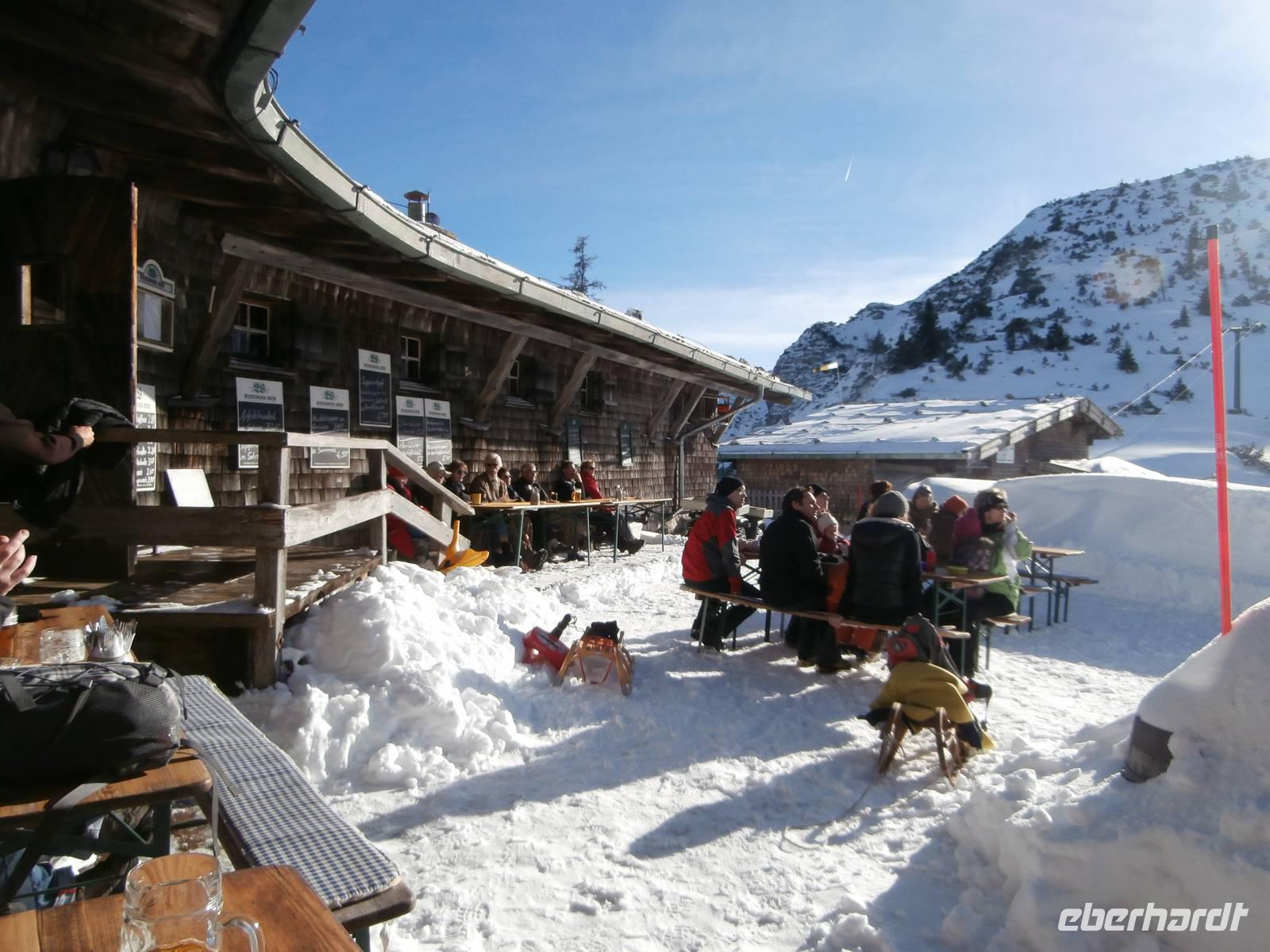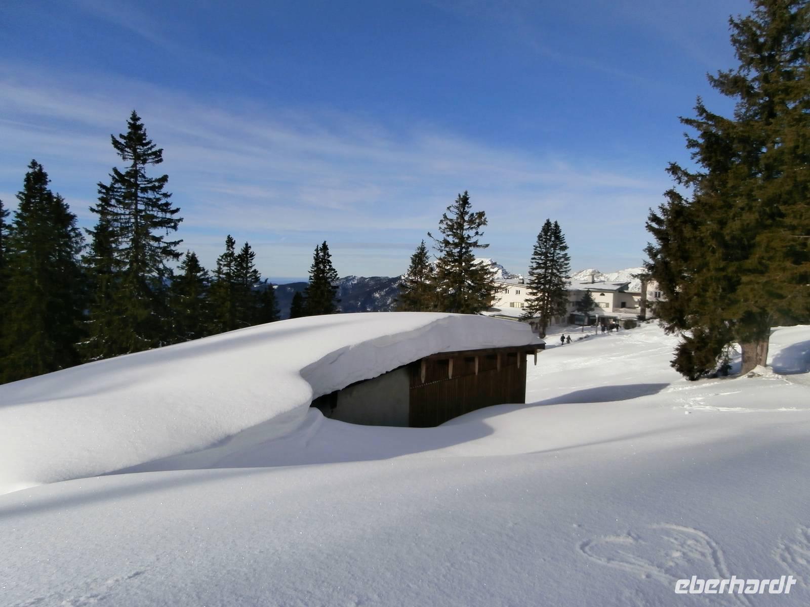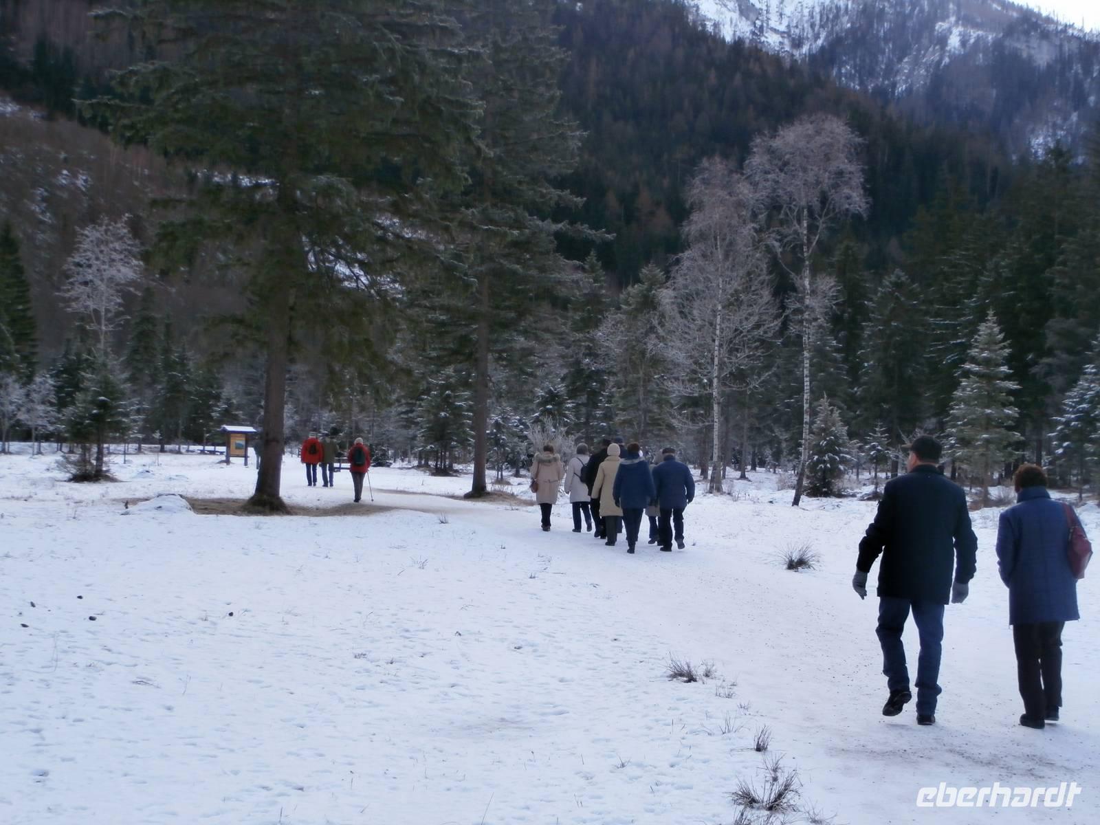 Über Wetter spricht man nicht, wir haben es für uns gemietet das schöne Wetter. Die Enzianbrennerei Grassl besuchen wir am Vormittag, hier erfahren wir alles über die Enzianwurzel, die die Grundlage für hervorragende Brände ist. Nach der Verkostung kann kräftig eingekauft werden, schließlich möchten wir ja auch den Daheimgebliebenen was mitbringen. Eine schöne Panoramafahrt erleben wir hinauf zum Rossfeld, alle Achtung wie Andreas unseren Dreiachser Bus da durch manövriert. Die höchstgelegene Gaststätte, die man mit Bus oder Auto anfahren kann, die Ahornkaser, erreichen wir mit dem Bus, bis vors Restaurant bringt uns Andreas. Hier gibt es herrliche Aussichten im Pulverschnee, Essen und Getränke, auch ein Gruppenfoto schießen wir hier vor der Gaststätte.