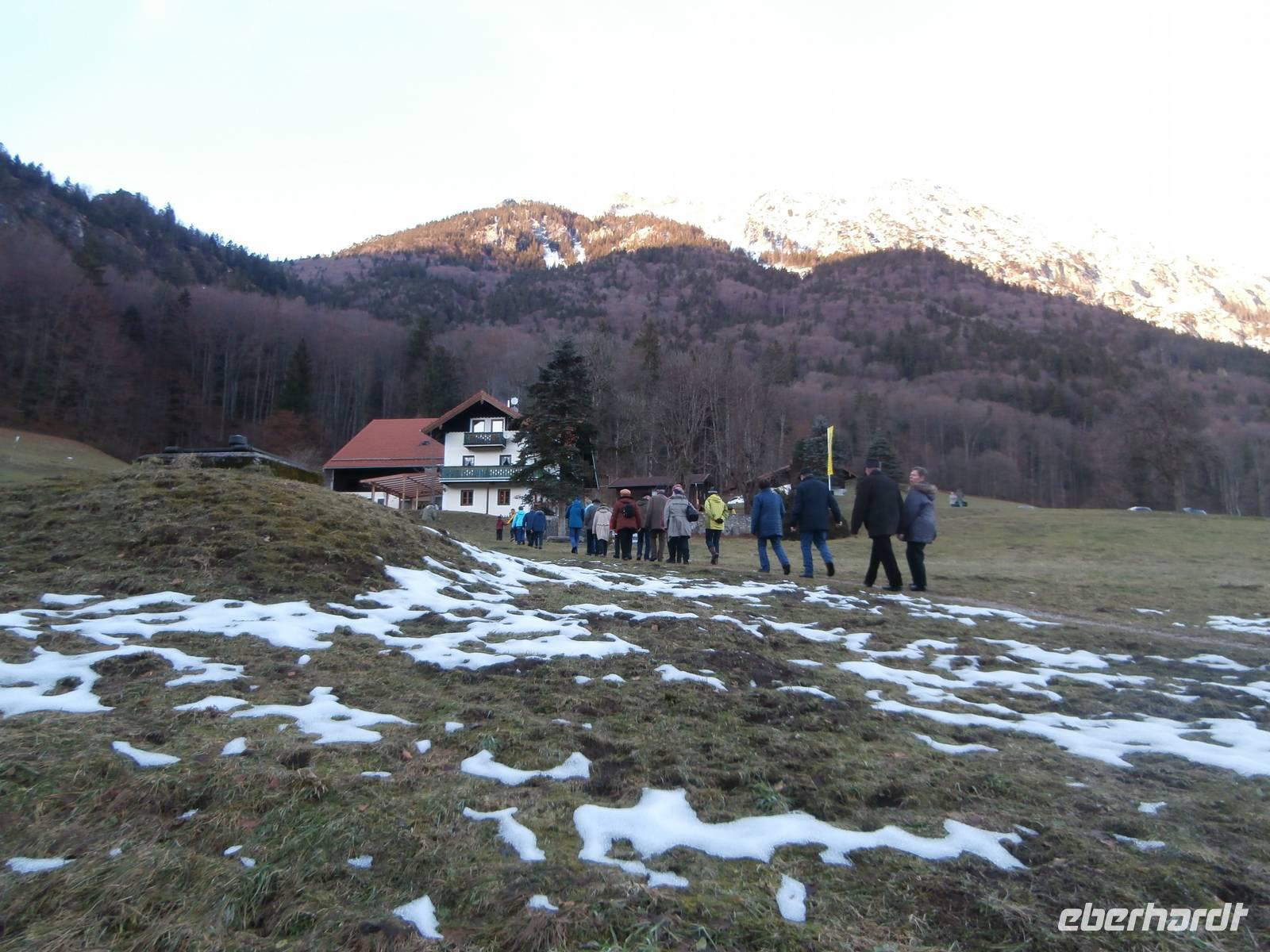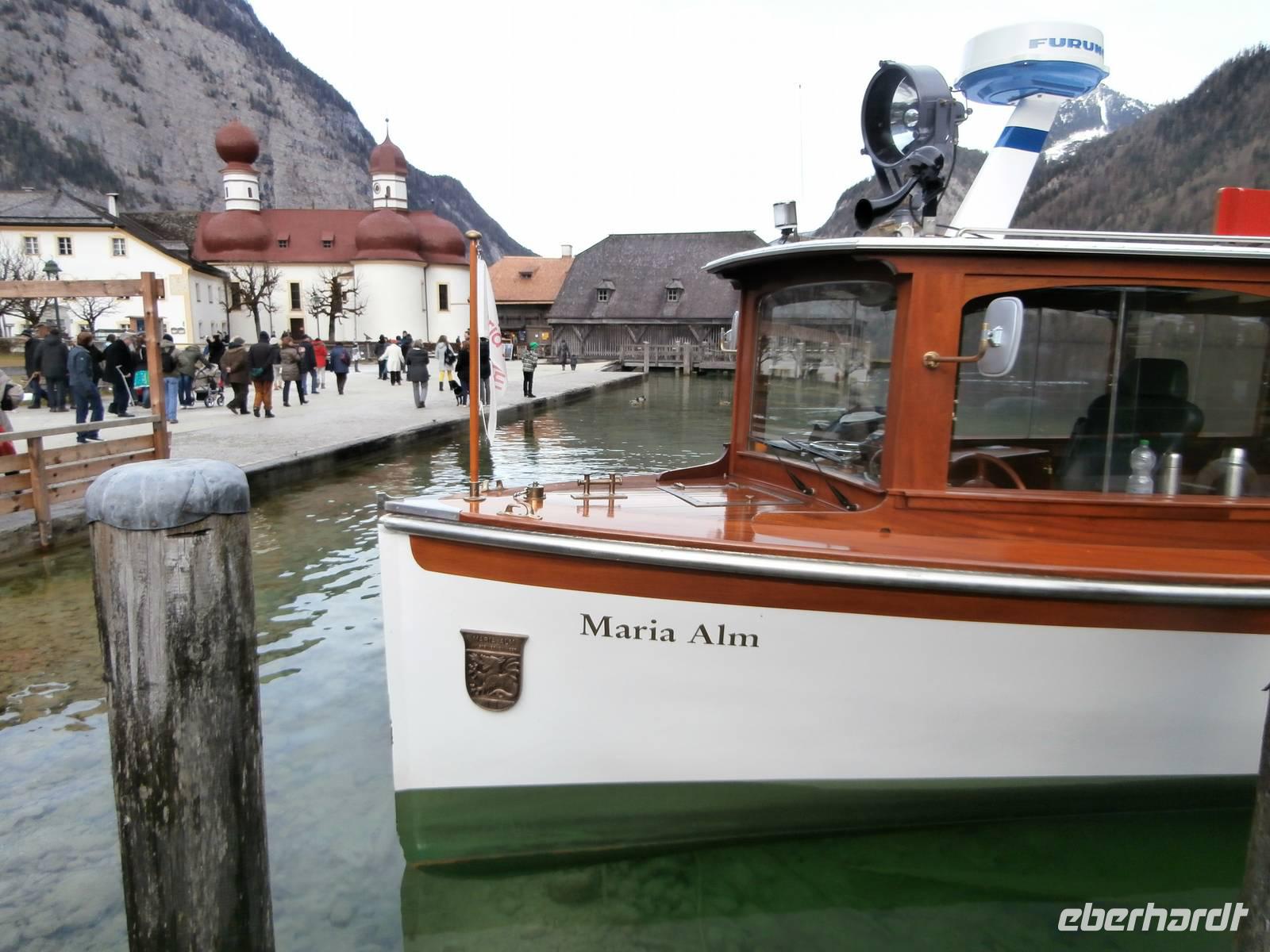 Unser spätes Frühstück macht Schwung und so fahren wir nach Ramsau zum Nationalparkhaus und von hier brechen wir zur Neujahrswanderung zum Wildgehege mit Rotwild auf. Leider ist erst am Nachmittag Fütterung und so sehen wir keine Tiere, aber die Luft und Aussicht ist Bestens. Gegen Mittag erreichen wir Schönau am Königssee, hier möchten wir die Große Neujahrsparty erleben. Wir entschließen uns für eine Bootsfahrt zur Kapelle in St. Bartholomä, unterwegs präsentiert der Kapitän uns ein Stück auf der Trompete, er lässt uns ein Echo in der Ferne hören.