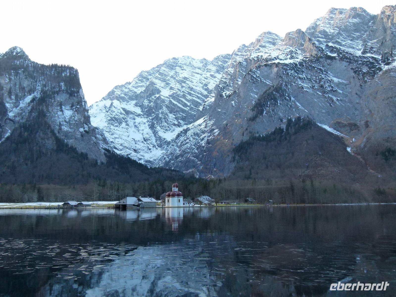 Nach dem späten Neujahrsfrühstück fahren wir zum im Mai 2013 eröffneten Informations- und Bildungszentrum des Nationalparks Berchtesgaden. Das „Haus der Berge" hat eine moderne Fassade aus regionalen, natürlichen Materialien, die natürliche Verwitterung des Materials soll den Grundgedanken des Nationalparks „Natur Natur sein lassen" widerspiegeln. In der Ausstellung „Vertikale Wildnis" lernen wir auf einer stetig ansteigenden Wanderung durch die Lebensräume Wasser, Wald, Alm und Fels die gesamte Bandbreite des Lebens im Nationalpark Berchtesgaden kennen. Im Café Spiesberger gibt es die berühmte Watzmannpraline und auch die Königsseepraline mit der Nachbildung von St. Bartholomä. Der in eine großartige Gebirgsszenerie eingebettet Königssee ist einer der Höhepunkte unserer Reise. Ringsum ist er von 1500 Meter hohen Kalkwänden eingeschlossen Die Fahrt mit dem Schiff über den Königssee ist fast ein Muss! An den Felswänden des Westufers bläst der Schiffer auf der Trompete - alle lauschen den faszinierenden Echo. Vor St. Bartholomä beobachten wir Rotwild, welches zu einer Futterstelle gekommen ist. Der ehemalige Bahnhof von Schönau ist heute ein gemütliches Lokal, wo wir uns gerne aufwärmen, bevor wir wieder zum Seelände gehen, um das Neujahrsfeuerwerk zu bestaunen. Ein schöner Abschluss dieser Silvesterreise, wie alle finden.