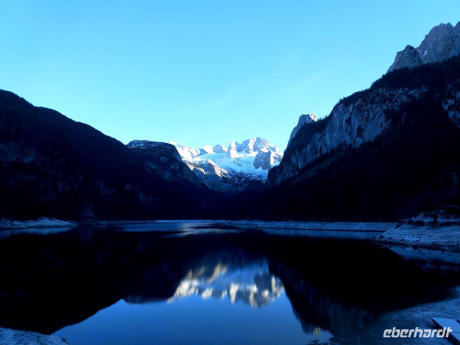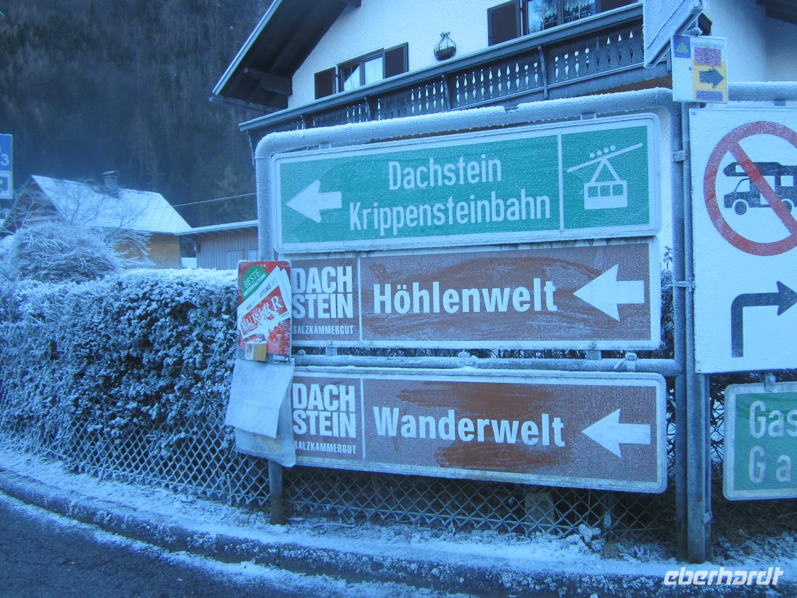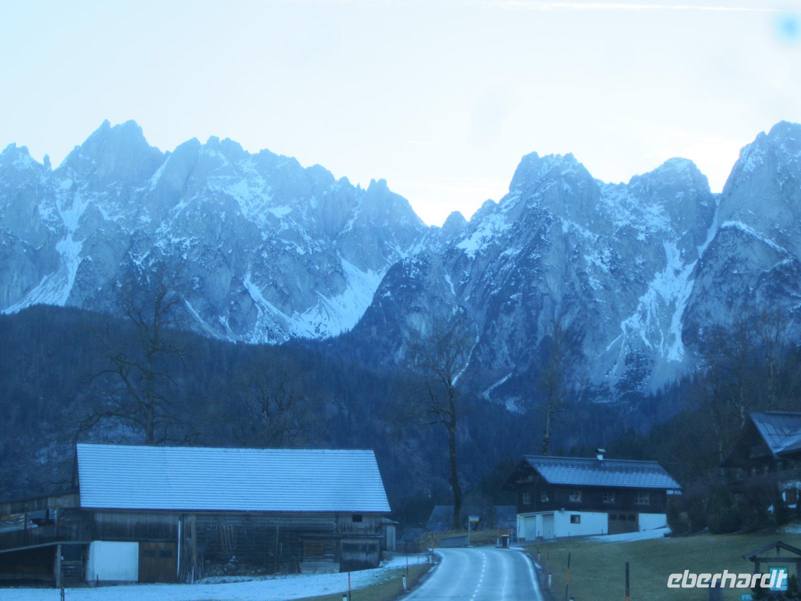 Zum Salzkammergut gehört auch Hallstatt, der Ort, der in China nachgebaut wurde und seit 1997 von der UNESCO zum Weltkulturerbe ernannt wurde. Auf dem schmalen Uferstreifen drängen sich die Häuser aneinander. Uns zeigt sich der Ort in Raureif gehüllt. Ein besonderer Anblick, den wir genießen. Wenn wir auch nur einen Teil des Salzkammergutes kennenlernen so können wir die Redewendung verstehen, "Wen die Götter lieben, den schicken sie ins Salzkammergut". Unsere weitere Fahrt wird uns über die Salzburger Dolomitenstraße führen. Doch bevor es so weit ist, planen wir einen kurzen Abstecher. Den Gosausee mit dem Blick zum Dachsteinmassiv wollen wir auf einem Bild festhalten. Der Blick war überwältigend und wird uns in Erinnerung bleiben. Danach fahren wir entlang der Salzburger Dolomitenstraße mit Blick auf die "Große Bischofsmütze" (2458 m). Unserer weitere Fahrt führt uns über den Pass Lueg, ein Teil einer alten Alpen-Transitroute, die heute ihre Bedeutung verloren hat.