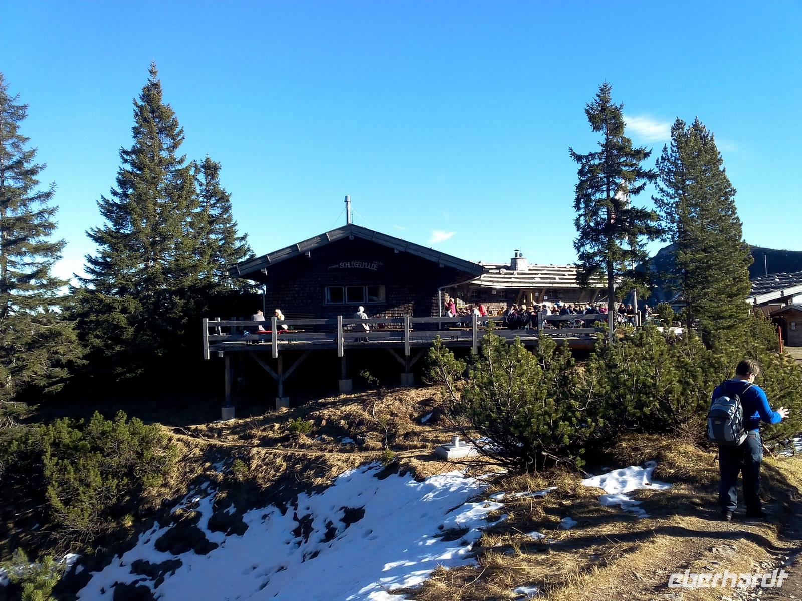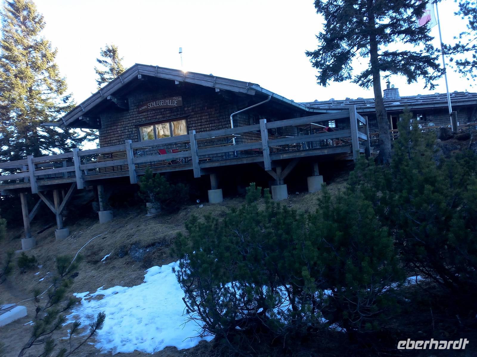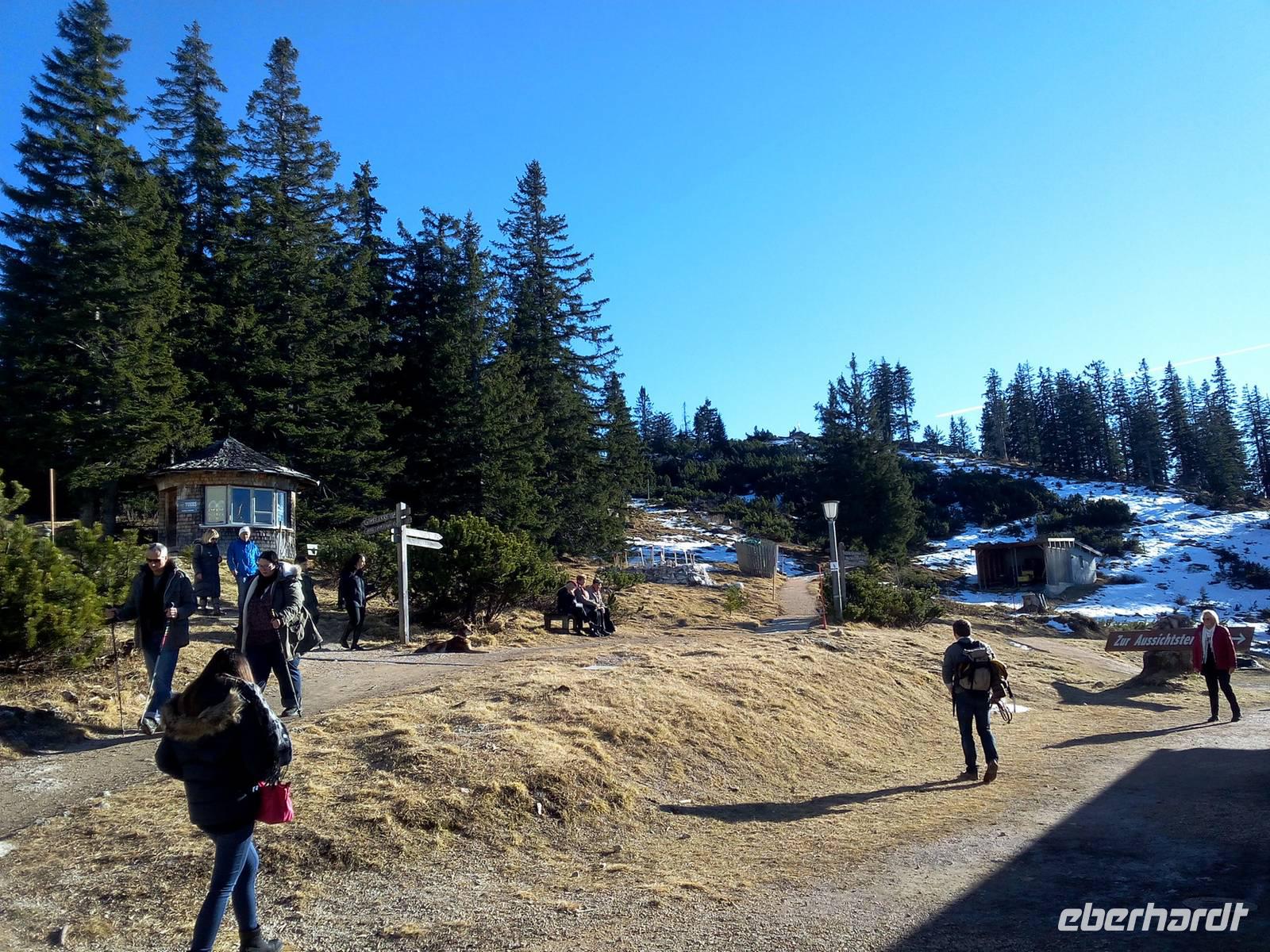 Wir haben frühlingshafte Temperaturen und einen blauen Himmel, ideale Bedingung für den Besuch des Hausberges von Bad Reichenhall. Ein Teil der Gruppe läuft zur Bergstation, der andere Teil nutzt den öffentlichen Bus. Gegen 10.00 starten wir unsere Auffahrt zum Predigtstuhl (1614m). Die legendäre Predigtstuhlbahn ist seit dem 01.Juli 1928 in Betrieb und ist damit die älteste im Original erhaltene, ganzjährig verkehrende Großkabinenseilbahn der Welt. Wir genießen diese Fahrt und haben tolle Blicke in die Umgebung. In 9 Minuten sind wir auf dem Berg. Die Gruppe trifft sich an der Bergstation und spaziert gemeinsam zur Almhütte Schlegelmulde. Der Weg ist ohne Steigung und in 15 Minuten ohne Probleme zu schaffen. Nach einem Mittagessen fährt der Teil der Gruppe zurück, der heute Nachmittag zur