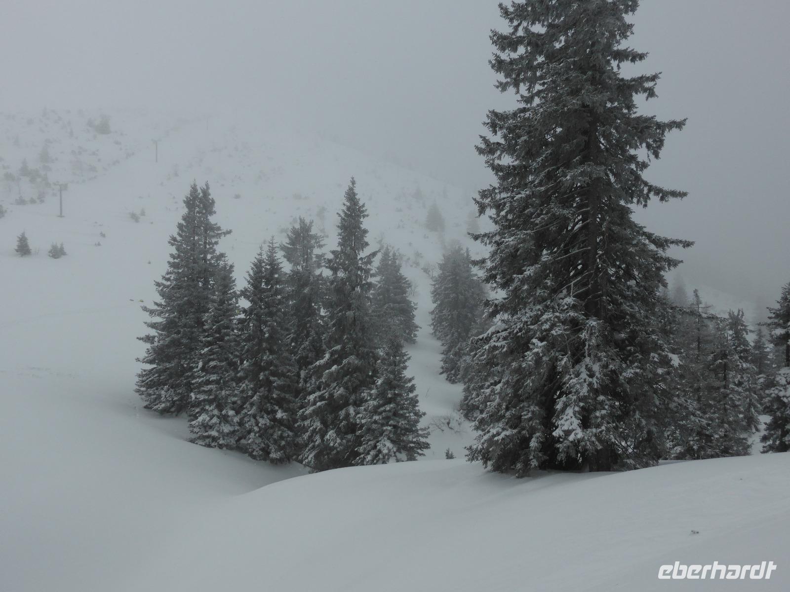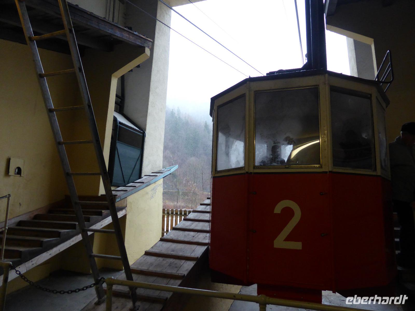 Leider war es erstmal mit dem schönen Wetter vorbei. Über Nacht hatte es geschneit, sodass wir die Landschaft in weißer Pracht bewundern konnten. Trotz der schlechten Sicht wagten wir die Auffahrt auf den Predigtstuhl. Unser Busfahrer Bernd hatte heute seinen freien Tag. Deshalb setzte sich Claudia ans Steuer und chauffierte uns zum Busparkplatz nach Bad Reichenhall. Die alternative Fahrt mit dem Linienbus hätte bei diesem Wetter nicht wirklich Spaß gemacht. Nach kurzer Fahrt und Spaziergang erreichten wir die Talstation der Predigtstuhlbahn. Diese Seilbahn ist seit 1928 in Betrieb, ist damit die älteste im Original erhaltene Großkabinenseilbahn der Welt und zählt zu den 10 spektakulärsten Seilbahnen. Sie wird gerne die Grand Dame der Alpen bezeichnet. Es sind nicht nur die Gondeln noch original, sonder auch die Seile. Mit zwei Fahrten je neun Minuten erreichten wir alle die Bergstation. Von dort begaben wir uns entlang des geräumten, aber schneebedekckten Winterwanderweges zur Almhütte „Schlegelmulde". Dieser kurze und leichte Spaziergang durch die herrliche Winterlandschaft war für alle ein Erlebnis auch wenn wir keine Sicht hatten. In der Almhütte wärmten wir uns bei Glühwein, Jägertee und Heißer Schokolade auf, bevor es zum Mittagessen in das Bergrestaurant an der Bergstation zurückging. Um 14:00 Uhr brachte die Gondel die letzten Gäste ins Tal. Im Anschluss hatten wir die Möglichkeit uns Bad Reichenhall anzuschauen. Diese Gelegenheit nutzten nicht nur vorrangig die Silvestergäste, sondern auch einige Weihnachtsgäste. Für die Rückfahrt ans Hotel stand Claudia mit dem Bus wieder bereit.