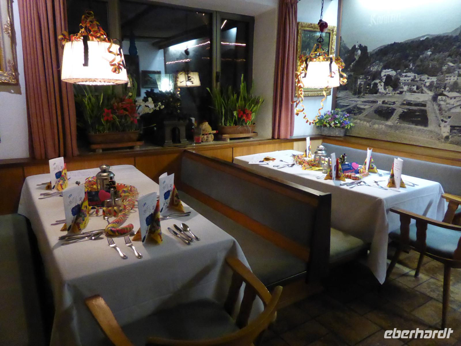 Im schön geschmückten Restaurant des Hotels mit musikalischer Unterhaltung durch Marlies ließen wir 2017 ausklingen und „rutschten" ins Jahr 2018 hinein. Marlies brachte uns mit ihren Witzen zum Lachen und ihrer Musik zum Schunkeln und Tanzen. Nach zahlreichen guten Glückwünschen und Zuprosten verfolgten wir noch das Feuerwerk über Bad Reichenhall - Prosit Neujahr!