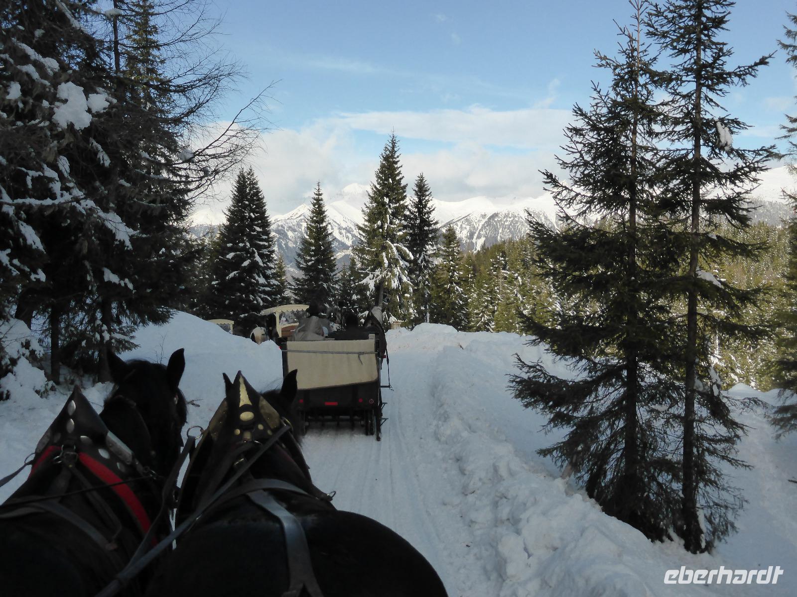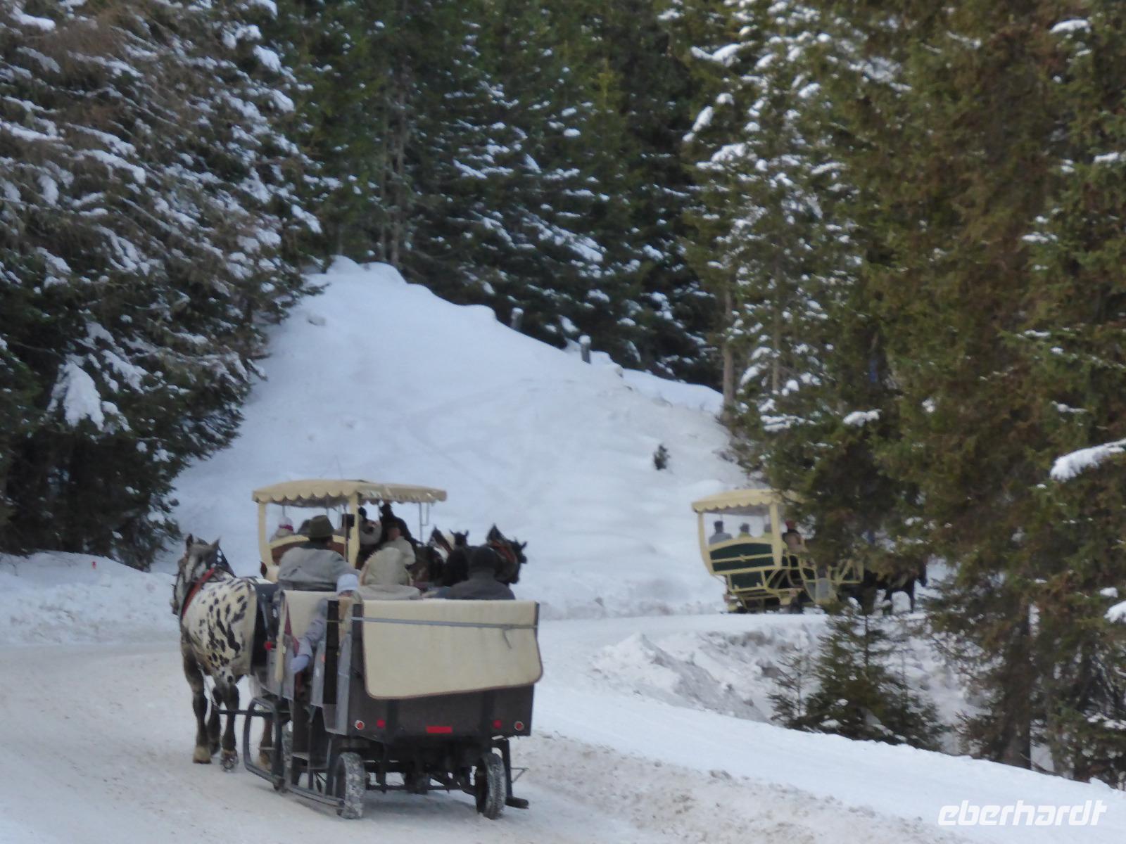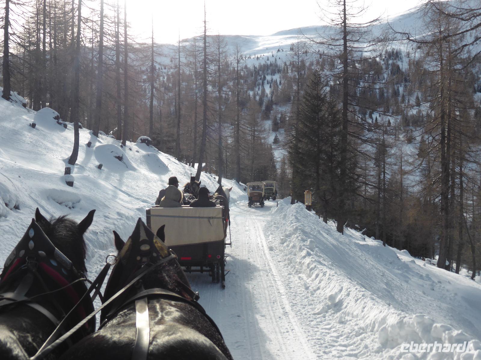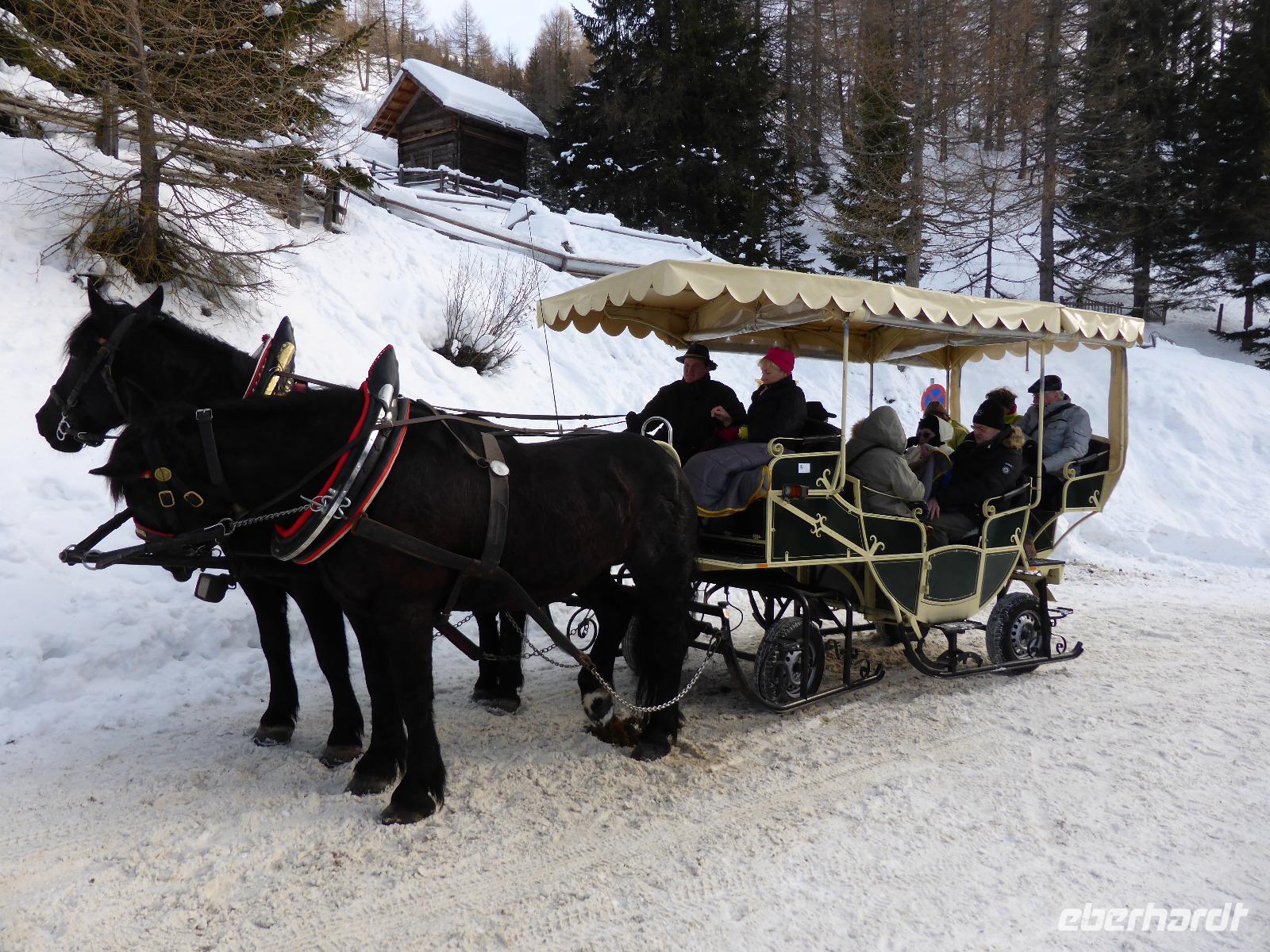 Pünktlich erschienen die Pferdekutschen. Warm zugedeckt kutschierten sie uns ca. 45 min durch einen wunderschönen Winterwald entlang des Katschberger Adventsweges zur Pritzhütte. Innerlich wärmten wir uns bei einem Schnapserl während eines Zwischenstopps auf. Angelangt in der Pritzhütte erwartete uns bereits eine deftige Kärtner Brettljause - lecker. Auf der Rückfahrt genossen wir nochmals den Winterwald sowie die Aussicht auf die umliegenden Berge.