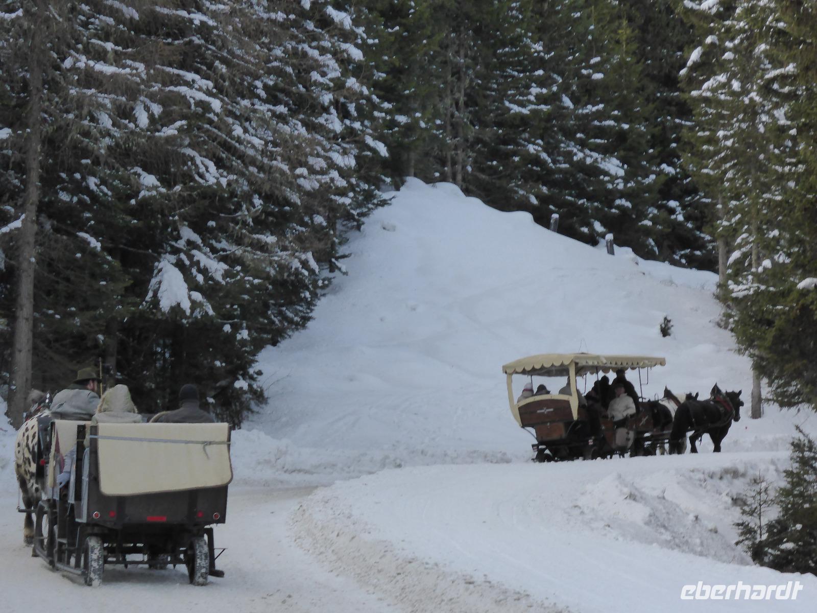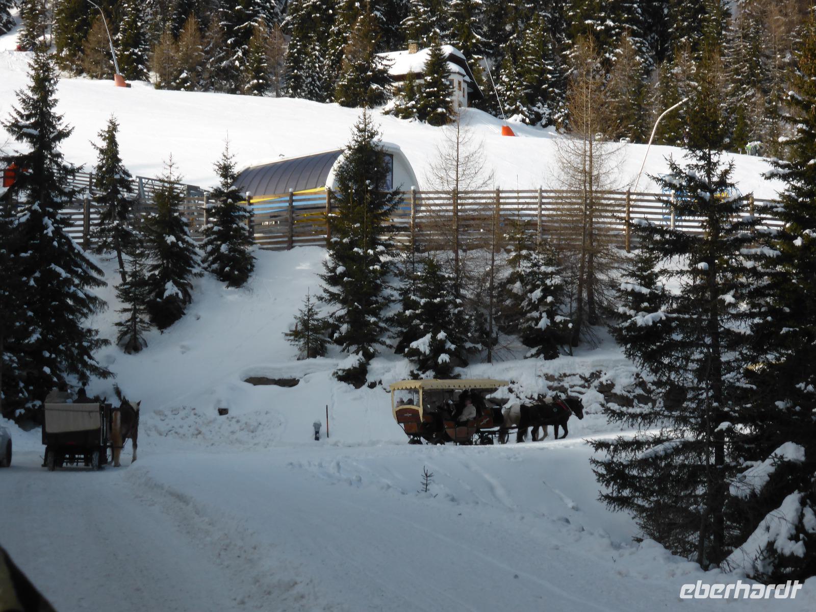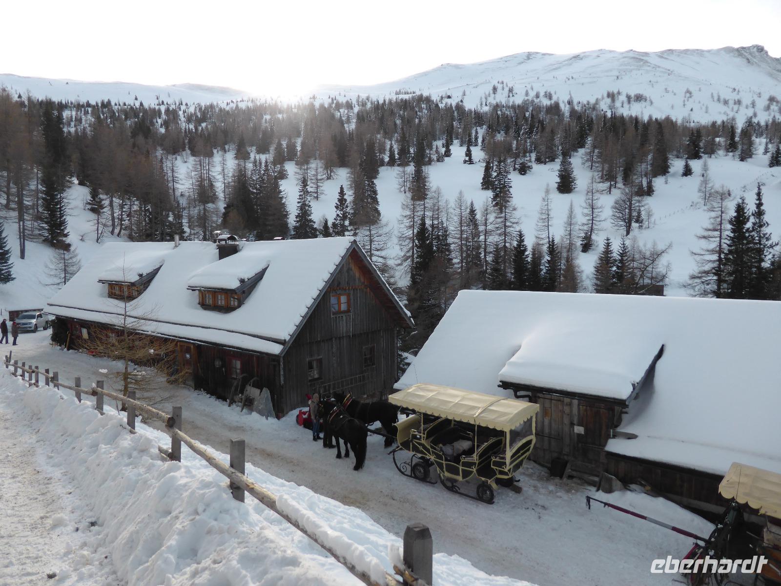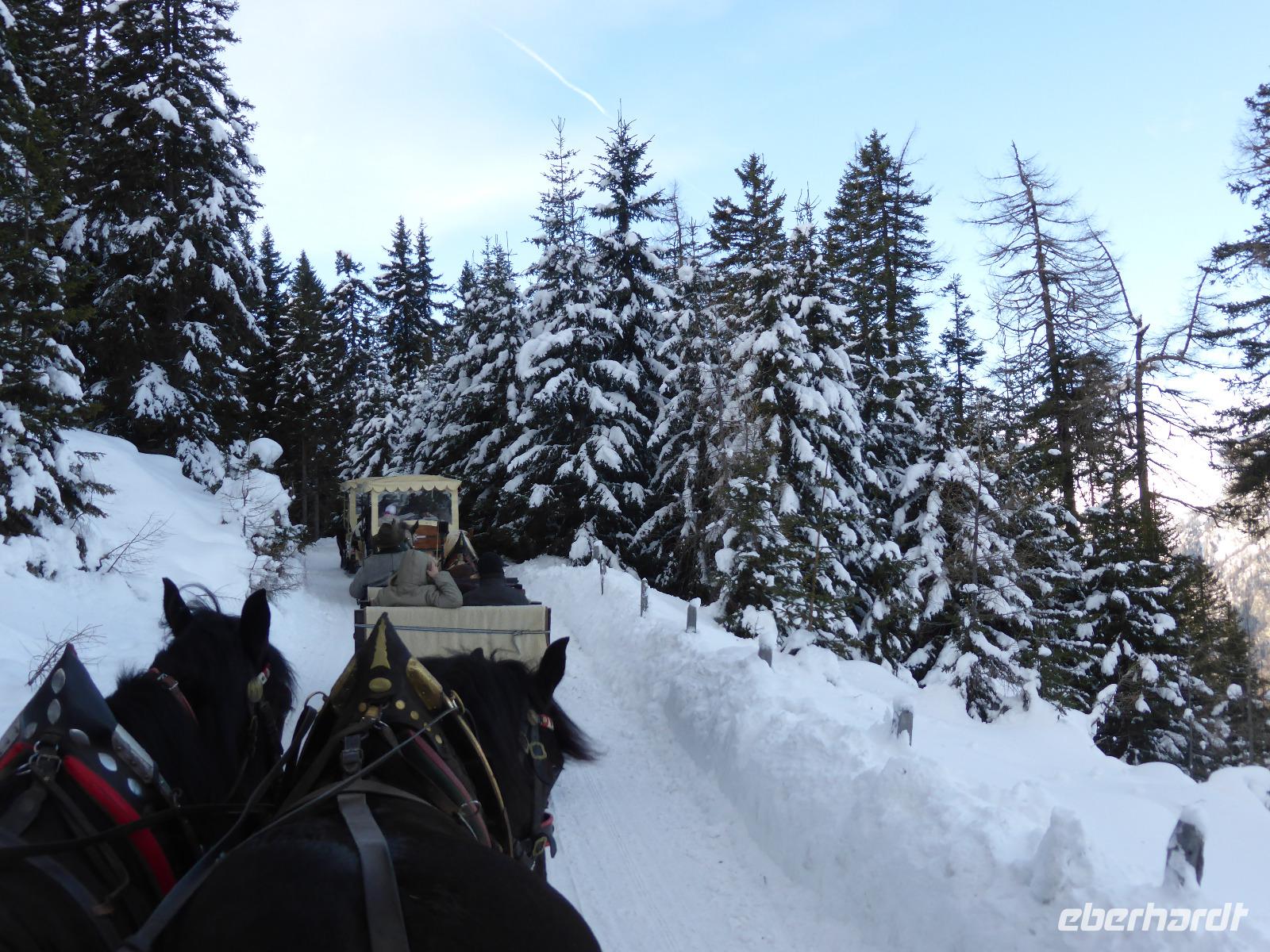 Pünktlich erschienen die Pferdekutschen. Warm zugedeckt kutschierten sie uns ca. 45 min durch einen wunderschönen Winterwald entlang des Katschberger Adventsweges zur Pritzhütte. Innerlich wärmten wir uns bei einem Schnapserl während eines Zwischenstopps auf. Angelangt in der Pritzhütte erwartete uns bereits eine deftige Kärtner Brettljause - lecker. Auf der Rückfahrt genossen wir nochmals den Winterwald sowie die Aussicht auf die umliegenden Berge.