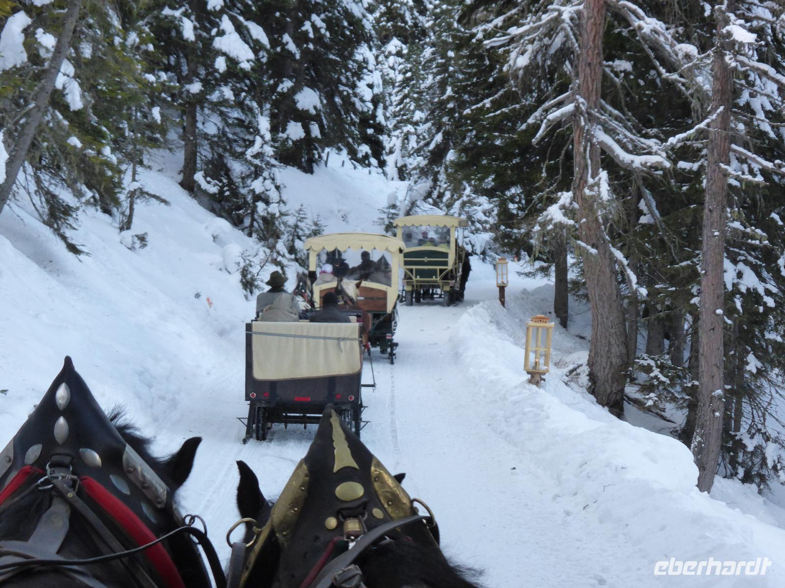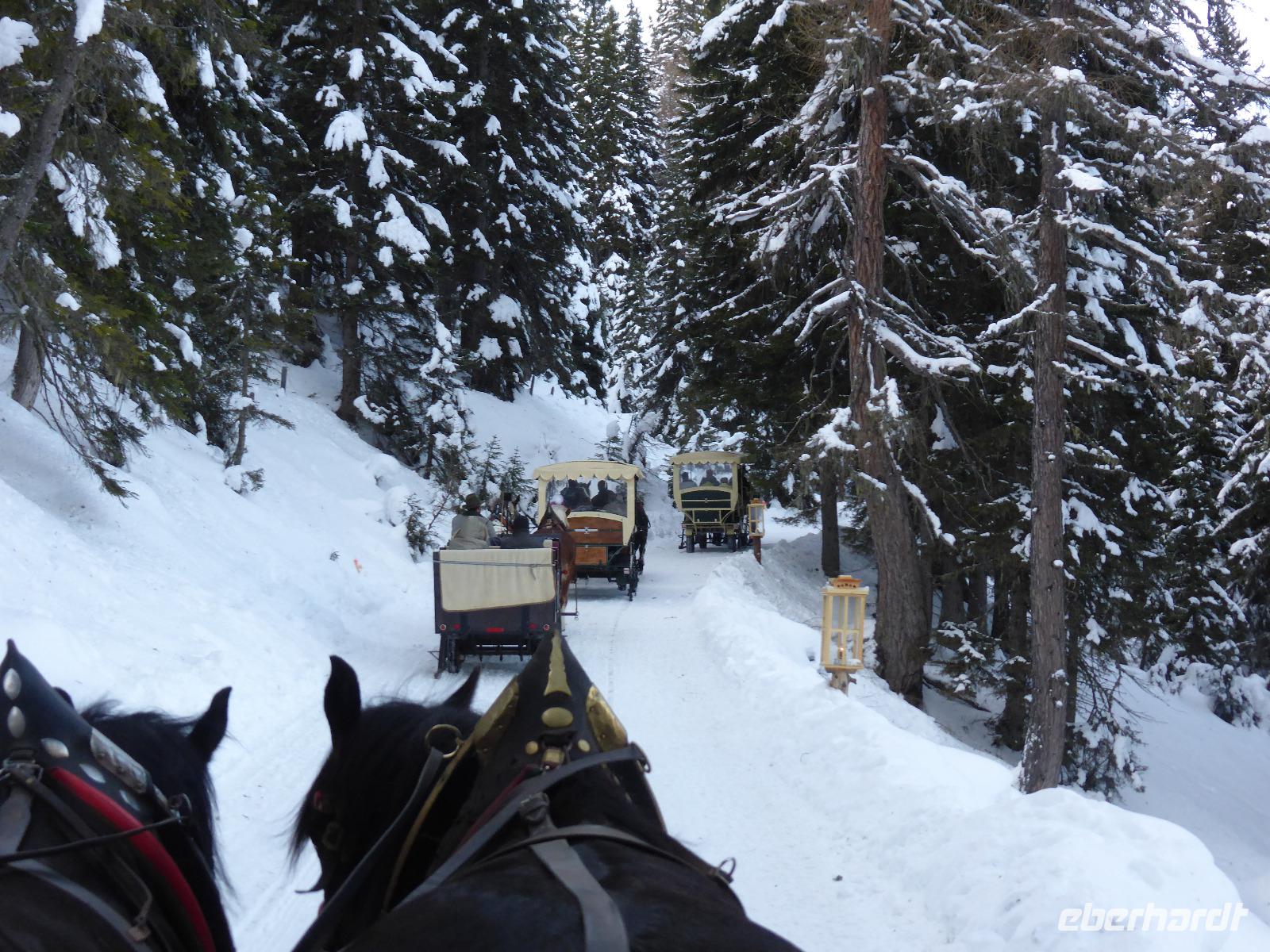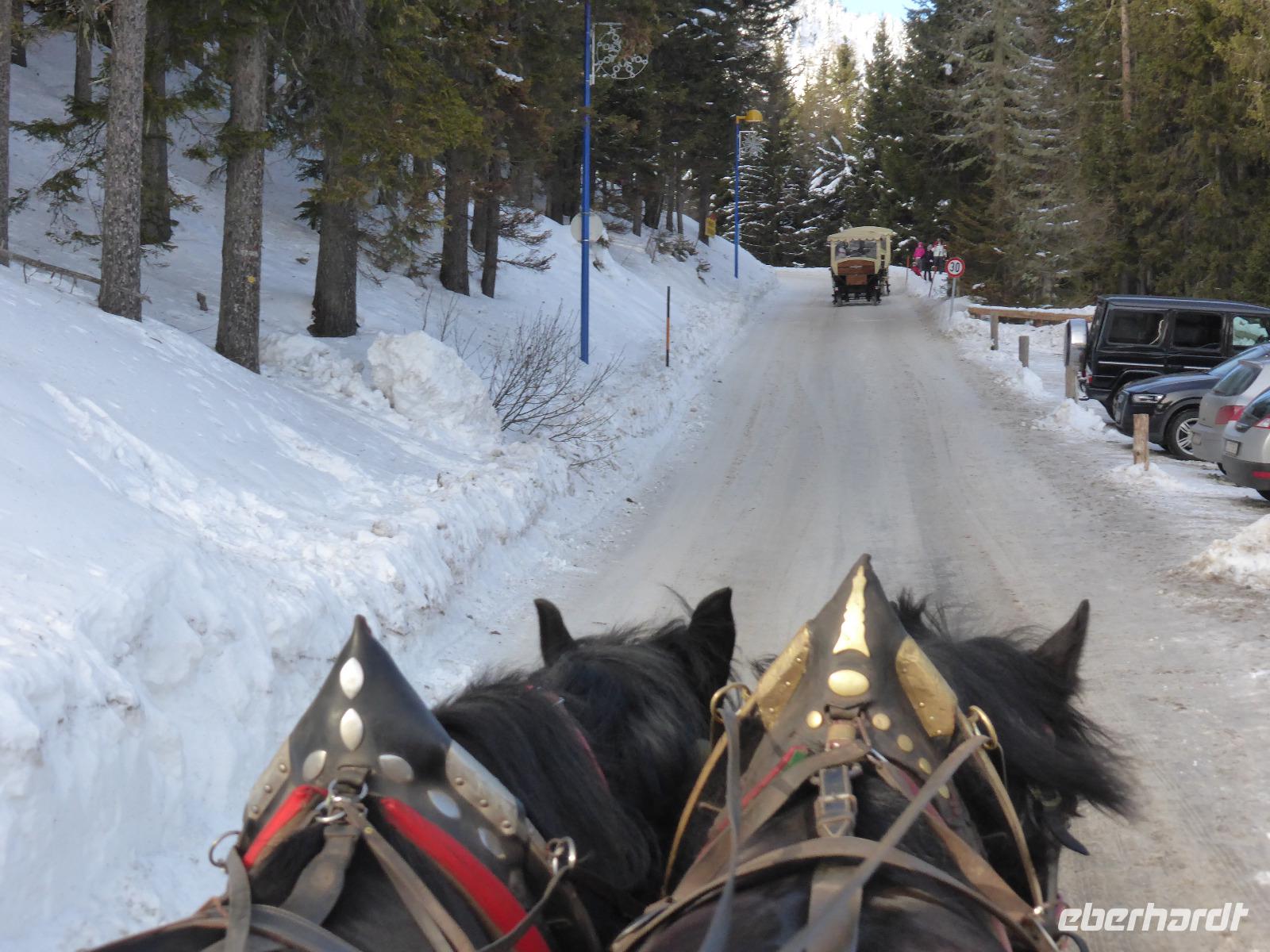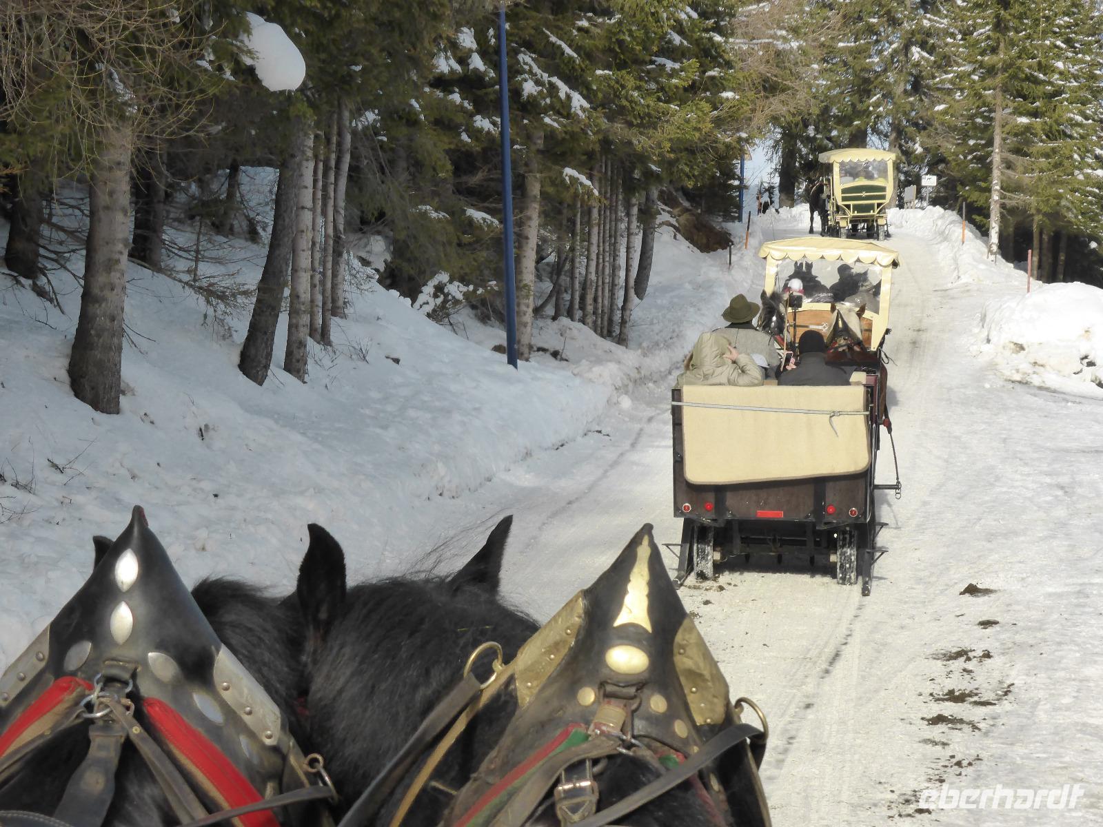 Pünktlich erschienen die Pferdekutschen. Warm zugedeckt kutschierten sie uns ca. 45 min durch einen wunderschönen Winterwald entlang des Katschberger Adventsweges zur Pritzhütte. Innerlich wärmten wir uns bei einem Schnapserl während eines Zwischenstopps auf. Angelangt in der Pritzhütte erwartete uns bereits eine deftige Kärtner Brettljause - lecker. Auf der Rückfahrt genossen wir nochmals den Winterwald sowie die Aussicht auf die umliegenden Berge.