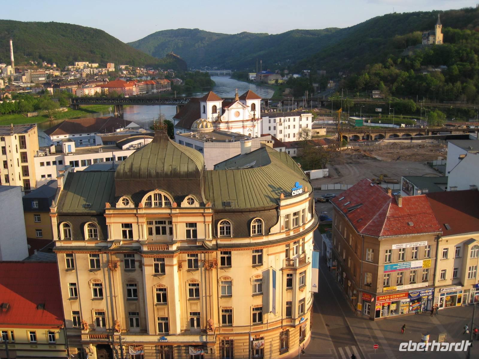 Der Weg führte uns über die Benesbrücke - die am 31.Juli 1945 traurige Berühmtheit erlangte, als man Usti entgermanisierte - zum Wohnviertel Strekov, wo offenkundig nicht die Privilegiertesten wohnen. Nach dem Hochwasser von 2002 wurden die Wände bis zur Höhe der zweiten Etage mit einen zarten Rosa überzogen; darüber bleibt der verrusste Putz alter Gebäude eines Industriestandortes.