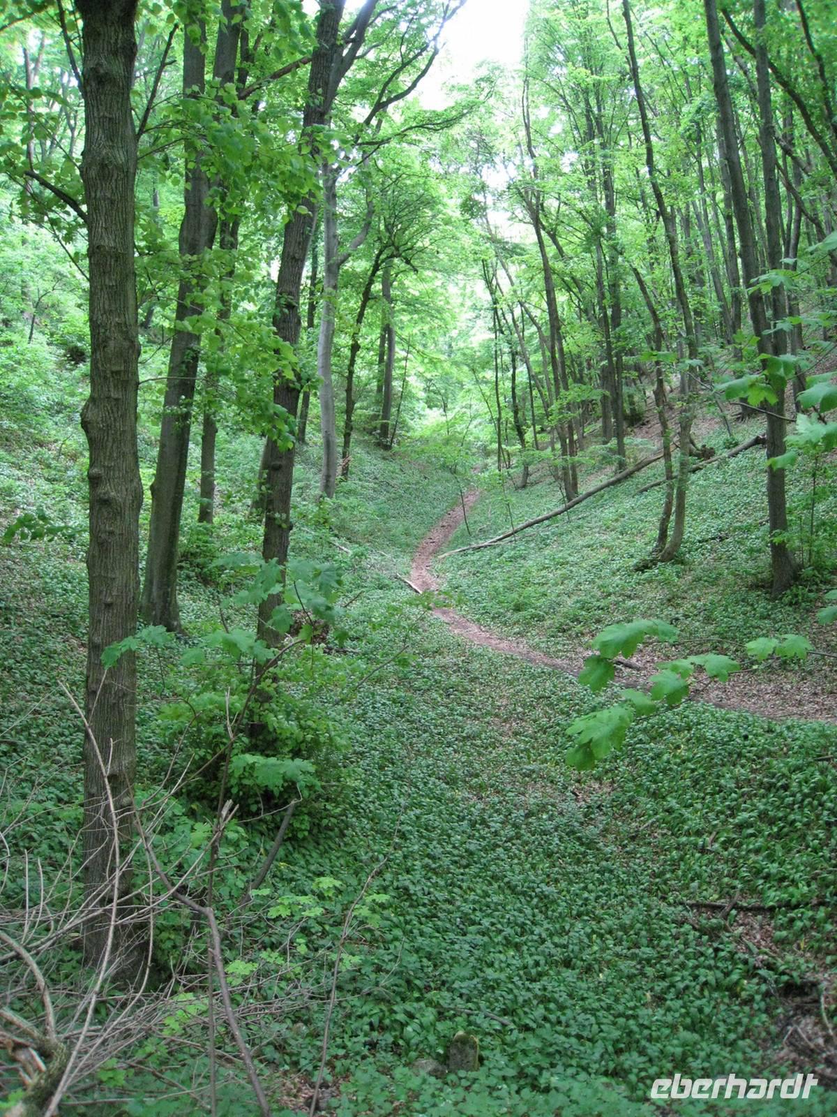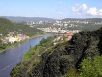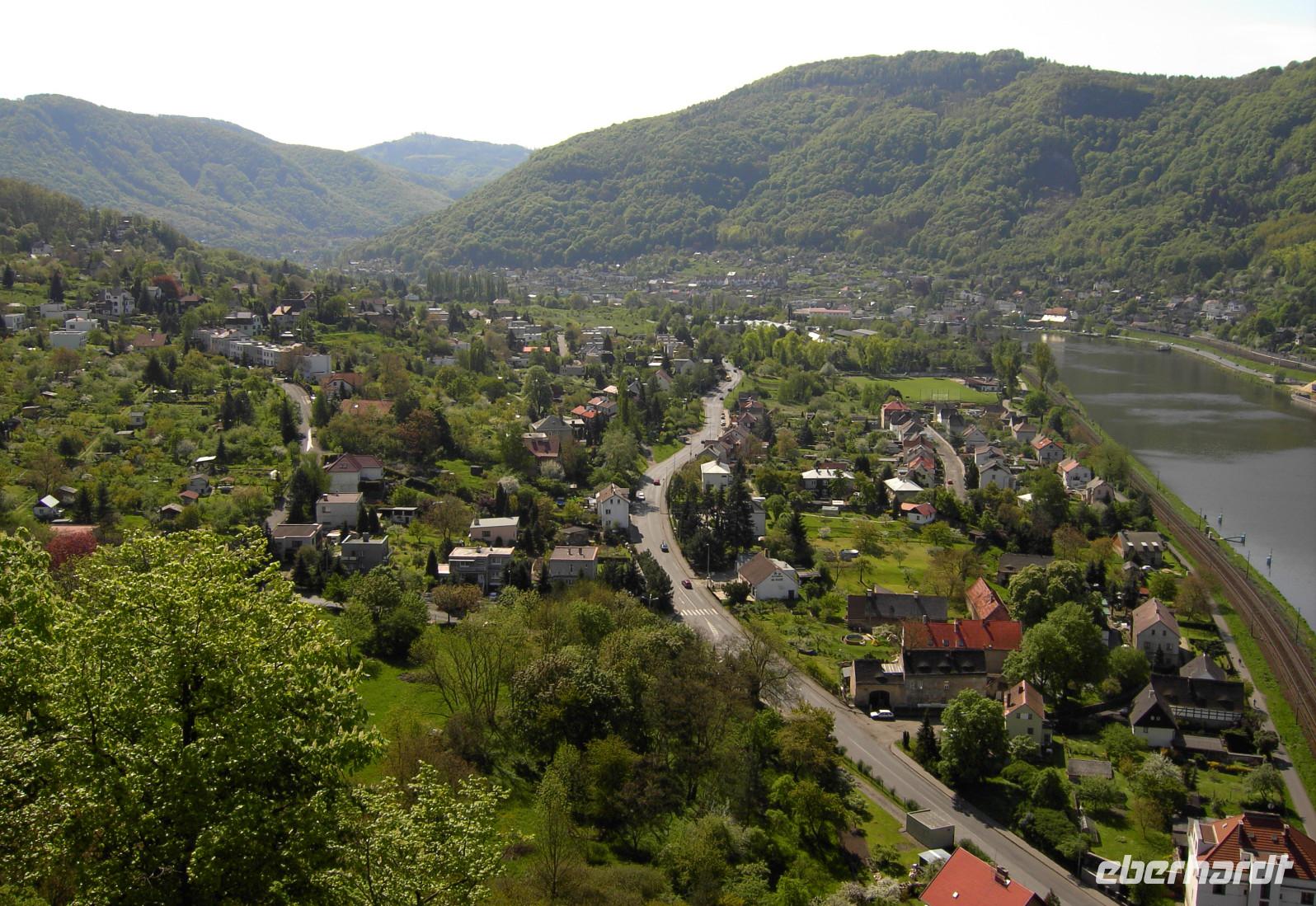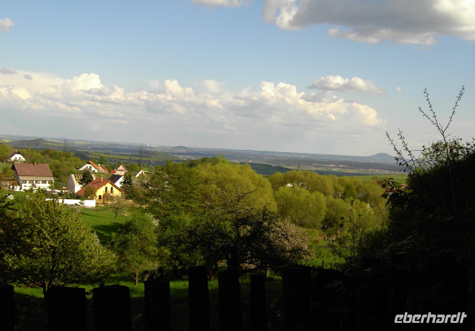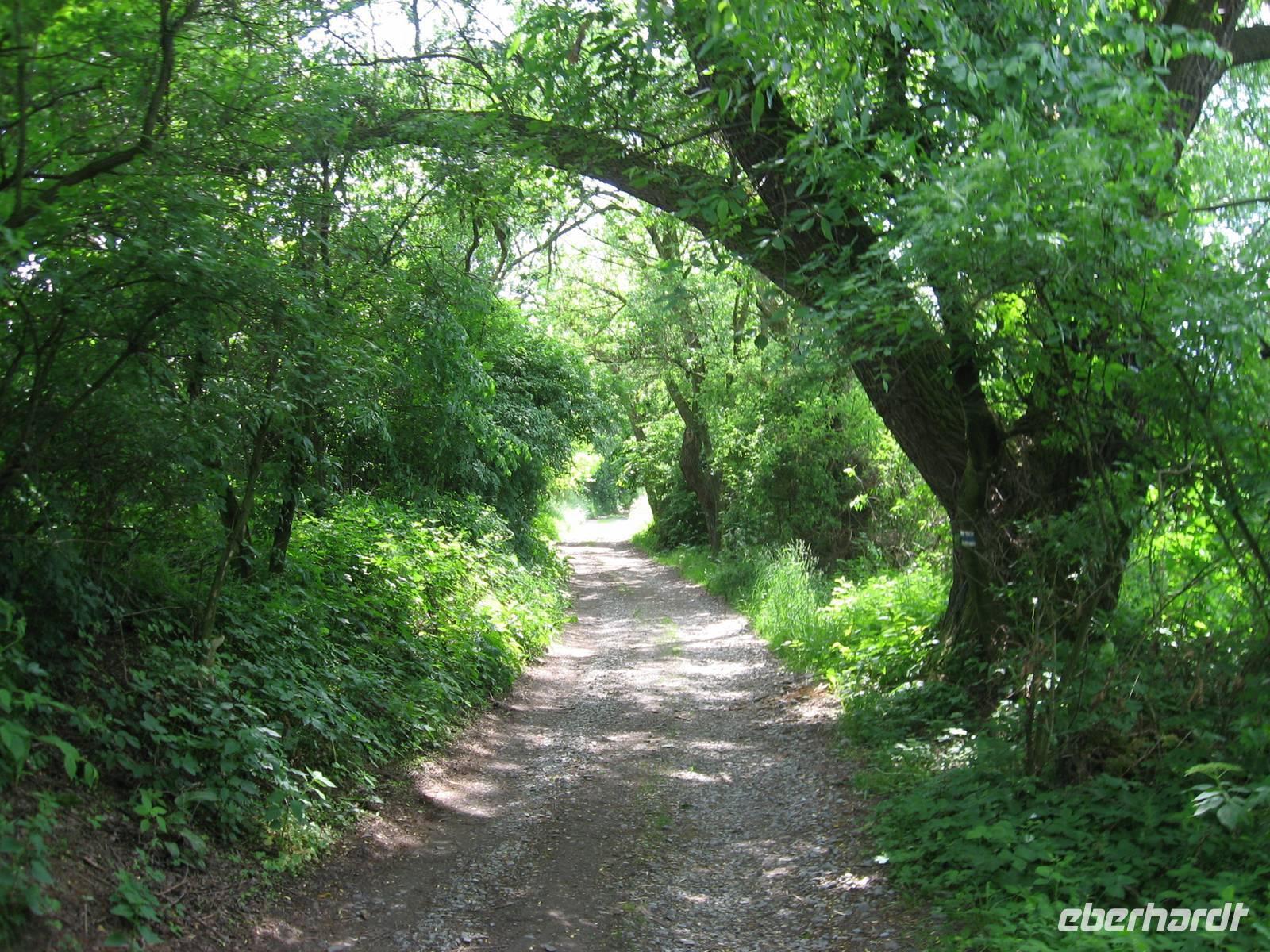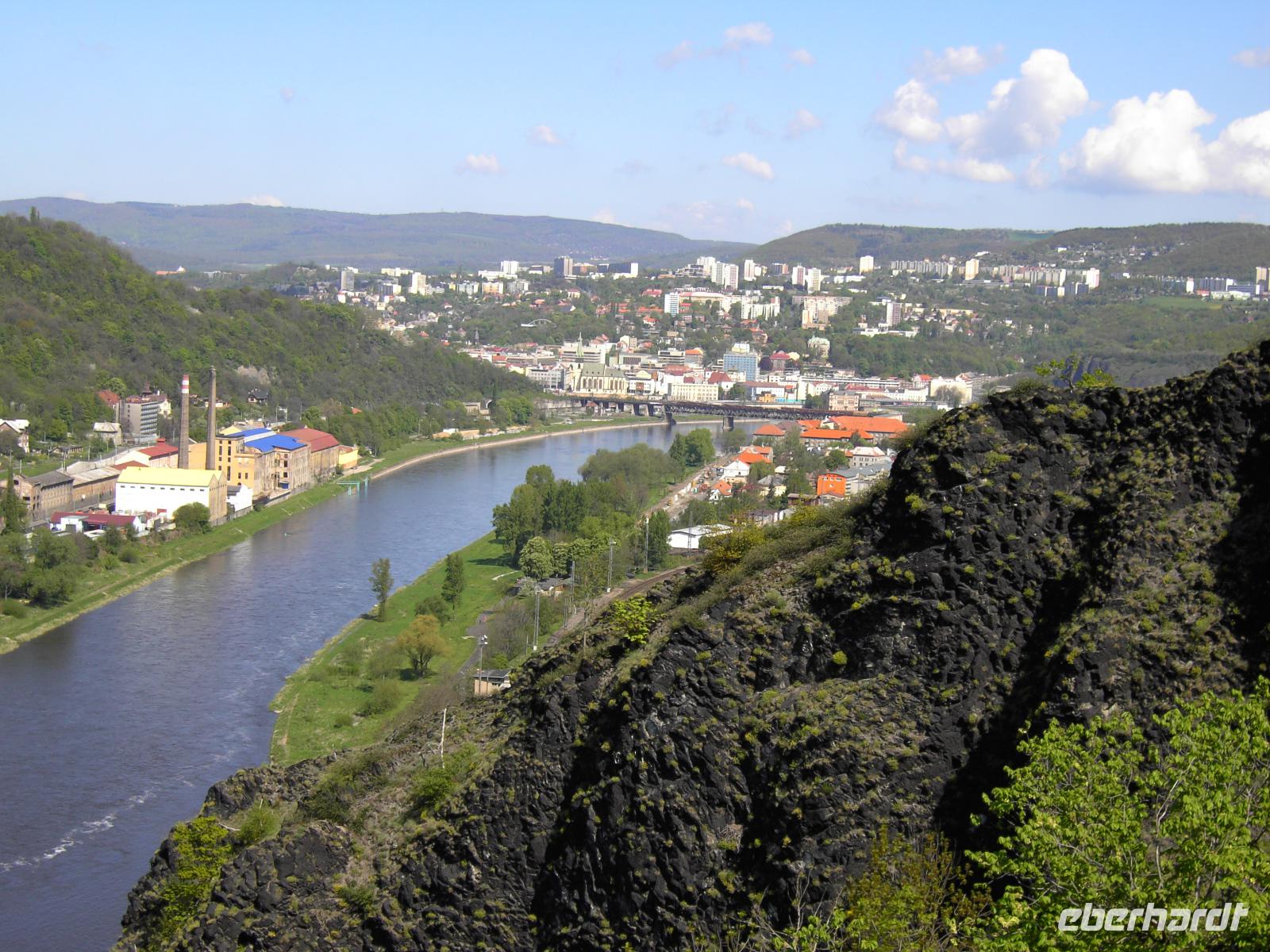Ab Bahnhof Strekov führt der rotmarkierte Weg in 20 km bis nach Litomerice. Es ging steil hinauf auf den Schreckenstein, von wo aus man die Stelle der Überfahrt , die Adrian Ludwig Richter 1837 malte, sehr gut erahnen kann. Meist durch Mischwald, im wahren Sinne der Wortbildung in lindgrünen Farben, zog sich der Weg über einige Gipfel in mehr als 600 m Höhe.