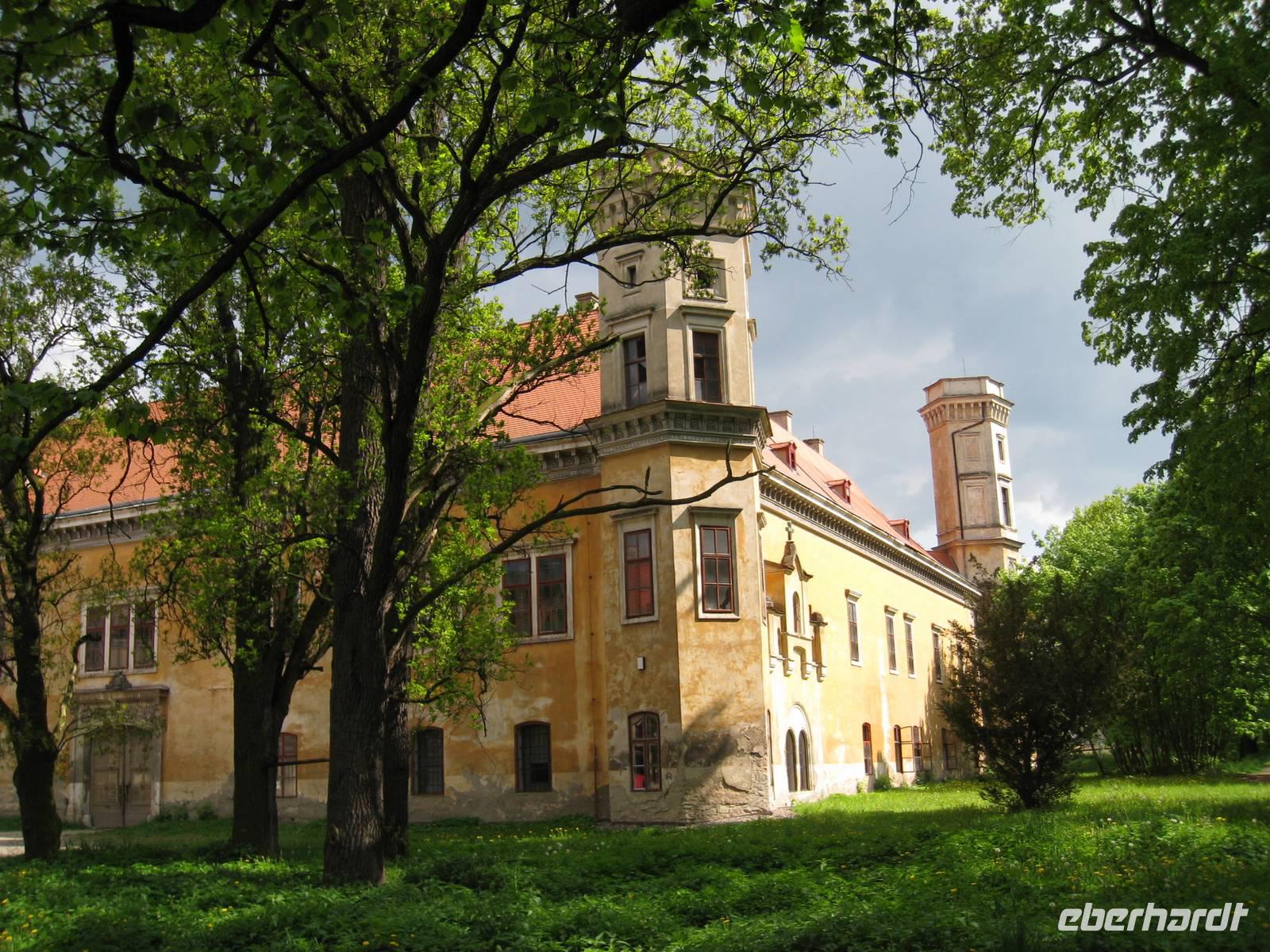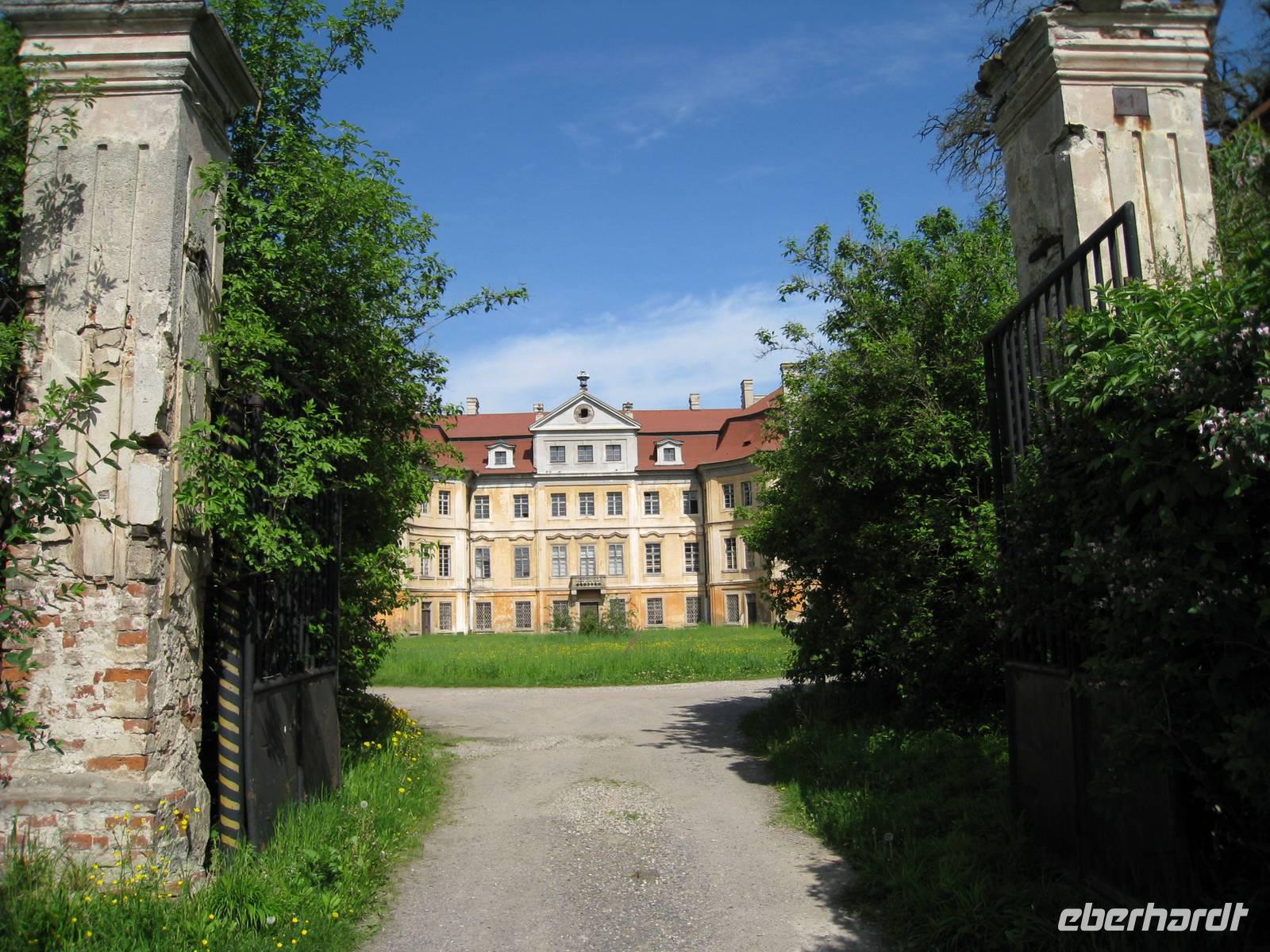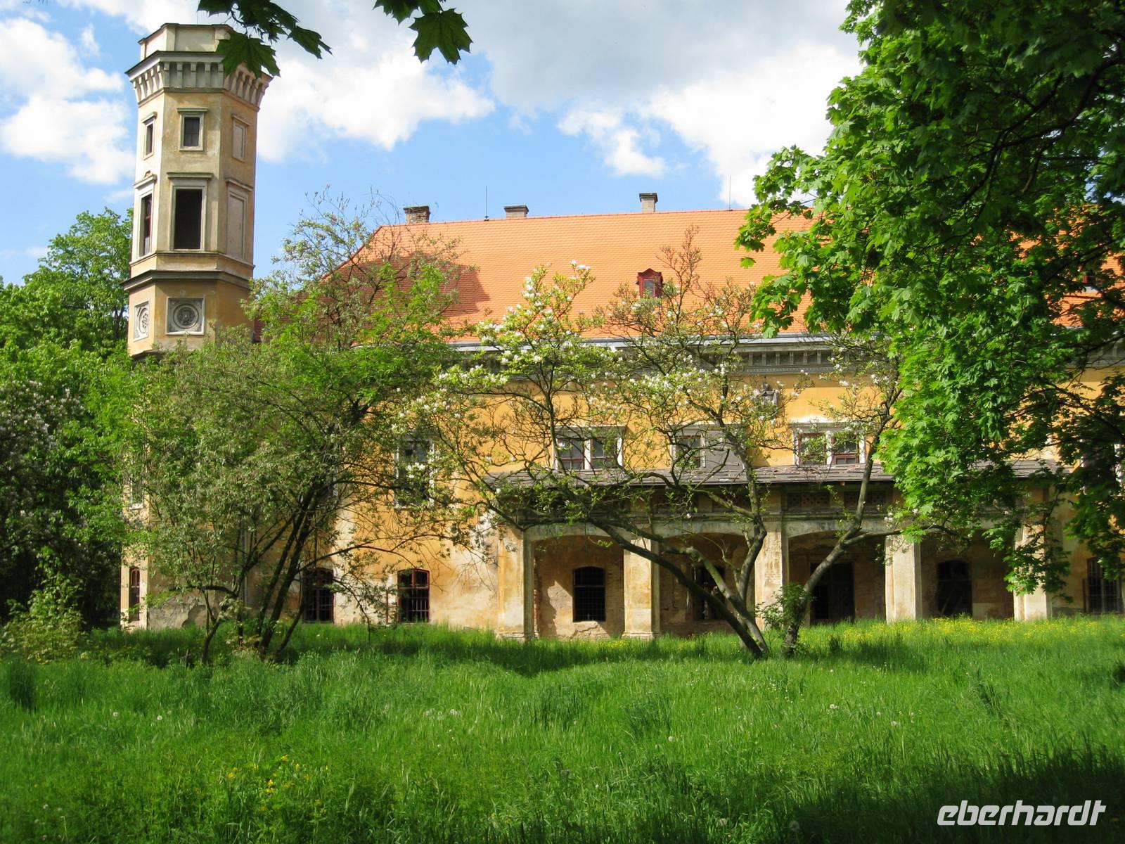 ("Ich freute mich, als ich hinter Lowositz in Böhmen auf die Ebenen kam, und hoffte nun einen beträchtlichen Grad von Wohlstand und Kultur zu finden, da der Boden rund umher außerordentlich fruchtbar zu sein schien. Aber meine Erwartung wurde traurig getäuscht. Die Dörfer lagen dünn, und waren arm; noch mehr als in dem Gebirge. Man drosch in den Herrenhöfen auf vielen Tennen und die Bauernhäuser waren leer und verfallen")Unweit der dominierenden Industrieanlagen bei Dolny Berkovice entdecken wir ein 1606 zum Renaissanceschloss umgebautes Anwesen, das nun wieder dem Hause Lobkovitz - Thurn und Taxis gehört. Der Herrenhof liegt in einem Park mit alten Bäumen. In den Tennen der Seitengebäude wohnen Menschen, einfache Wäsche hängt zum Trocknen im dahinbröckelnden Verbindungsgang, der schon bessere Zeiten gesehen hat. Nach den Herrenhöfen Seumes sieht dies nicht aus.