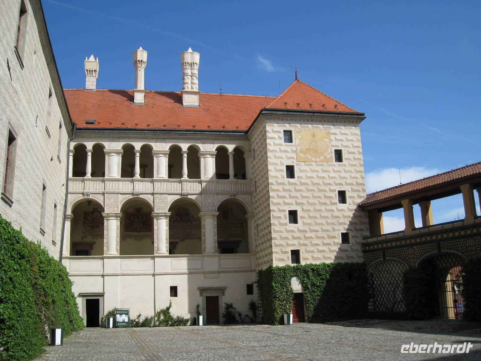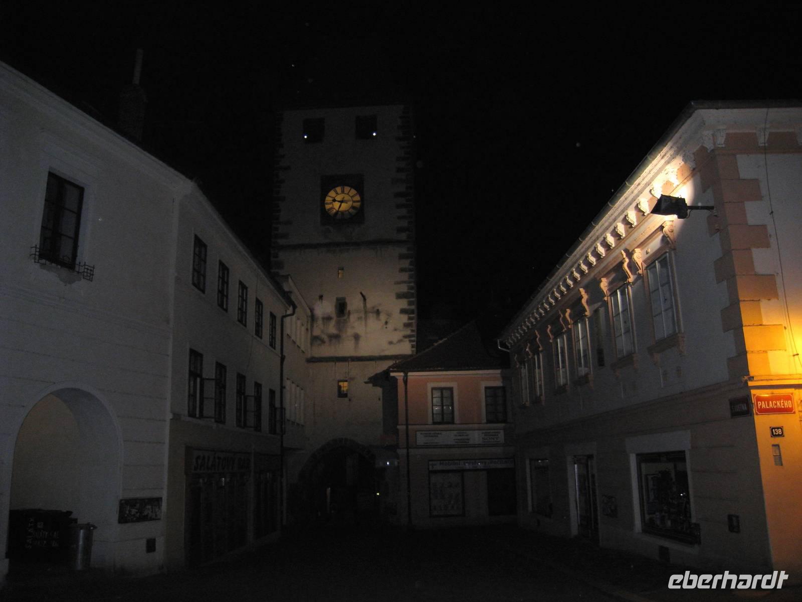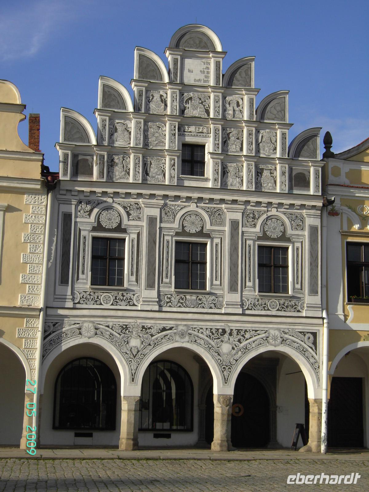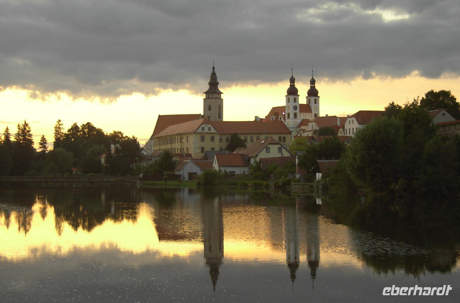 ... Diese hübsche kleine Burg mit Turm, scheinbar immer ordentlich erhalten, erhebt sich auf einer Hügelkette ca. 10 km nördlich von Telc. Vom Turmausblick in die hügelige Landschaft ist Telc nur zu erahnen.Nach einer reichlichen Stunde des Abstiegs öffnet sich die Landschaft so wie die Hügel gerade den Blick nicht verdecken und inmitten von Wiesen und Teichen blinkt Telc ein wenig hervor. An Teichen und dem Stadtgraben vorbei geht es durch ein Tor am Schloss vorbei zum Marktplatz. Die Innenstadt ist Weltkulturerbe. Der Markt mit mehr als 100 bestens restaurierten Renaissance-Gebäuden leuchtet in der Spätnachmittagssonne. Der Marktbereich von 300 mal 100 m ist völlig umsäumt von bestens erhaltenen Gebäuden mit kleinen Kolonaden, Aufbauten und Umbauten aus der Zeit des Barock. Leider dürfen zeitgemäß Autos über die Südseite des Marktes fahren und parken.