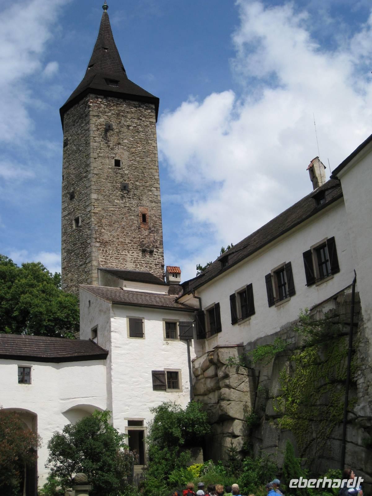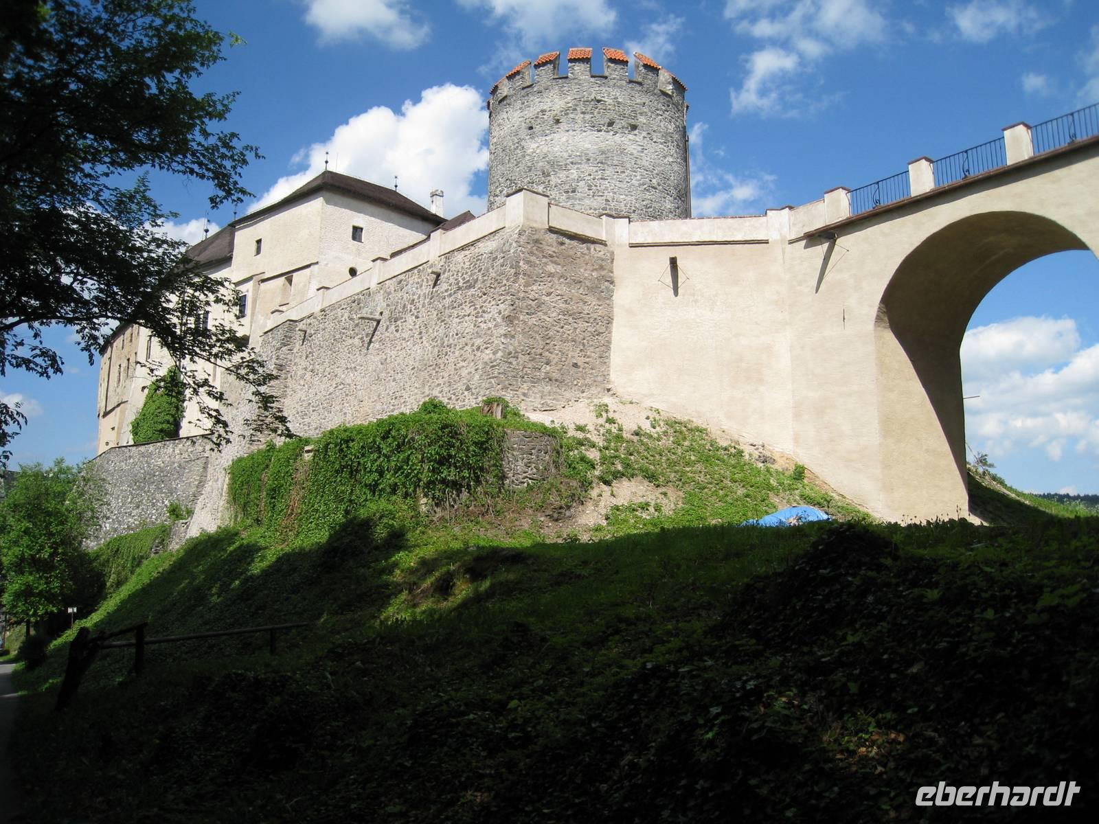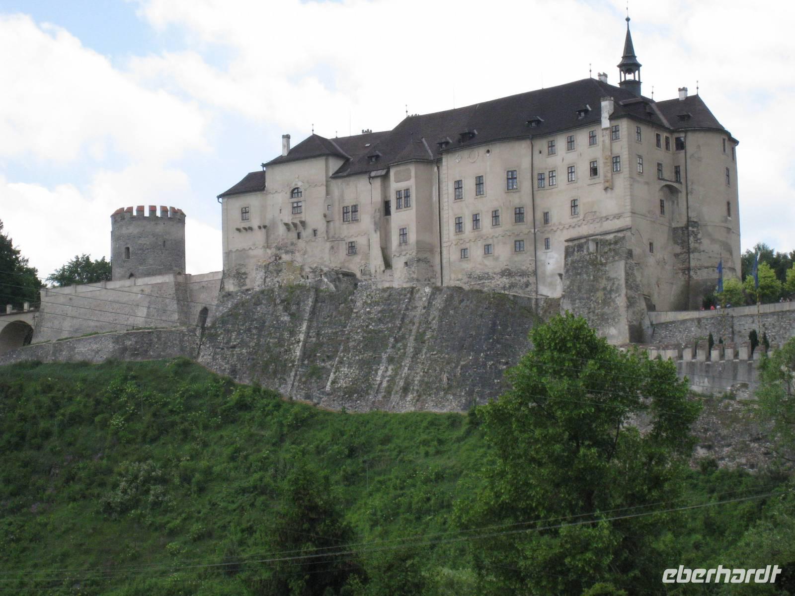Abwärts und wieder aufwärts geht es nun meist oberhalb des Sazavatales, bis wir die riesige Burganlage Cesky Sternberg auf einem Felsvorsprung über der Sazava entdecken. Die Burganlage wurde im frühgotischen Baustil als eine der ersten in Stein errichtet, umgebaut und später barokaisiert. Der heutige Eigentümer Zdenek Sternberg wohnt auf der Burg und duldet geführte Besucher gegen Gebühr. Wider mancher Ablehnungen in der Gruppe entschieden wir uns für eine Besichtigung und hofften, nach Durchdringen der Tür auf weitestgehende Freiheit zum Besichtigen.Aber der Gang ist streng geregelt und so ging es in tschechischer Sprache mit 25 disziplinierten Tschechen vorbei an Jagdwaffen, Pfeiffen, Grafiken, Möbeln und Porzellan. Wir überlegten permanent, wie wir unseren vorzeitigen Ausschluss provozieren können und ich geb zu, wir machten das Bild des unangenehmen Deutschen. Nach fünfzig Minuten ist es unter bösen Blicken geschafft und unser diesjähriger Bedarf an geführten Schlossbesichtigungen in Tschechien abgedeckt.