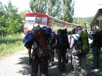 Wir gingen zur Zastavka - der Haltestelle; der Nadrazi (Bahnhof) ist weiter weg. Die Zastavka erweist sich als kleines Häuschen mit einem Wartezimmer, wie ein Wohnzimmer eingerichtet: ein Waschbecken an der Wand, Zeitschriften auf dem Tisch, Polsterstühlchen herum. Der Ticketschalter ist ganztägig besetzt. 9 Tickets auf einmal verkauft die freundliche Frau sicher selten.Die Bahnstrecke ist mit Gras bewachsen, dennoch fahren hier stündlich Züge. Es folgen vierzig Minuten lieblichste Bahnfahrt im Sazavatal bis Ledec, die Bahn schlängelt sich mit den Flussmäandern durch das Tal.