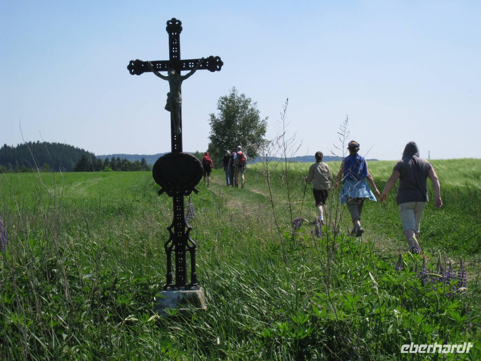 Ein schöner Waldspaziergang führt uns hinab über ausgedehnte, blühende Maiblumenwiesen zum Grenzübergang nach Böhmen.