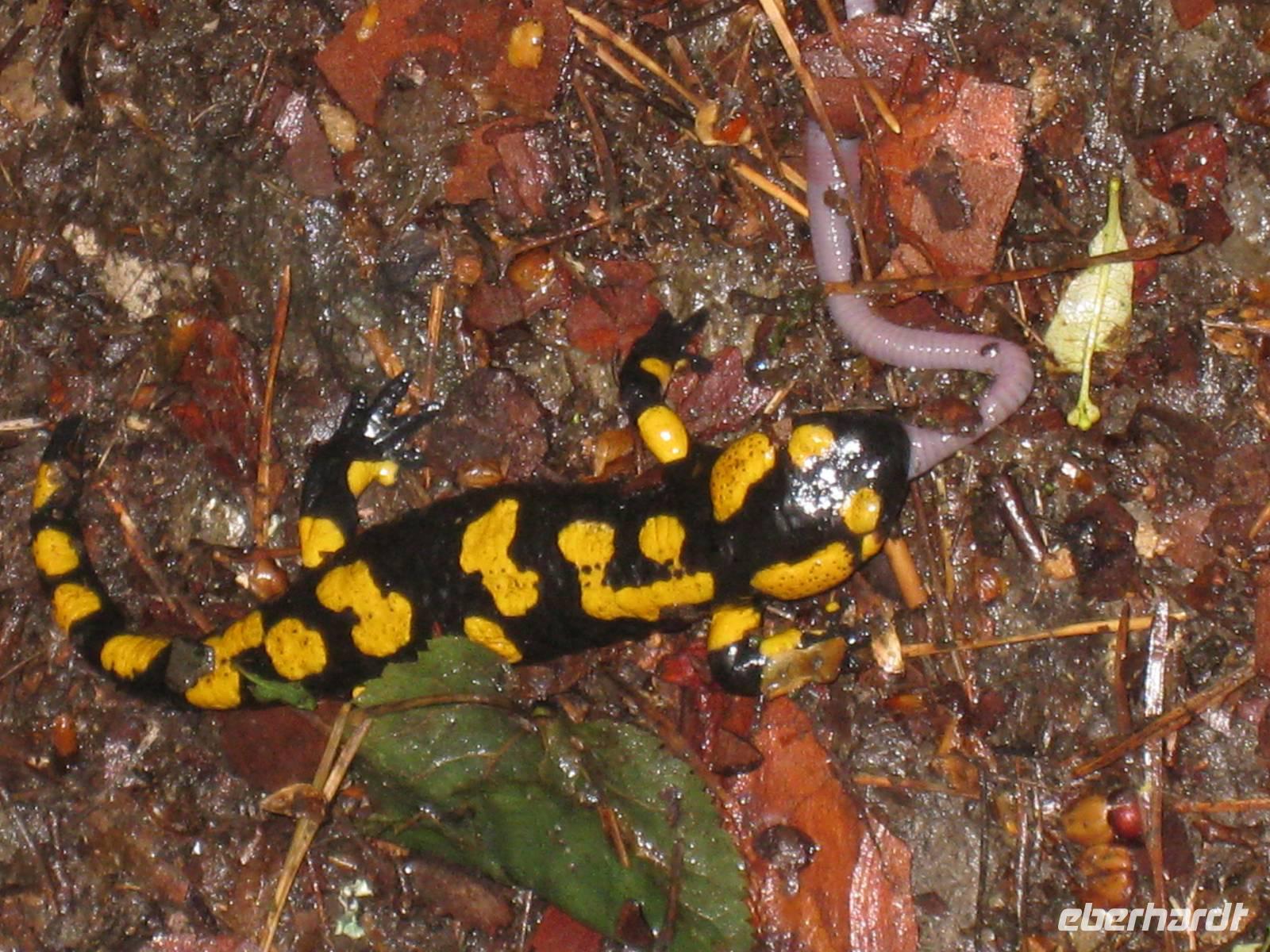 Wir starten bereits bei Regen. Entlang der Duja geht es in den Nationalpark Poduji. Zunächst am Fluss entlang geht es schon bald in ein hügeliges Laubwaldgebiet; an einigen Ecken sogar ein wenig felsig, fast alpin. Der nun permanente Regen lockt gelb-schwarz glänzende Feuersalamander auf den Weg, denen wir beim Verzehren von fetten Regenwürmern zuschauen.