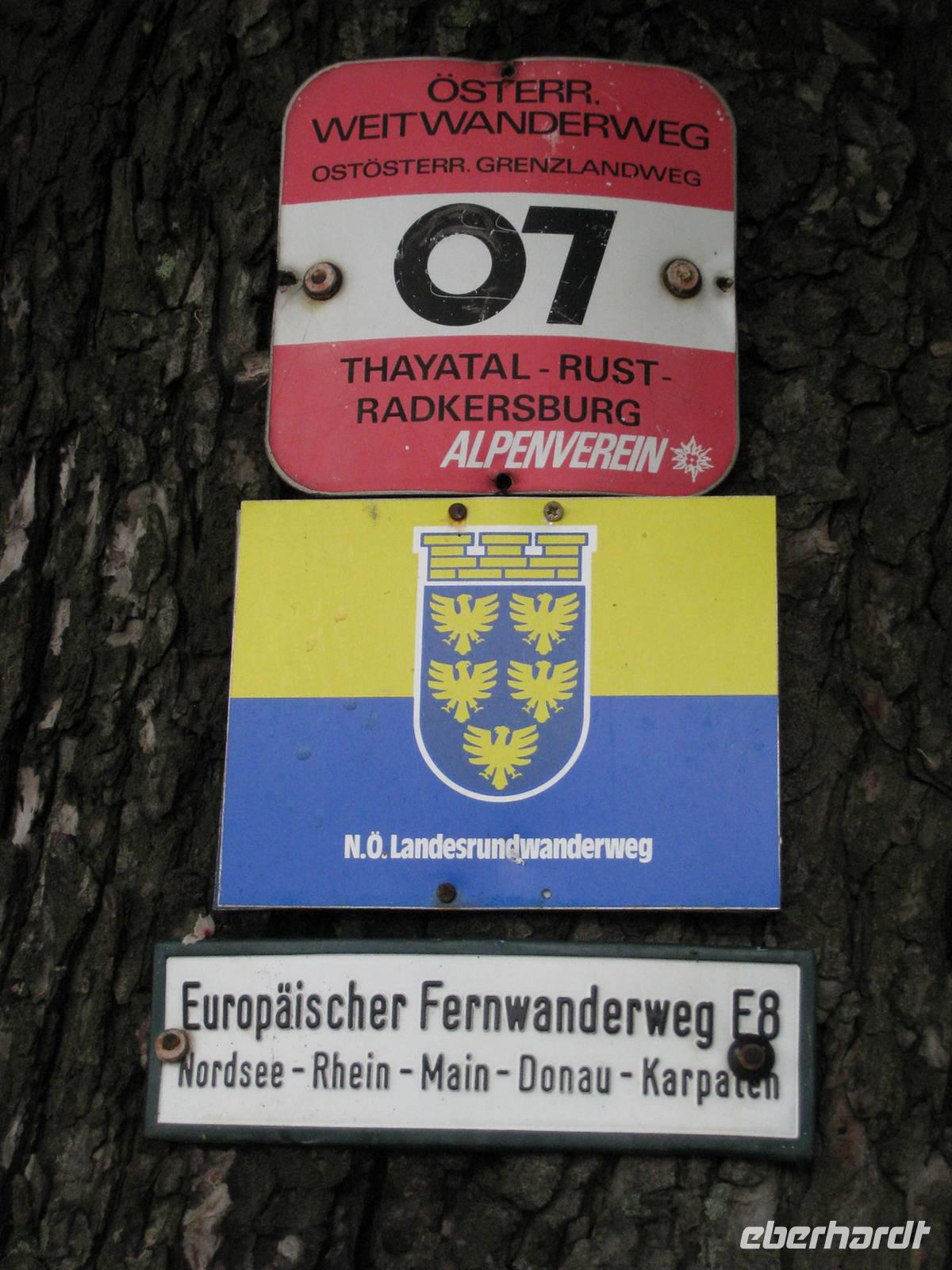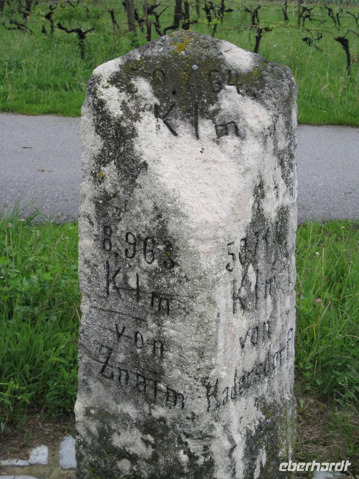 („Auf der Grenze von Mähren nach Östreich habe ich kein Zeichen gefunden; nur sind sogleich die Wege merklich schlechter als in Böhmen und Mähren, und mit den Weingärten scheint mir entsetzlich viel guter Boden verdorben zu sein. Ich nehme die Sache als Philanthrop und nicht als Trinker und Prozentist. Schlechtes Pflaster, das seit langer Zeit nicht ausgebauet sein muß, gilt für Chaussee.")Von Hnanice geht es zur Grenze: wir überqueren nun auf unserem Weg das zweite Mal eine Grenze und haben Tschechien in zwanzig Tagen durchquert. Ein alter Wegstein steht hier linksseitig - hat ihn auch Seume im Dezember 1801 schon gesehen? Parallel zur Grenze geht es nun nach Osten, überall Rebstöcke in Österreich wie auch in Mähren zur Linken. Die Wege sind nach Regen extrem matschig-pampig. Die Landschaft ist hügeliger als erwartet. Nach fünf Kilometern sind wir in Kleinretzbach, die Leute fragen nach dem Wohin unseres Weges. Eine erste Verwunderung macht sich indess bei uns breit: die Menschen sind viel freundlicher als erwartet und in manchem Österreich-Reiseführer beschrieben. Auch hier war bis 1990 vernachlässigtes Grenzgebiet und die Menschen wohl eher in ihrer Abgeschiedenheit nicht recht glücklich.